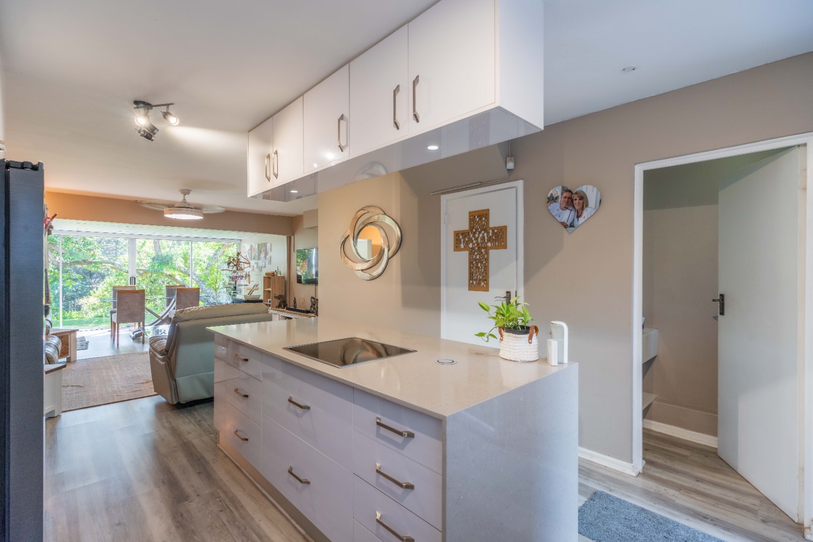 The heart of the home is the open-plan kitchen and living area, flows onto charming, covered patio, the perfect spot to relax or host and al fresco dinner. This duplex boasts serene views of a khoi pond surrounded by lush, tranquil gardens- your own private oasis of calm.
