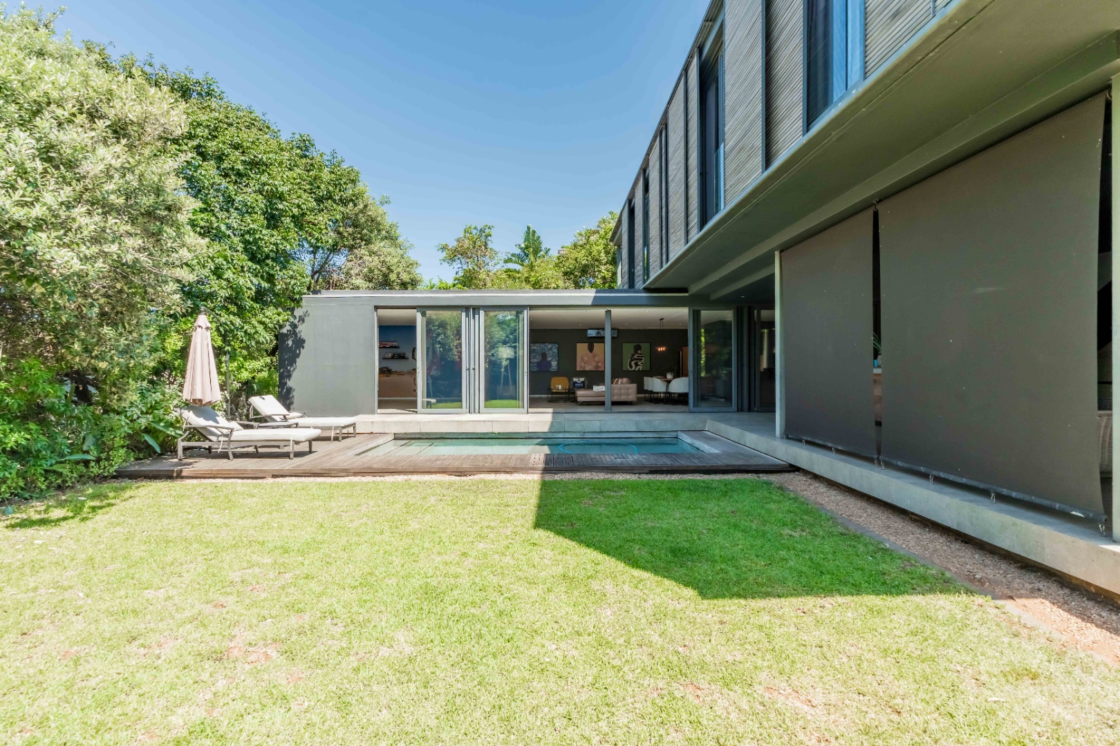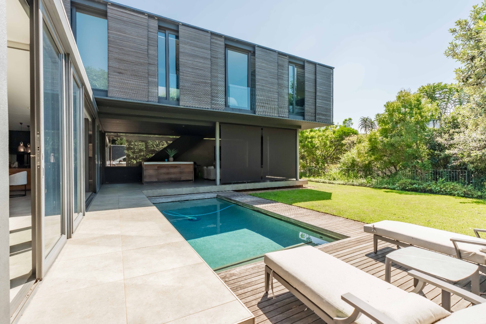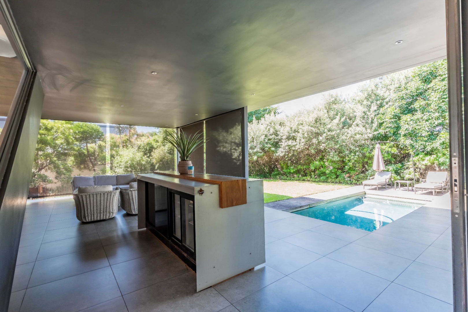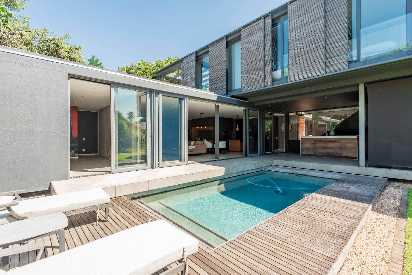 Outside, the home offers a beautiful wooden deck and sparkling swimming pool, complemented by a relaxed bar, lounge and dining area — ideal for enjoying Umhlanga’s coastal lifestyle with family and friends.