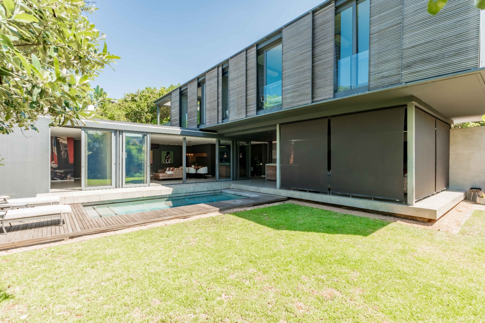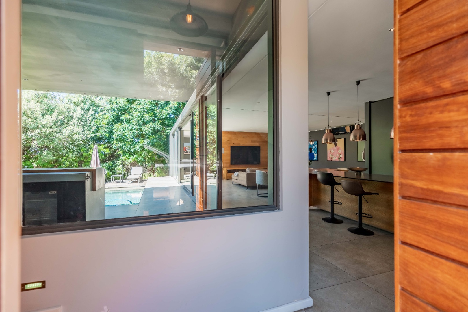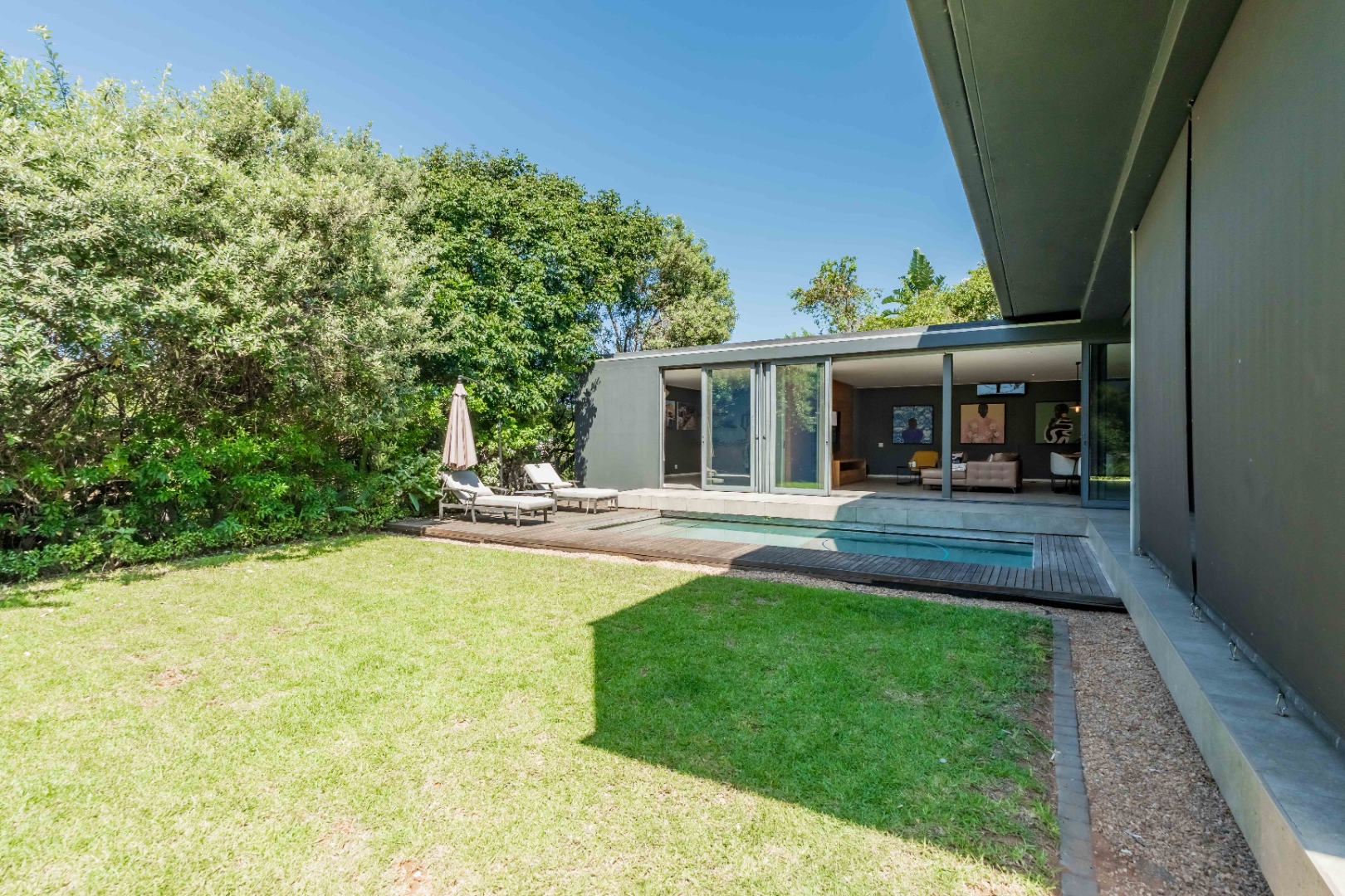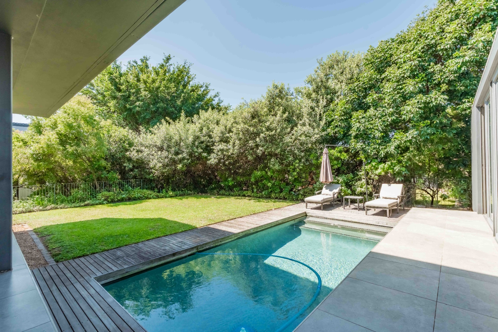 Outside, the home offers a beautiful wooden deck and sparkling swimming pool, complemented by a relaxed bar, lounge and dining area — ideal for enjoying Umhlanga’s coastal lifestyle with family and friends.