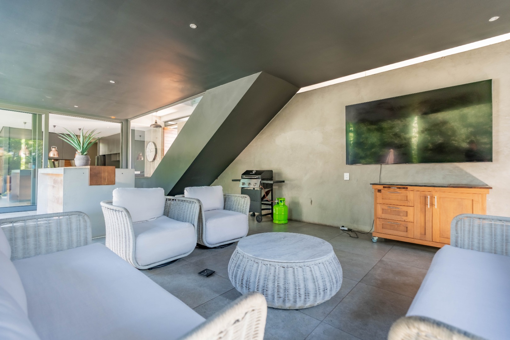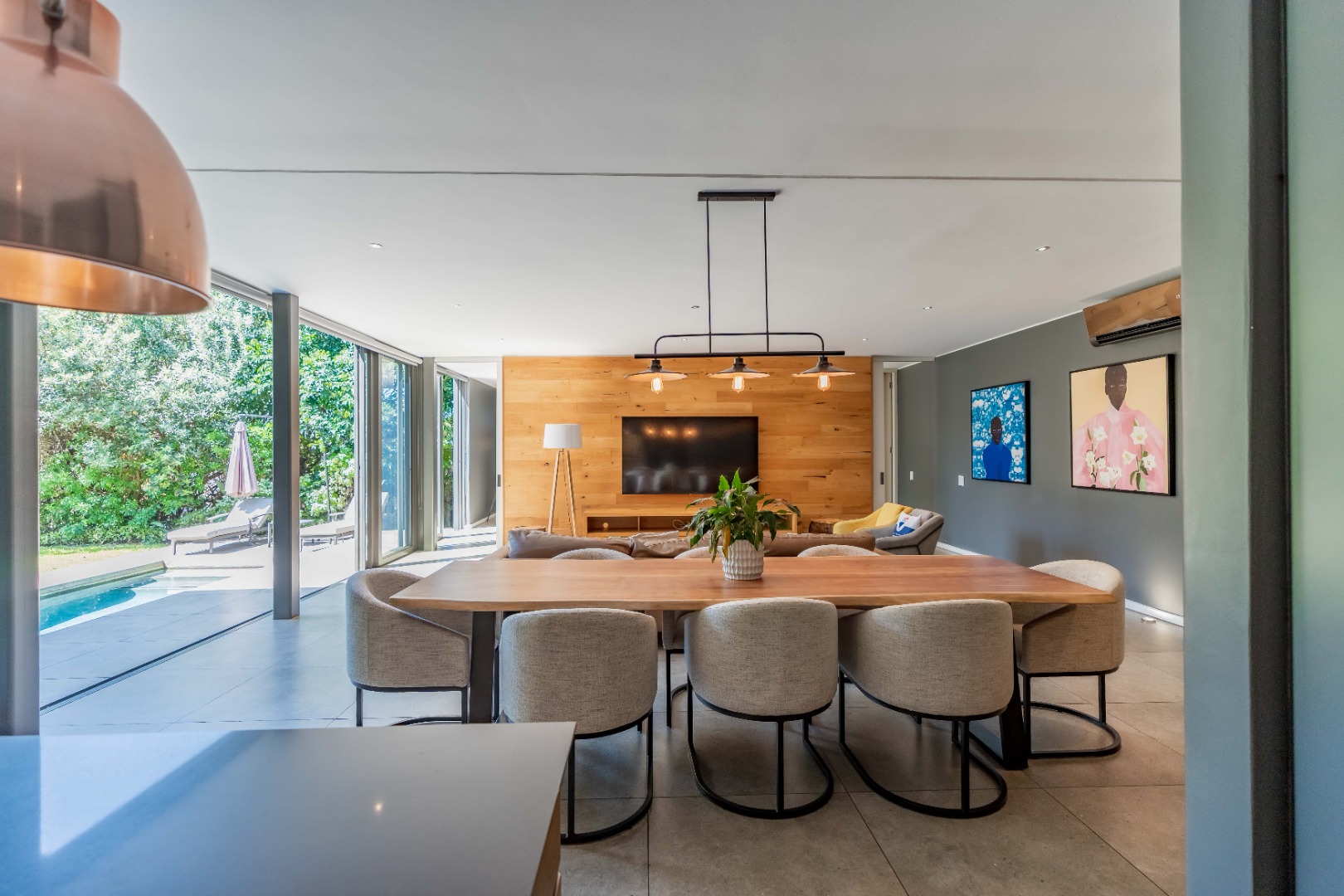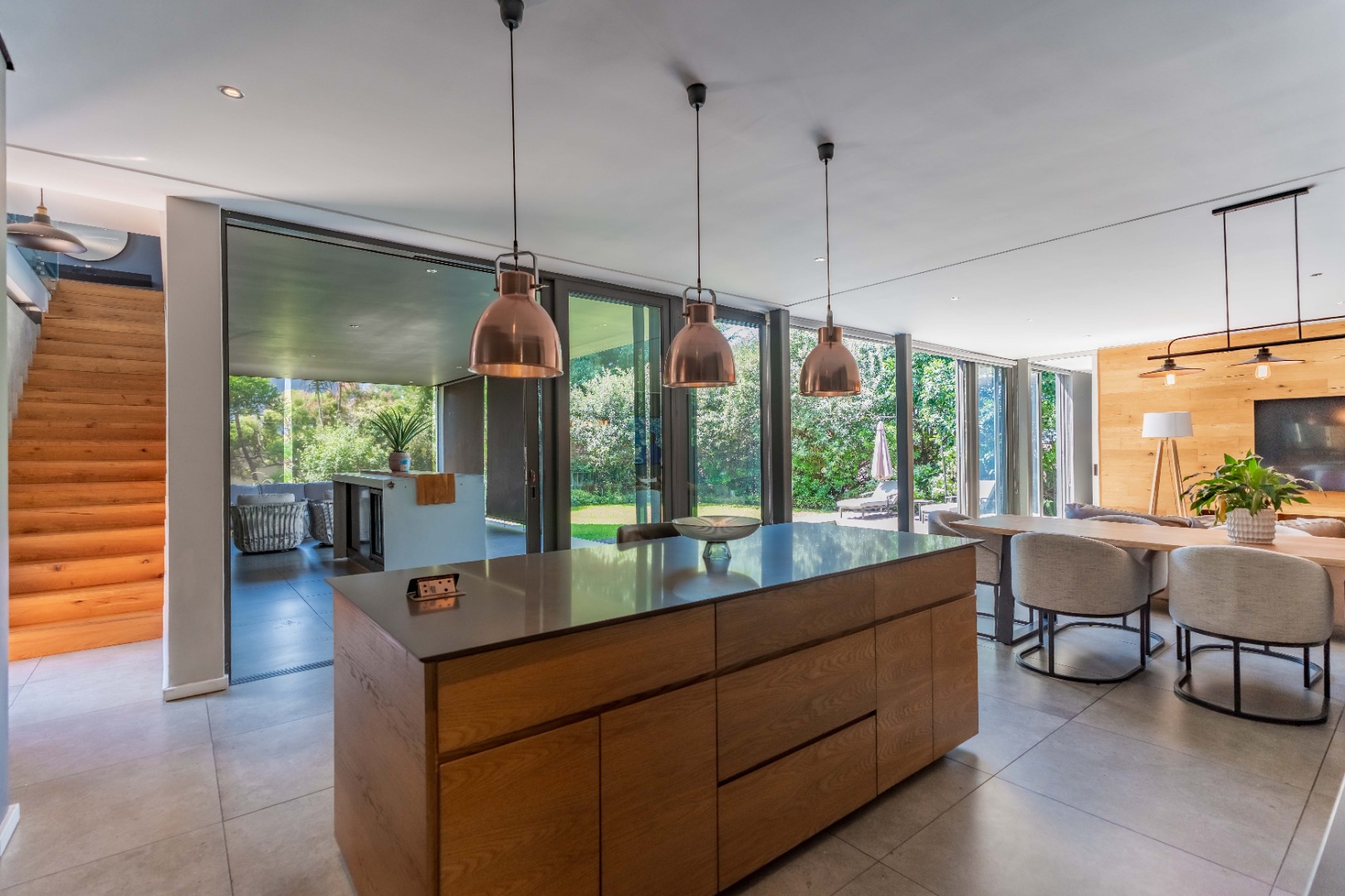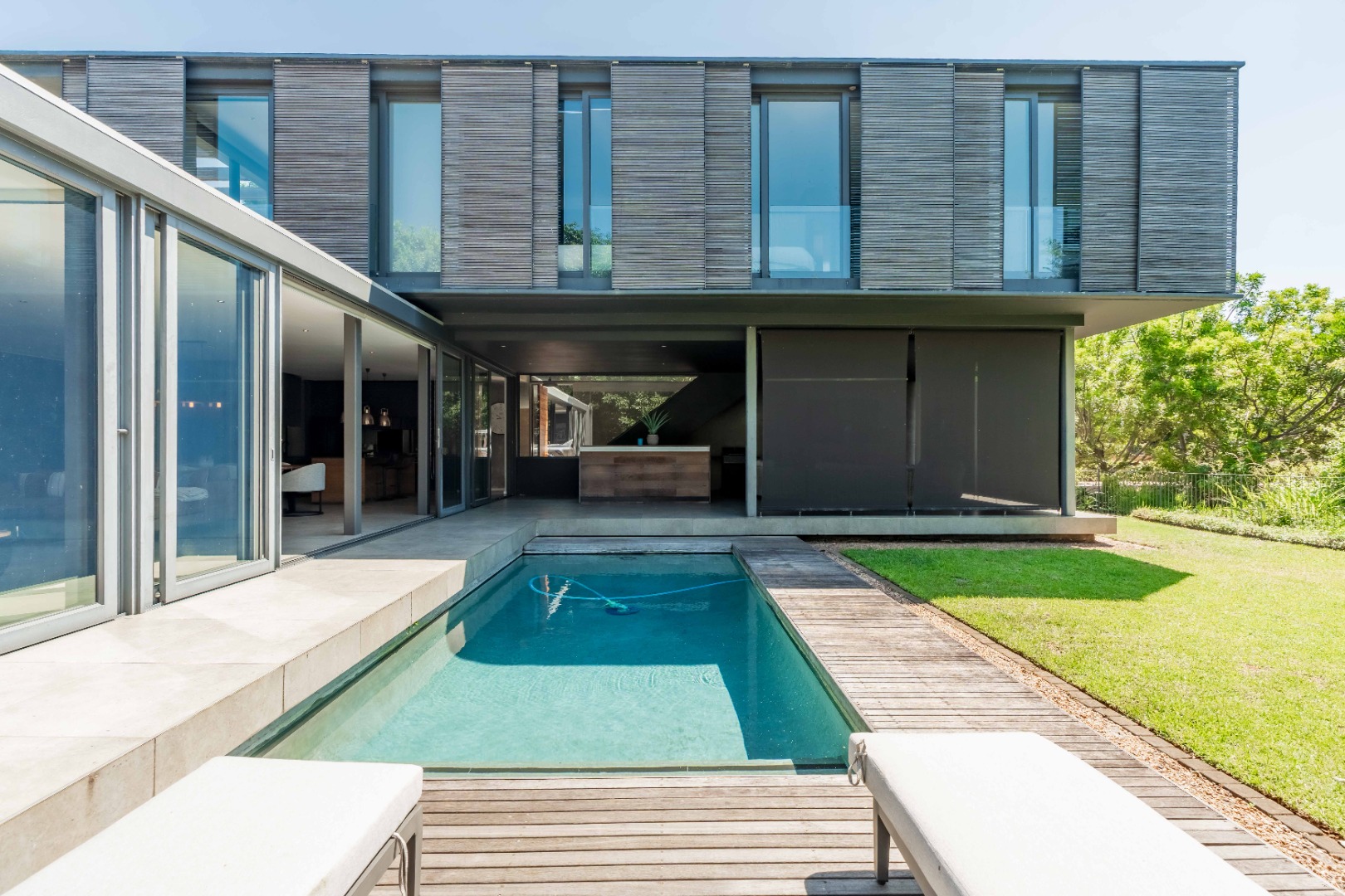 Outside, the home offers a beautiful wooden deck and sparkling swimming pool, complemented by a relaxed bar, lounge and dining area — ideal for enjoying Umhlanga’s coastal lifestyle with family and friends.