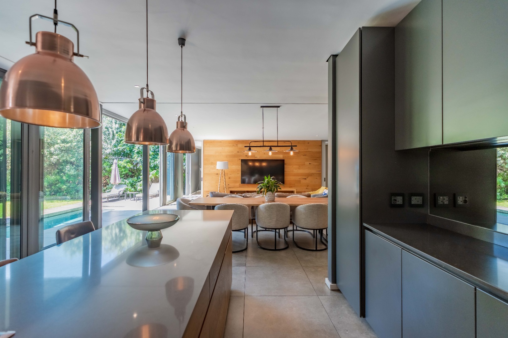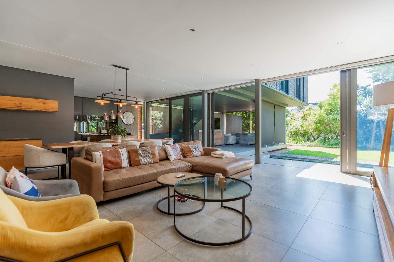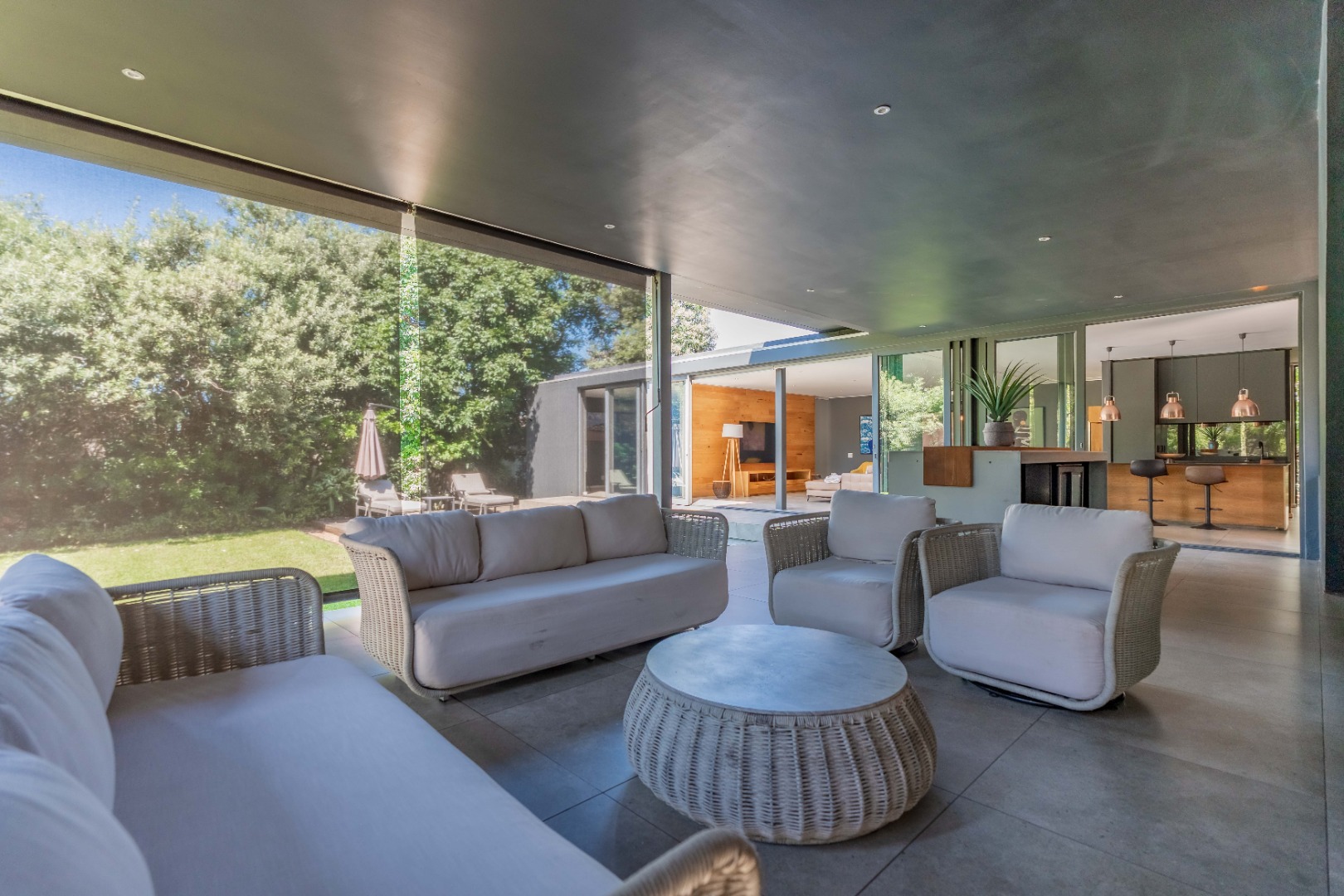 The heart of the home is a modern open-plan kitchen featuring Caesarstone countertops and a central island, seamlessly connecting to the dining and lounge areas. Large stacker doors open onto a spacious covered patio with blinds, creating the perfect setting for entertaining in every season.