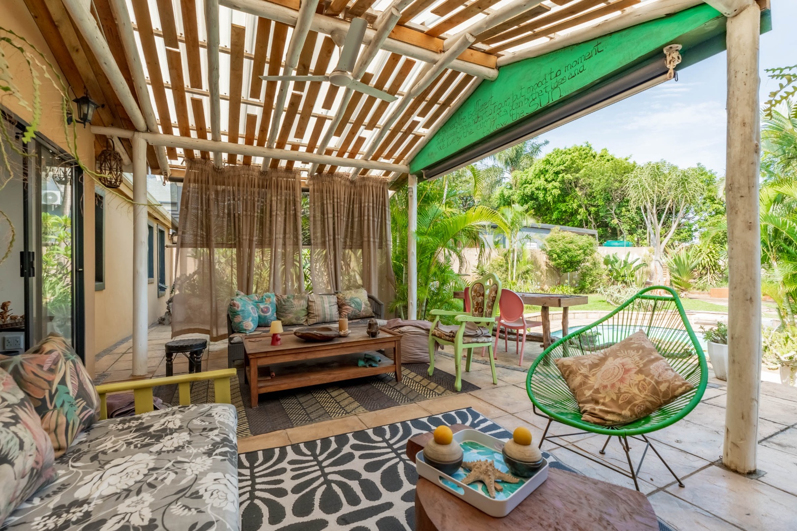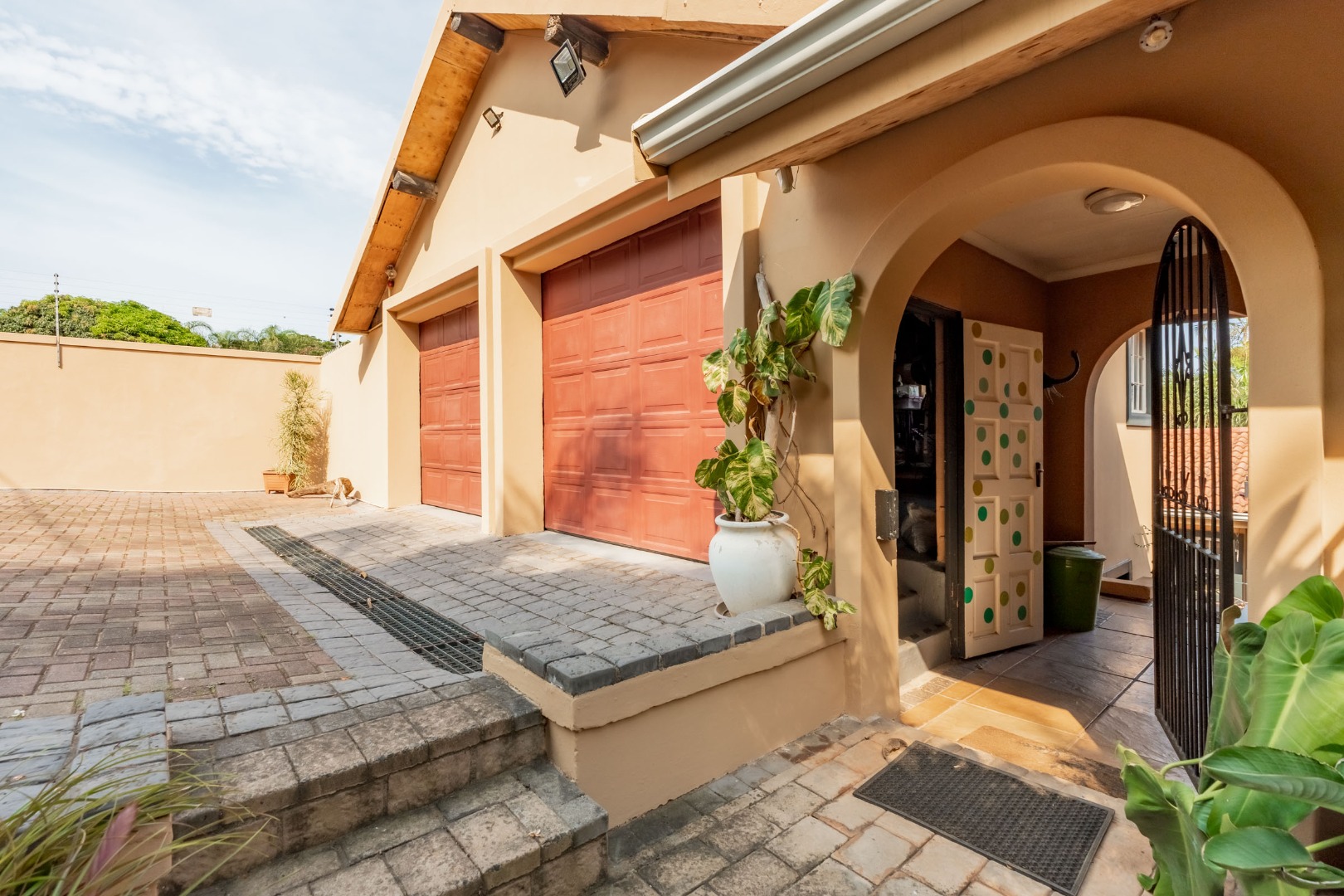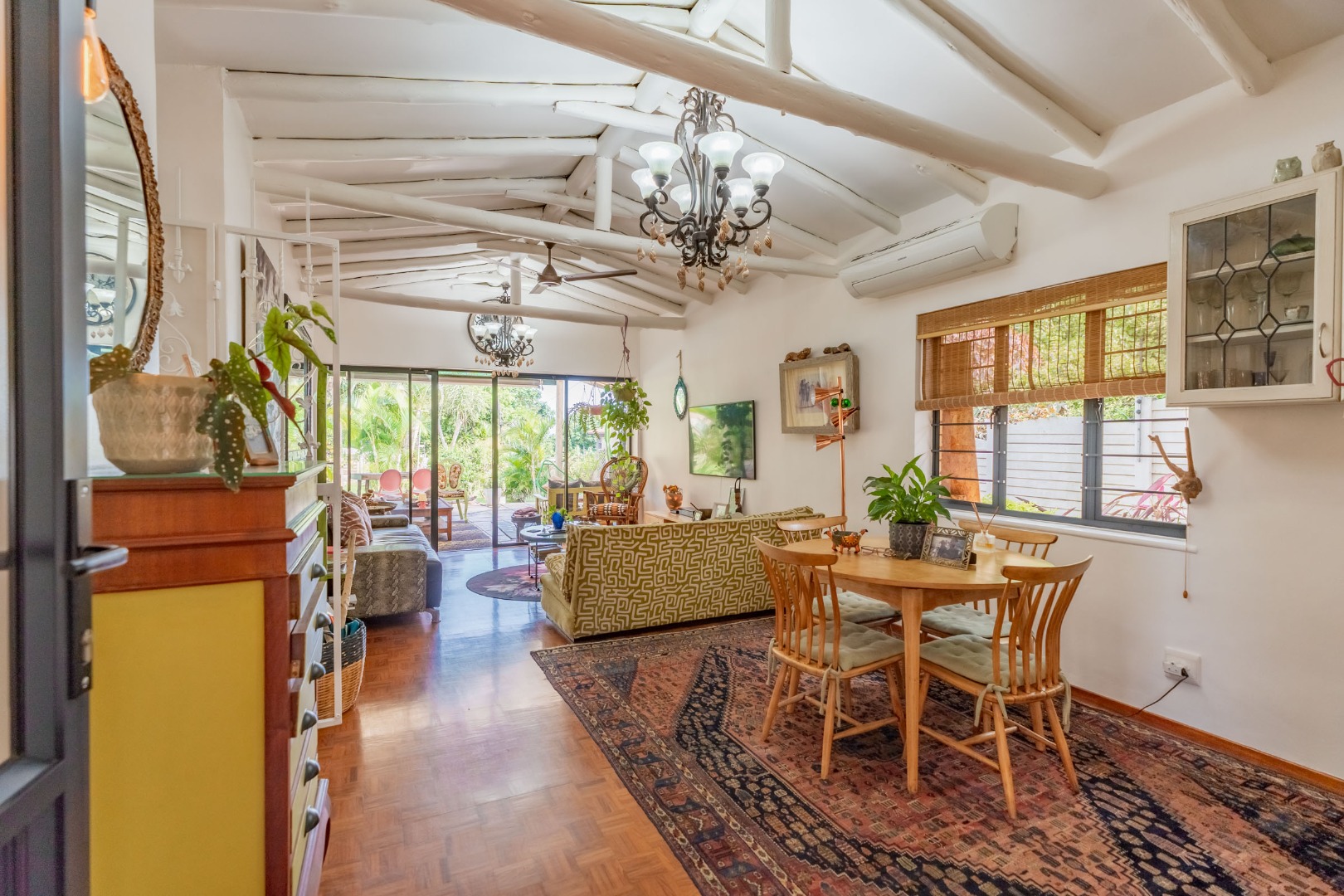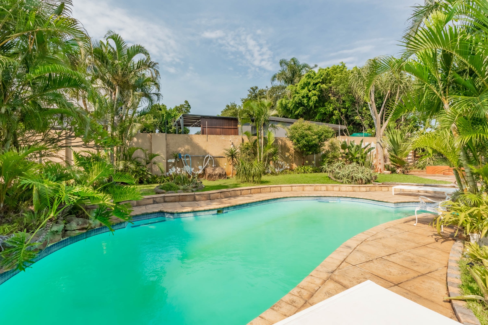 Nestled in the desirable suburban enclave of Herrwood Park, Umhlanga, this inviting 4-bedroom, 4-bathroom residence offers a harmonious blend of comfortable living and tropical outdoor appeal. The property welcomes you with an inviting arched entrance, flanked by lush landscaping and earthy-toned walls, setting a serene tone. Inside, the home features an open-plan layout, enhanced by abundant natural light, exposed wooden ceiling beams, and warm parquet flooring, creating a bright and airy atmosphere.