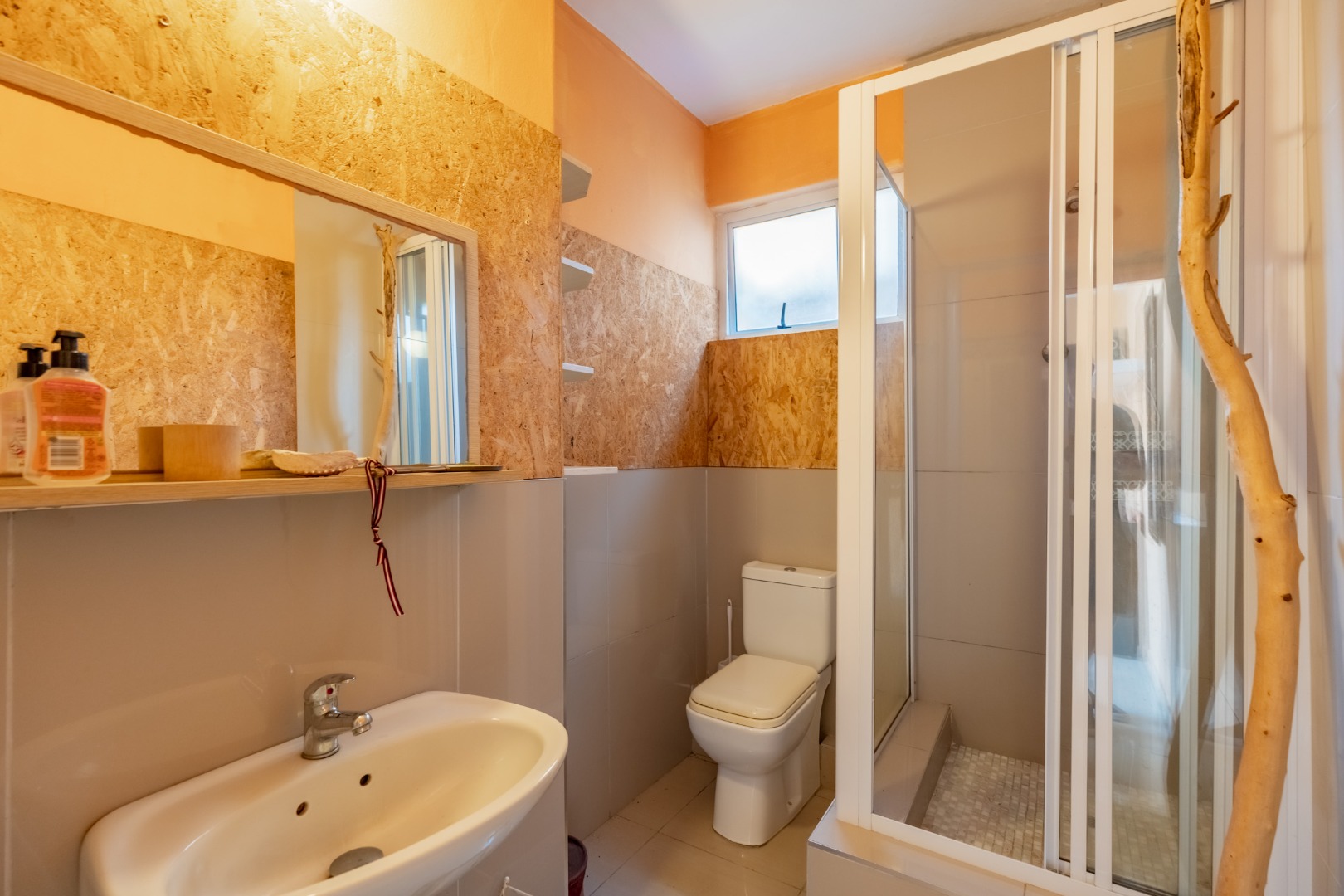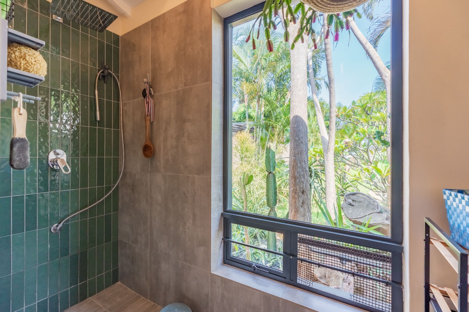 Each of the four bedrooms provides a comfortable retreat, with two featuring en-suite bathrooms. One bedroom offers a cozy, eclectic ambiance with natural light and green views. The bathrooms are uniquely designed, including one with high vaulted ceilings, exposed beams, and large windows that invite the outdoors in. A dedicated study, laundry room, and garden gym further enhance the home's functionality.