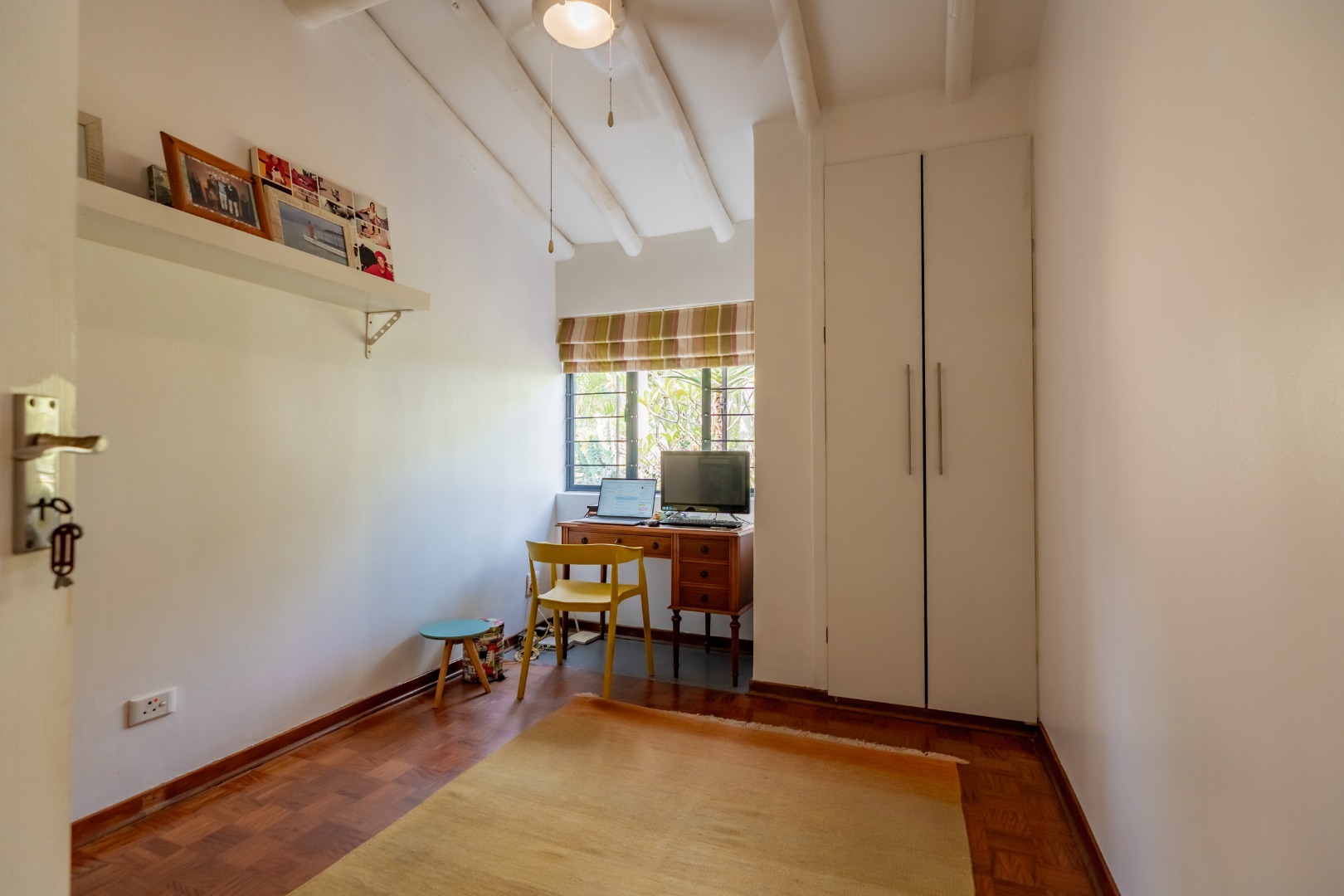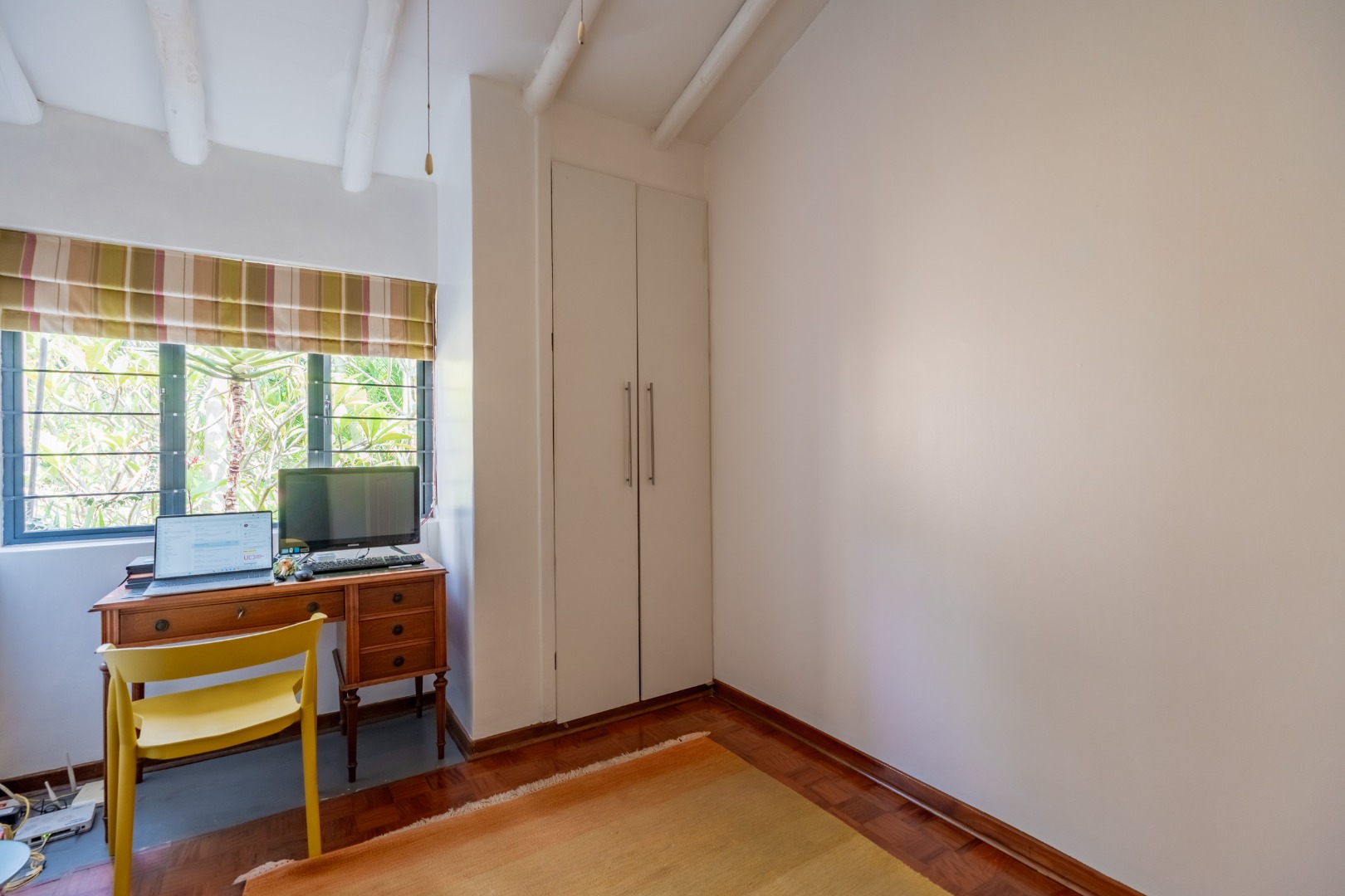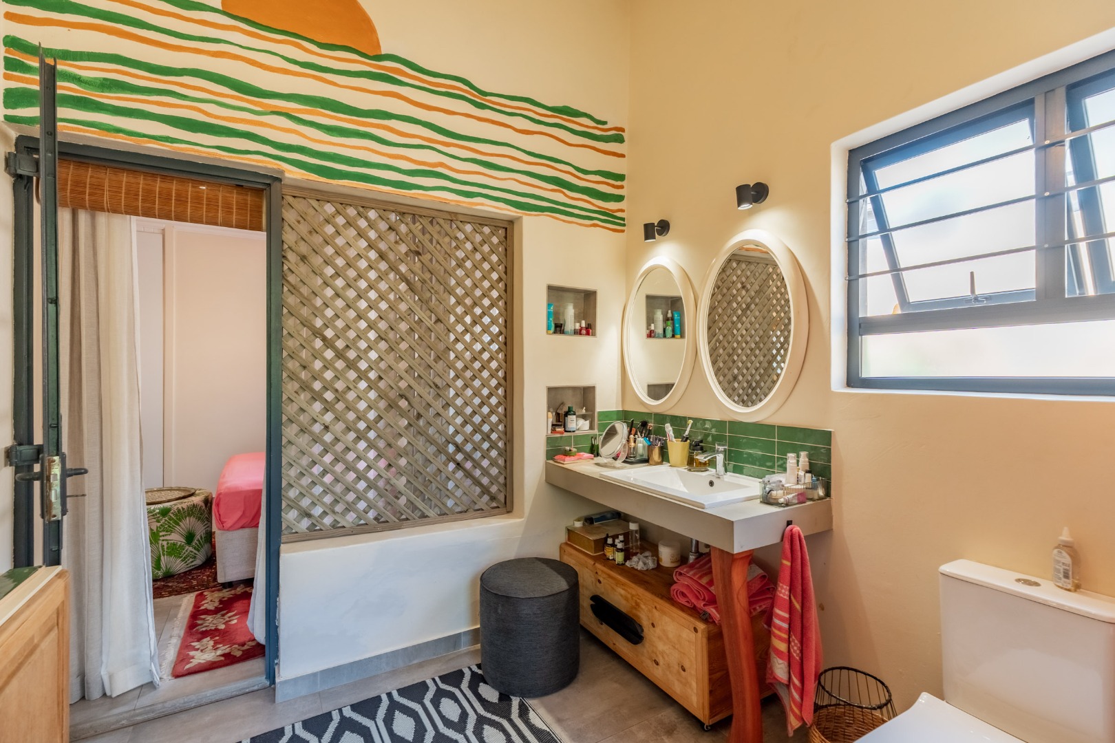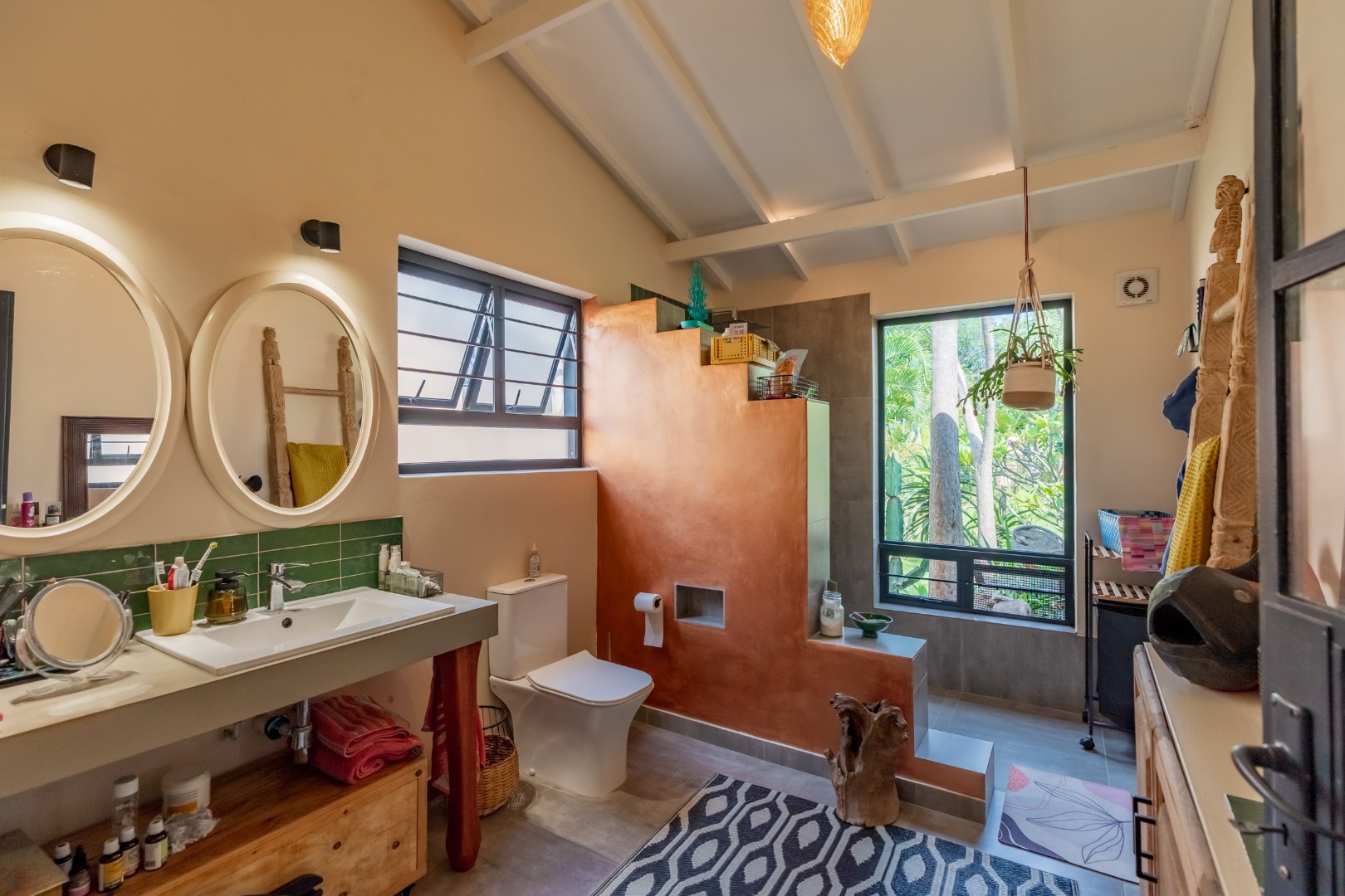 Each of the four bedrooms provides a comfortable retreat, with two featuring en-suite bathrooms. One bedroom offers a cozy, eclectic ambiance with natural light and green views. The bathrooms are uniquely designed, including one with high vaulted ceilings, exposed beams, and large windows that invite the outdoors in. A dedicated study, laundry room, and garden gym further enhance the home's functionality.