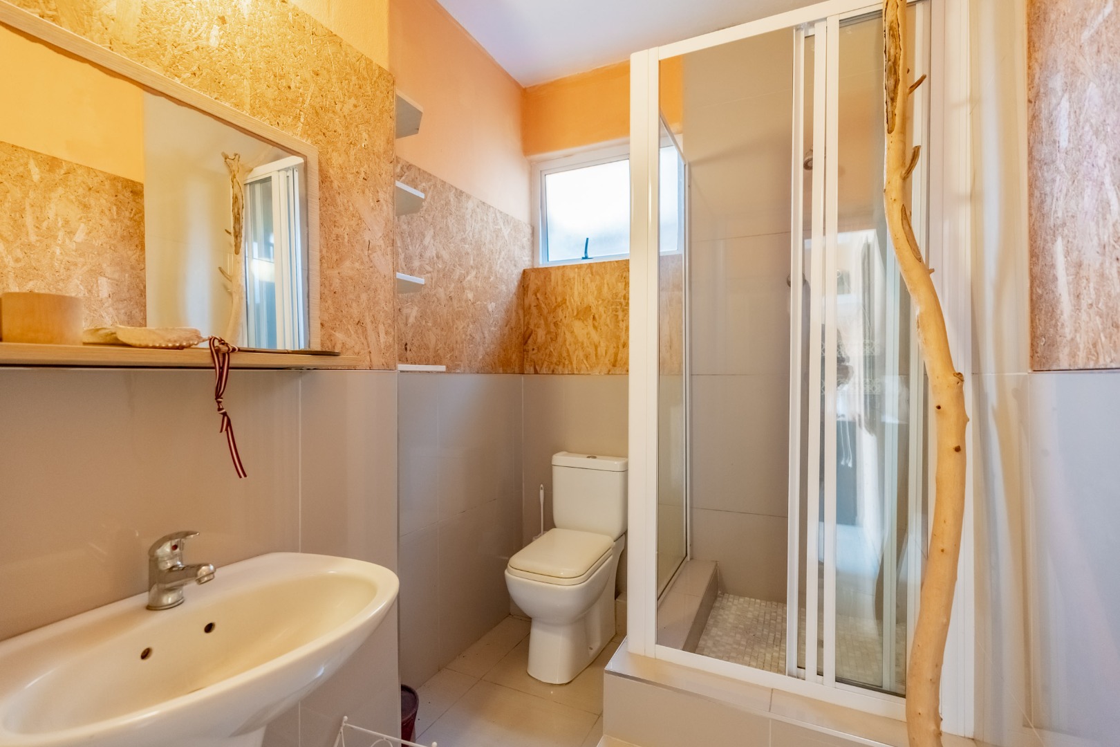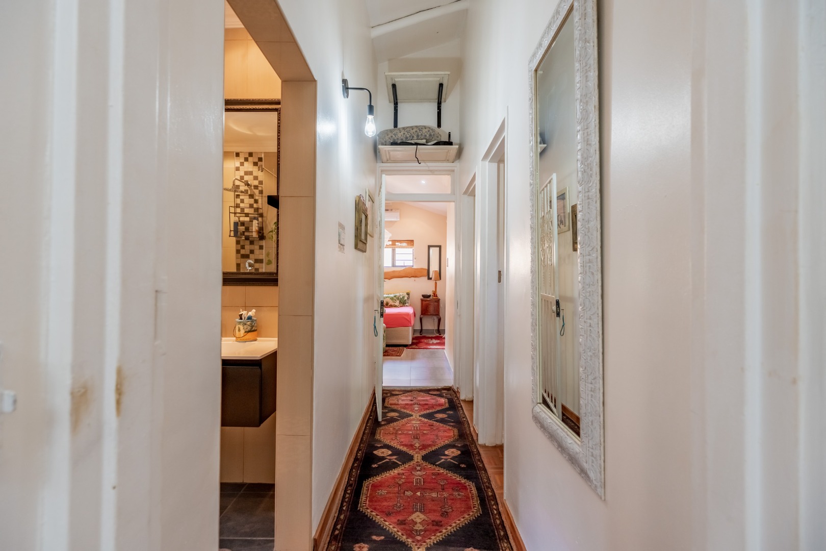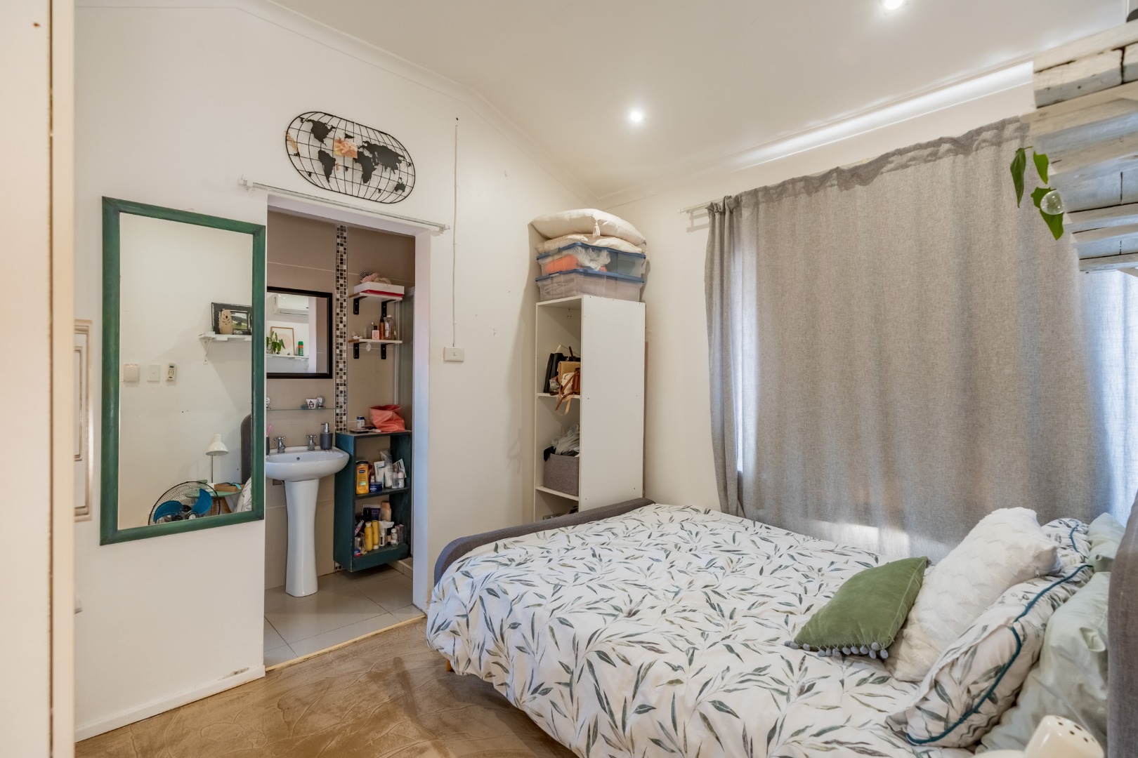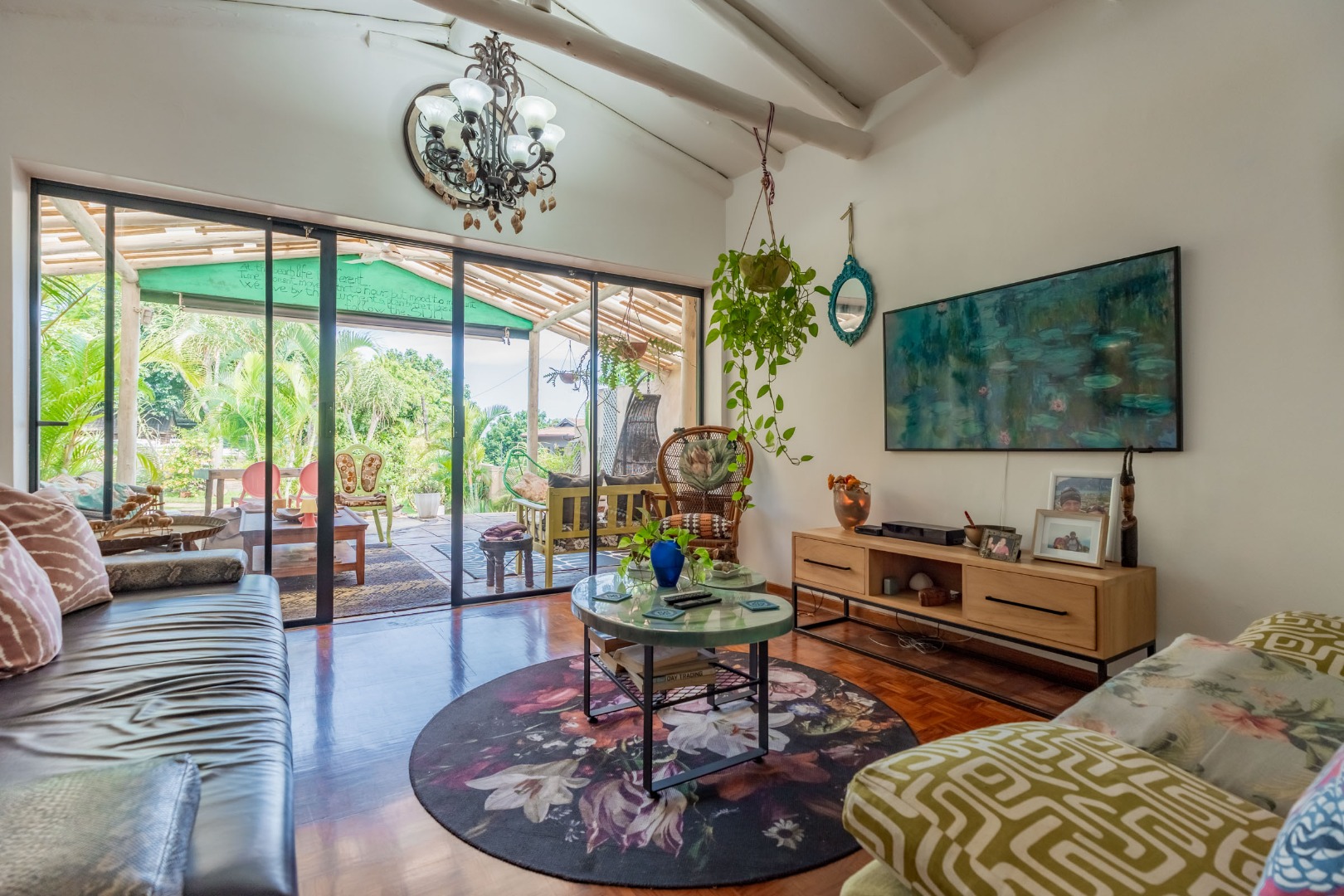 Each of the four bedrooms provides a comfortable retreat, with two featuring en-suite bathrooms. One bedroom offers a cozy, eclectic ambiance with natural light and green views. The bathrooms are uniquely designed, including one with high vaulted ceilings, exposed beams, and large windows that invite the outdoors in. A dedicated study, laundry room, and garden gym further enhance the home's functionality.