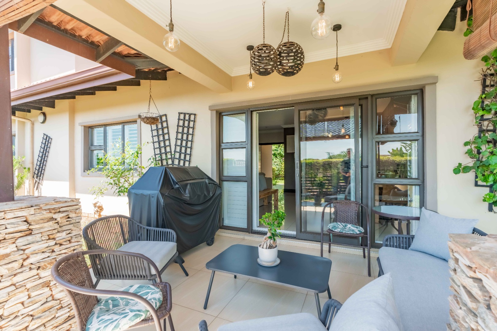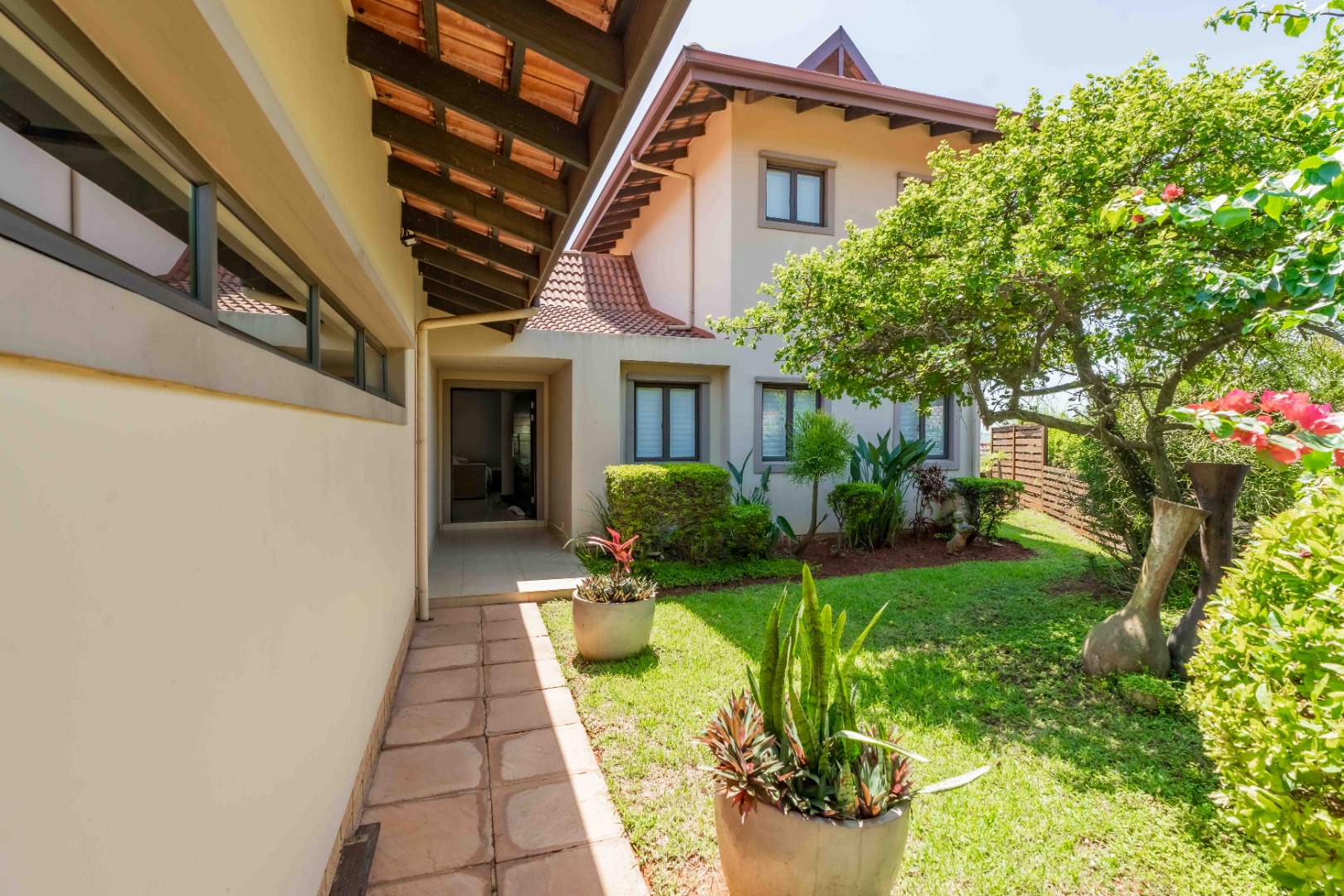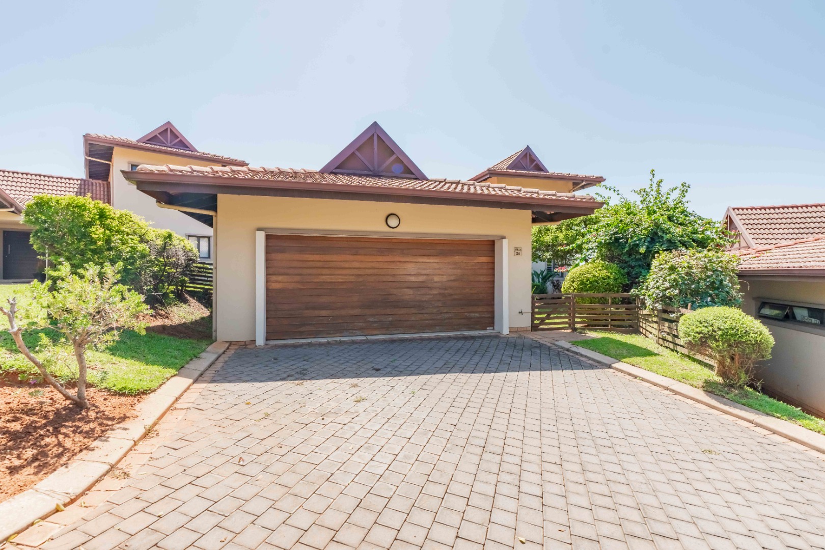 This beautiful modern 3-bedroom unit offers sophisticated living within the secure Izinga Estate in Umhlanga. The property boasts a neat, established garden featuring a lush green lawn and paved walkway into the home, creating an inviting kerb appeal.