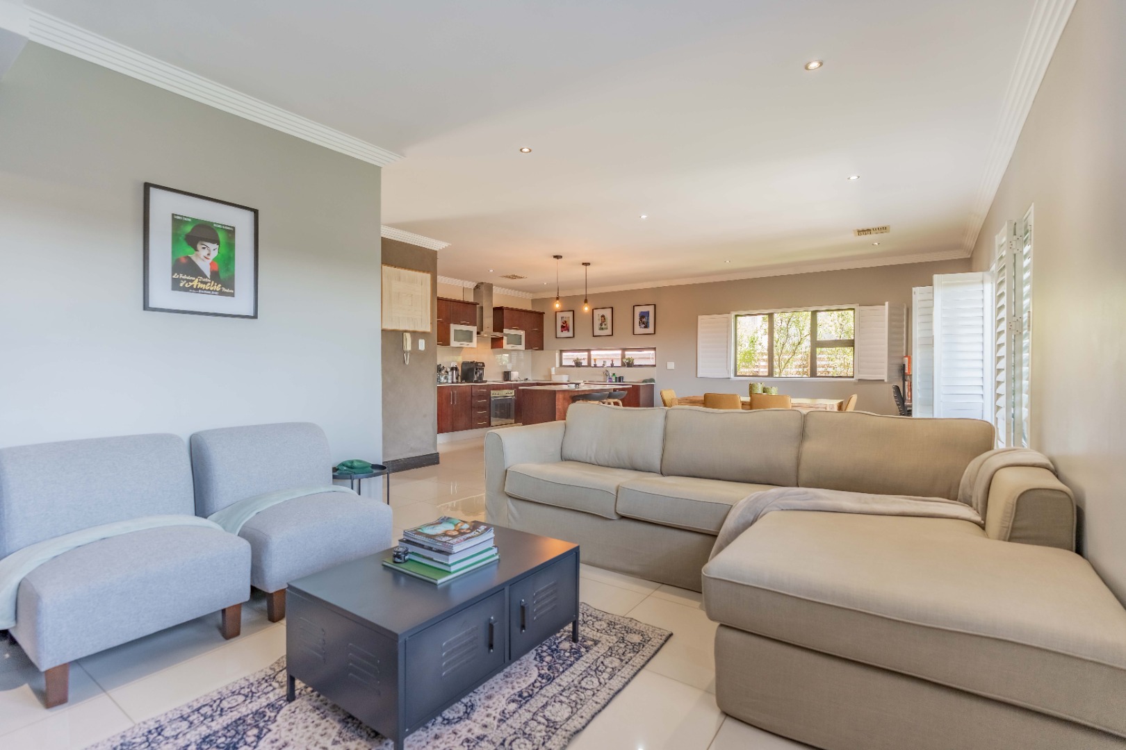 Inside, the open-plan layout seamlessly integrates a comfortable lounge and a dedicated dining area, perfect for both daily living and entertaining. The interior showcases modern and stylish decor. Air conditioning throughout ensures year-round comfort.
