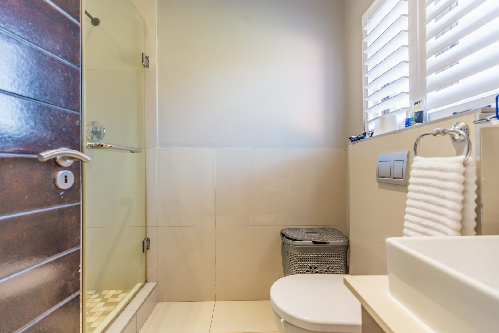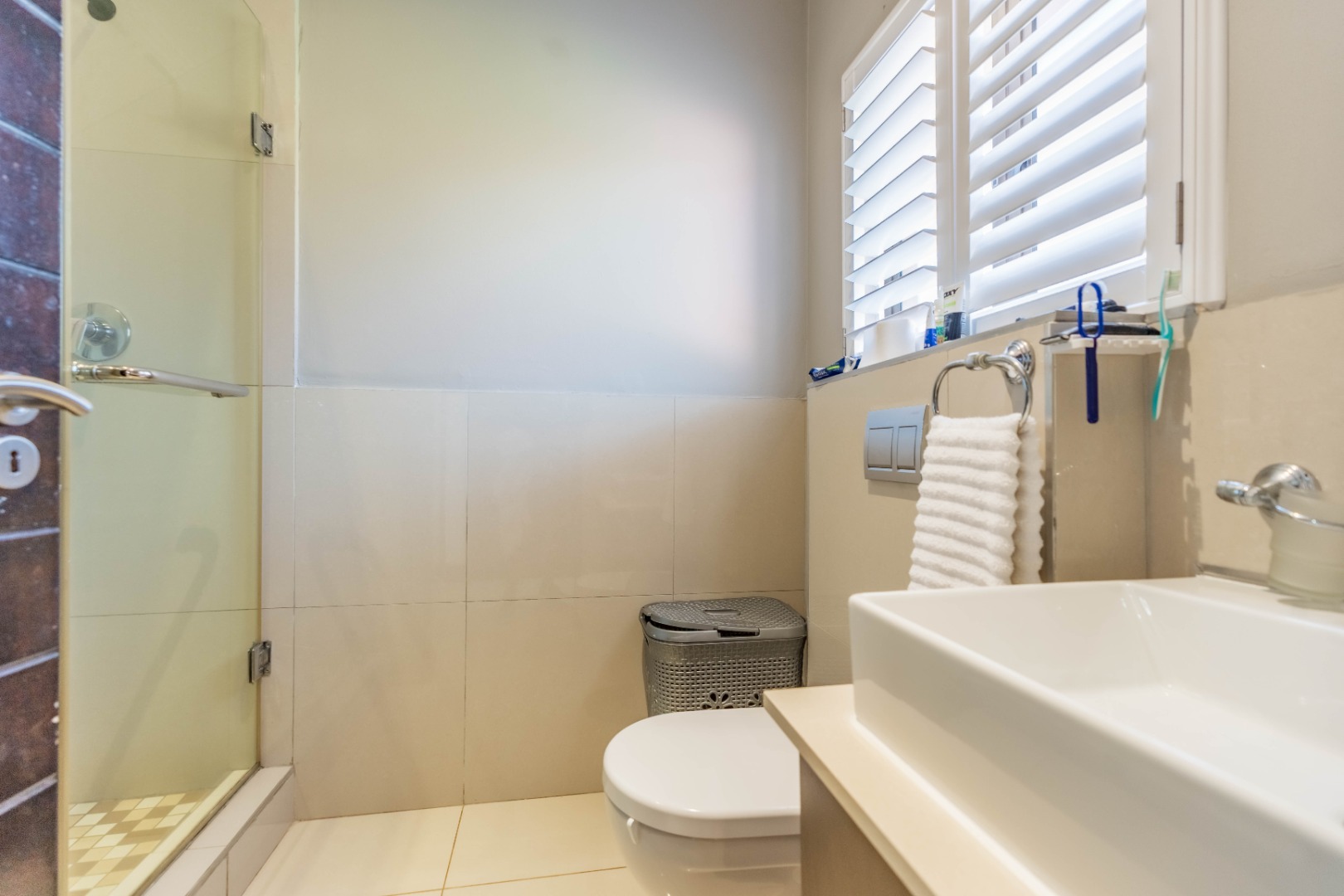 The home features three spacious bedrooms, providing ample private space. There are two well-appointed bathrooms, including a private ensuite. Plantation shutters in the living areas offer excellent natural light control and enhance the contemporary aesthetic.