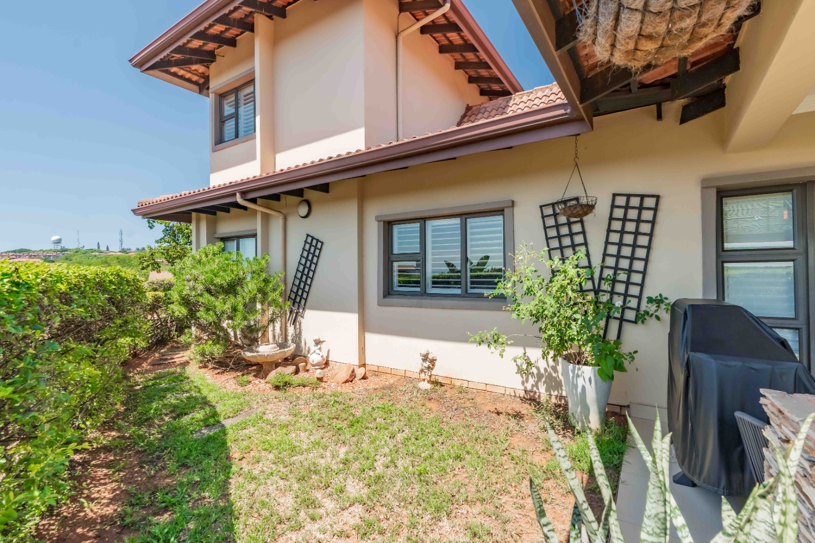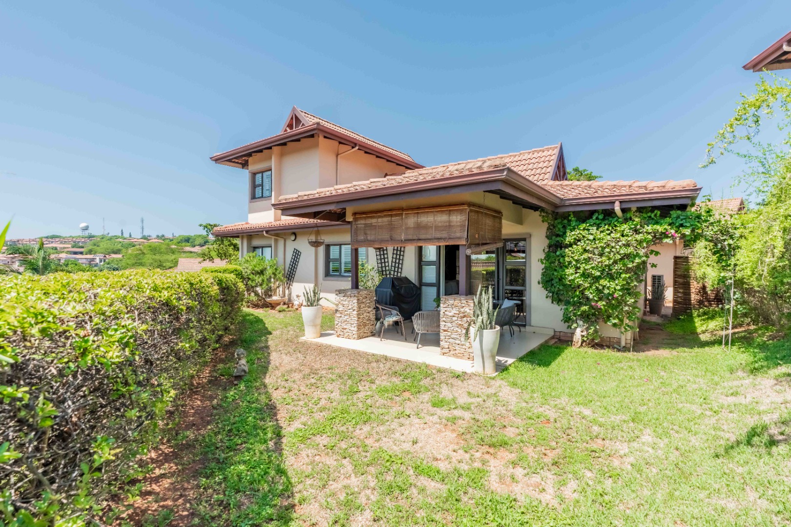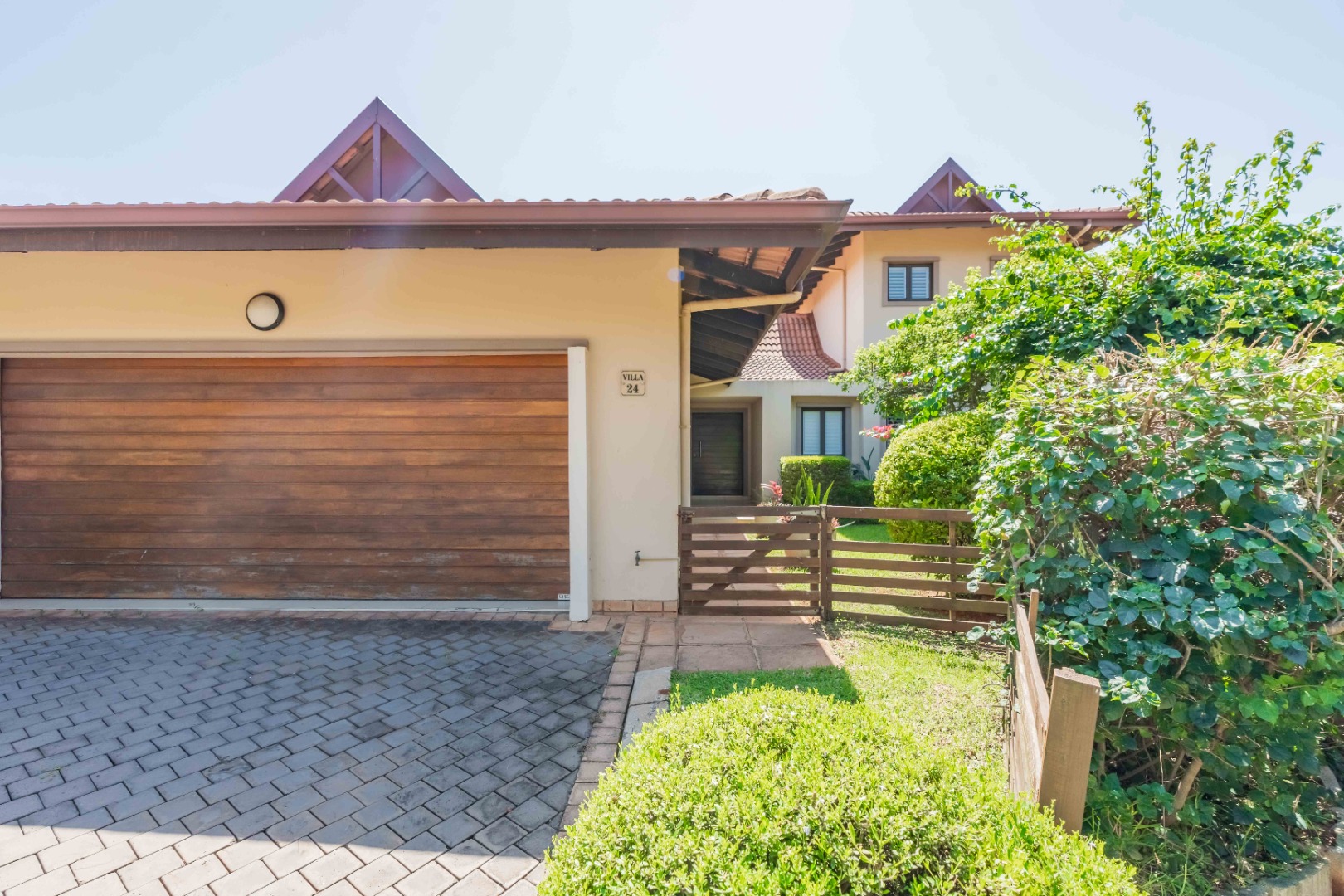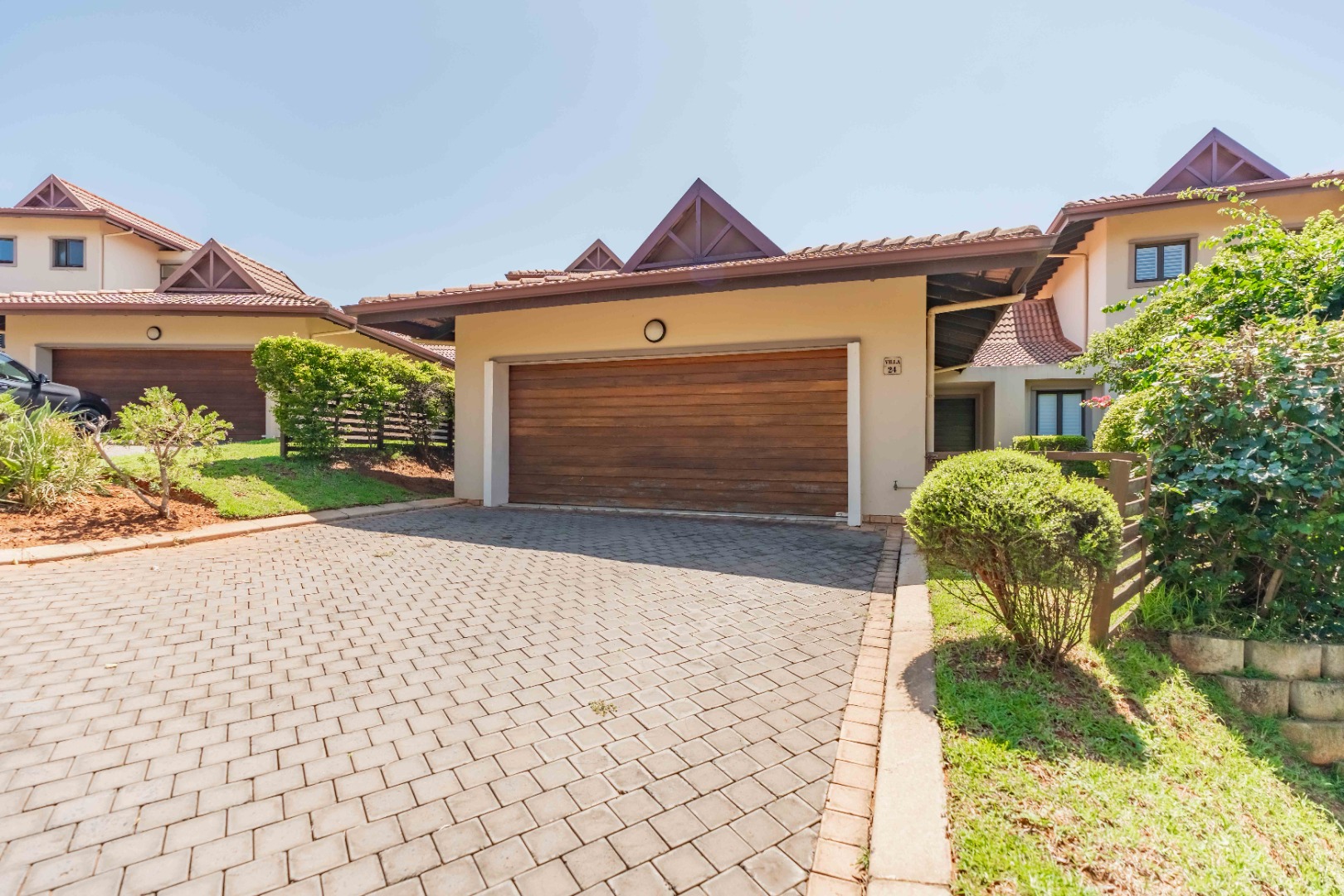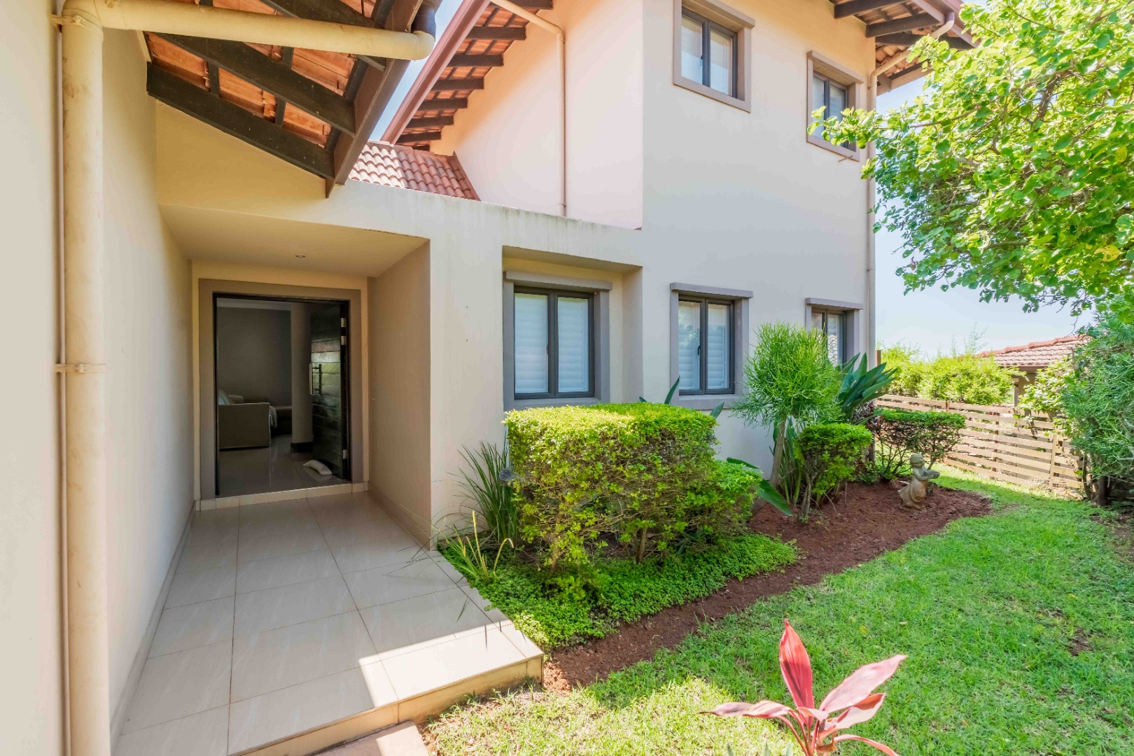 This beautiful modern 3-bedroom unit offers sophisticated living within the secure Izinga Estate in Umhlanga. The property boasts a neat, established garden featuring a lush green lawn and paved walkway into the home, creating an inviting kerb appeal.