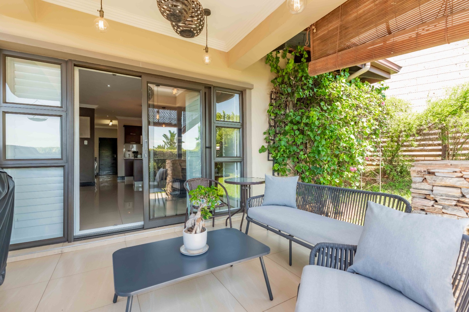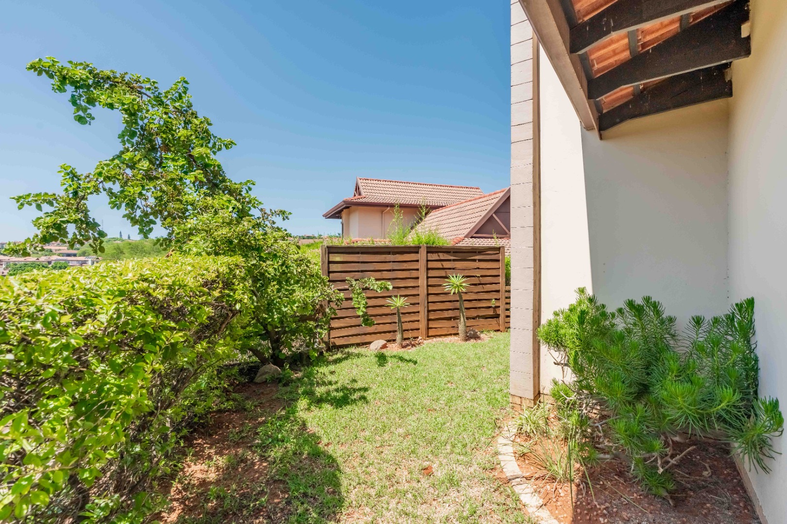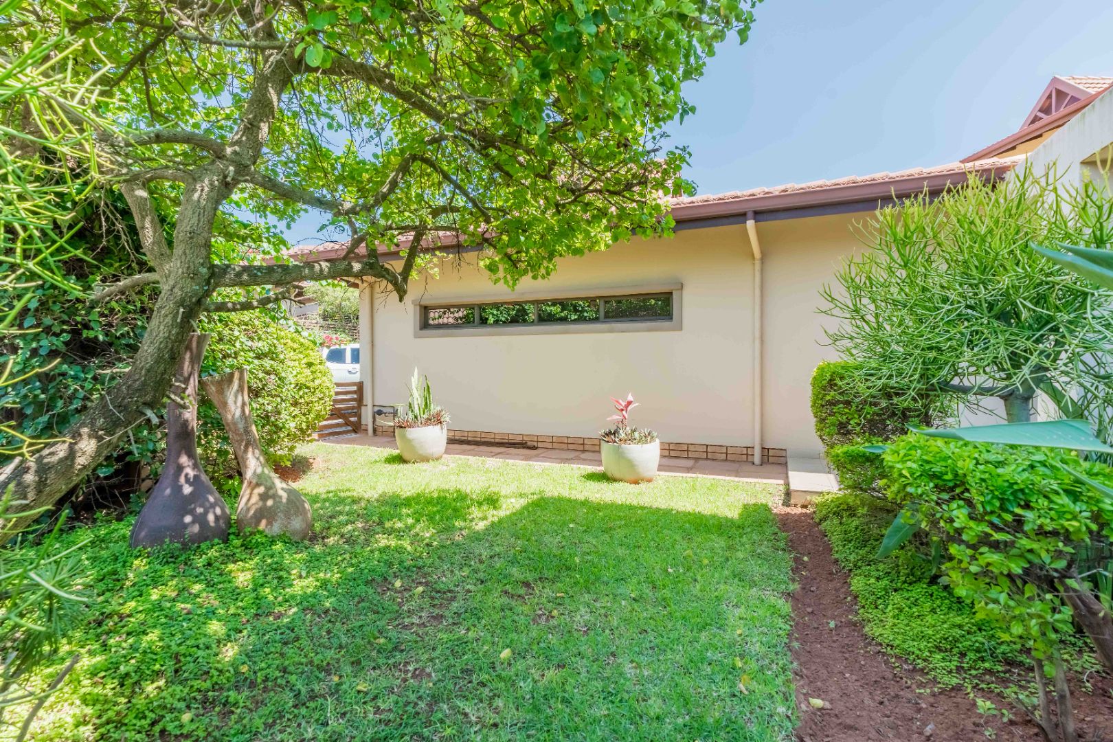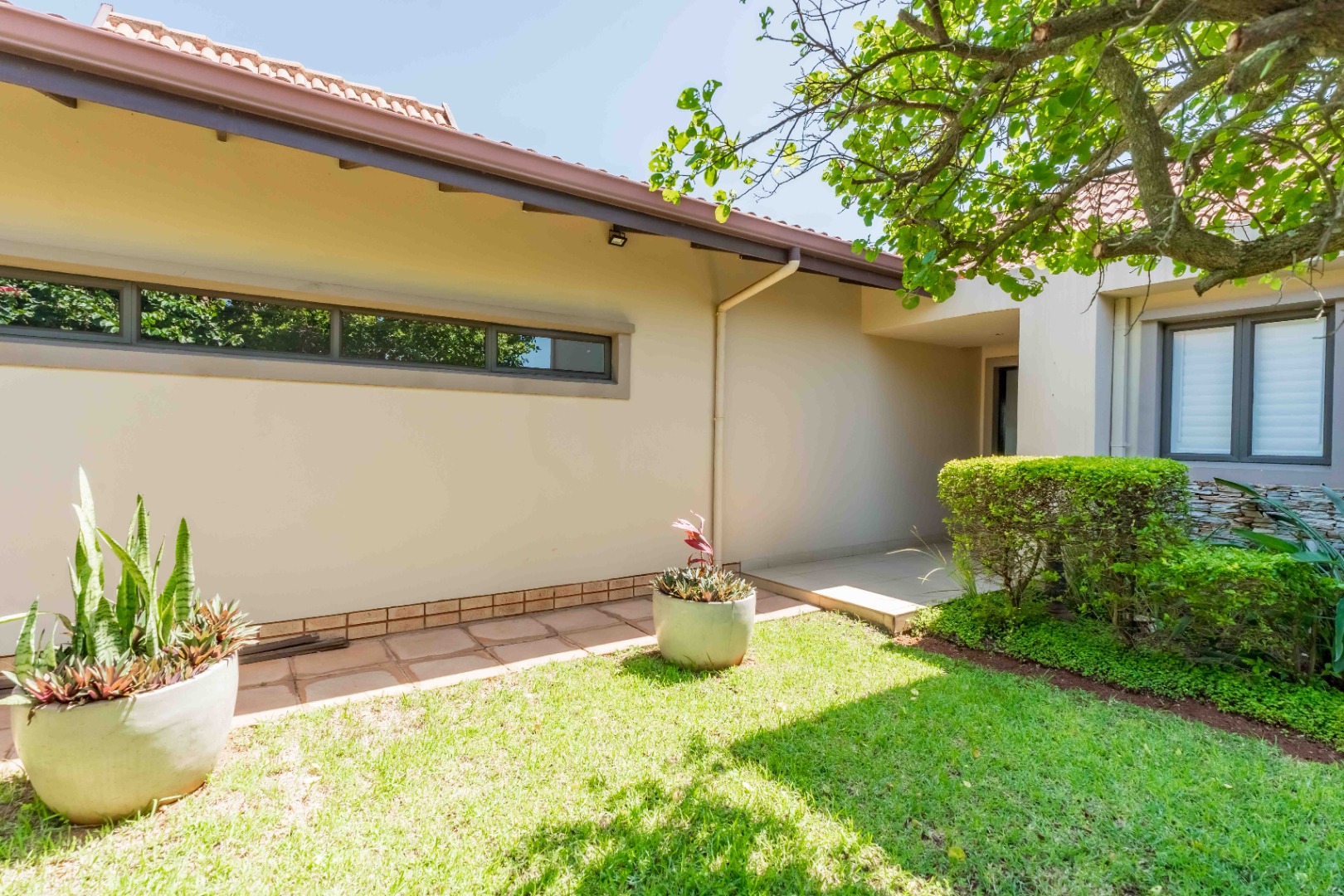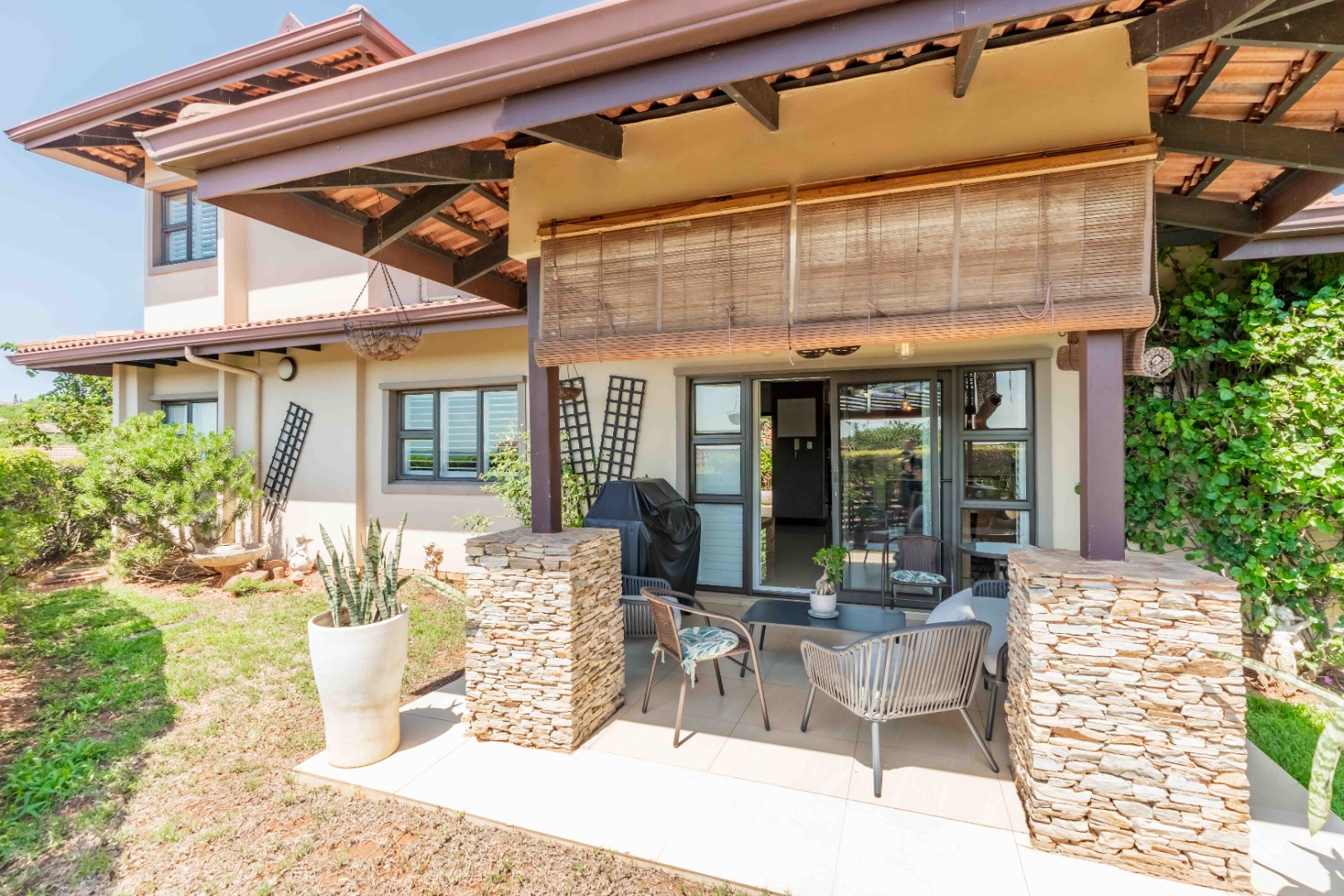 This beautiful modern 3-bedroom unit offers sophisticated living within the secure Izinga Estate in Umhlanga. The property boasts a neat, established garden featuring a lush green lawn and paved walkway into the home, creating an inviting kerb appeal.