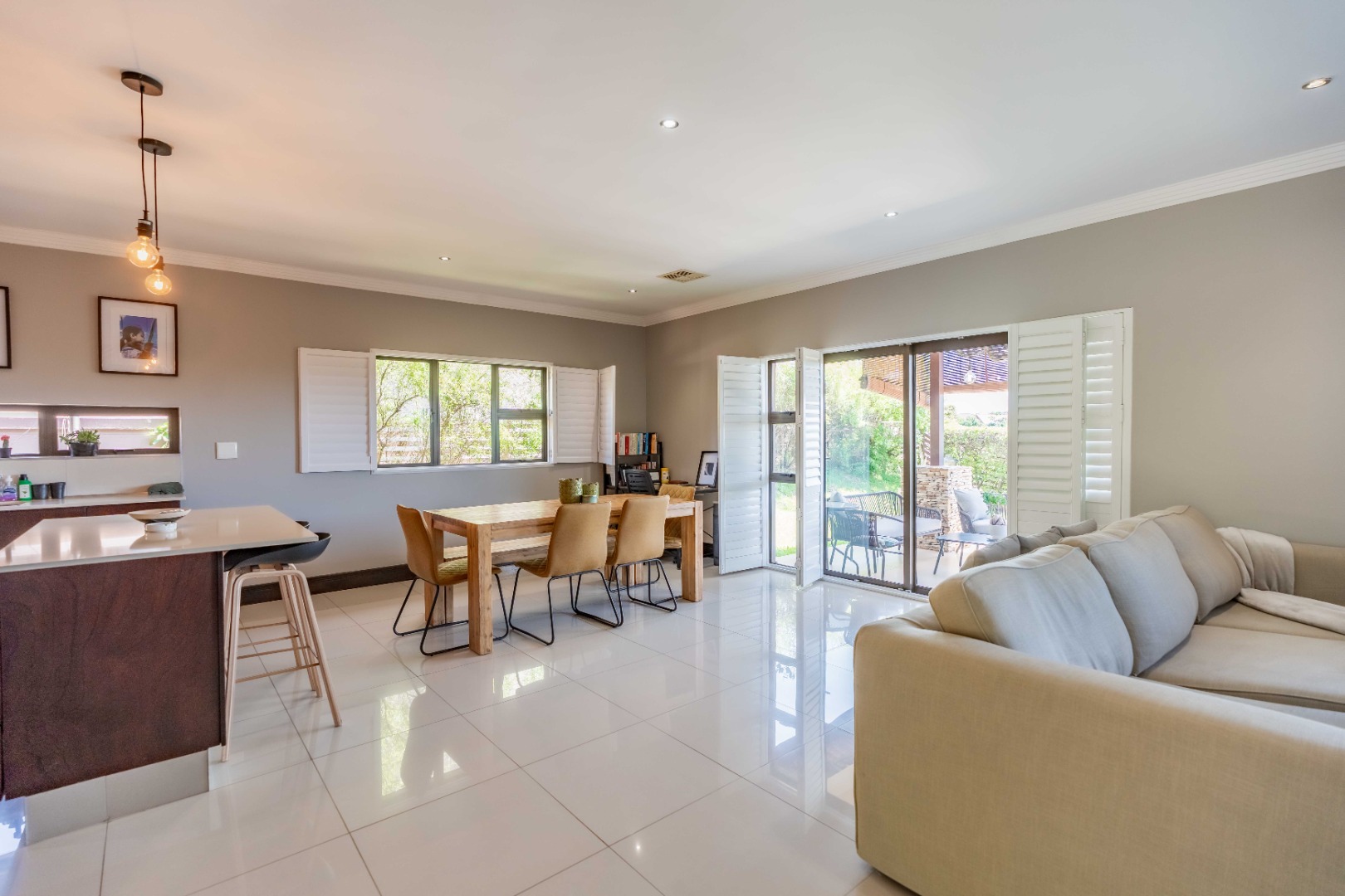 The home features three spacious bedrooms, providing ample private space. There are two well-appointed bathrooms, including a private ensuite. Plantation shutters in the living areas offer excellent natural light control and enhance the contemporary aesthetic.