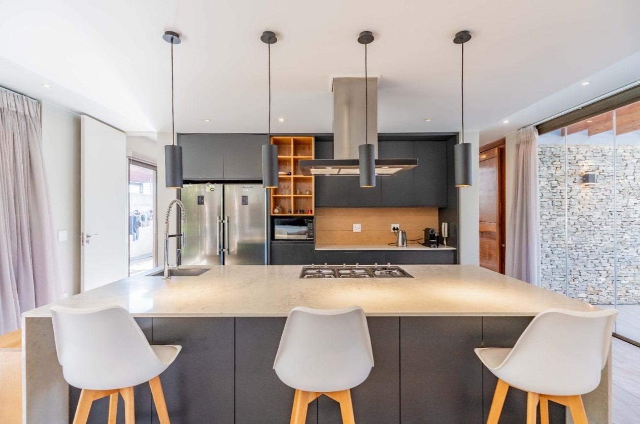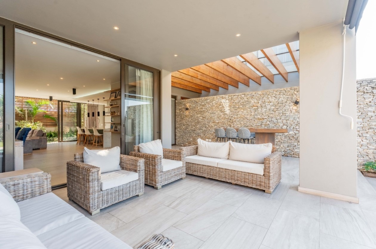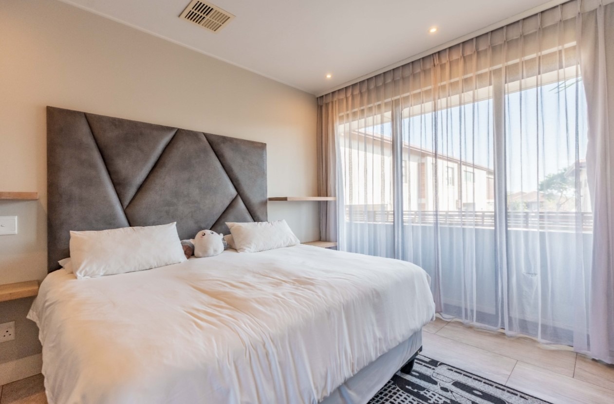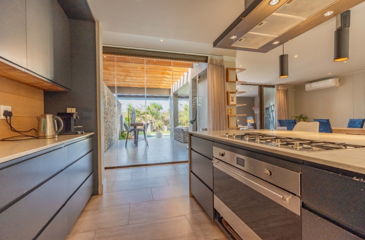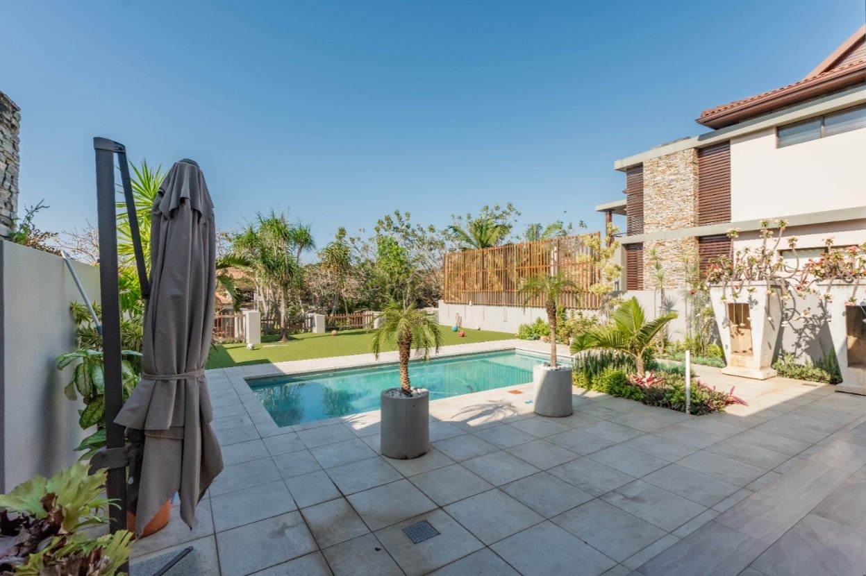 Step into this exquisite modern residence, where an expansive open-plan layout seamlessly integrates the living, dining, and kitchen areas. The contemporary kitchen is a chef's delight, featuring a large island with bar seating, a gas hob, sleek dark cabinetry, and ample space for culinary creativity. Recessed lighting and stylish pendant fixtures illuminate the space, while integrated air conditioning ensures year-round comfort. Large glass doors effortlessly connect the interior to the outdoor entertainment areas, fostering an exceptional indoor-outdoor flow. This sophisticated home boasts four generously sized bedrooms, each accompanied by its own luxurious en-suite bathroom, offering ultimate privacy and convenience. An additional guest toilet caters to visitors, ensuring comfort for all. The design prioritises both functionality and aesthetic appeal, creating serene personal retreats within the home. Experience the epitome of outdoor living with a private swimming pool and a spacious tiled patio, perfect for relaxation and entertaining. A covered veranda provides shaded seating, complemented by an outdoor dining area. The property features a well-maintained garden, a double garage, and four additional parking spaces, catering to all your lifestyle needs. A dedicated study and staff quarters add to the home's practicality. Nestled within the prestigious Izinga Estate in Umhlanga, this suburban property offers a secure and tranquil environment. Residents benefit from an alarm system, access gate, security post, and intercom, ensuring peace of mind. Enjoy scenic views from this desirable location, known for its modern architecture and vibrant community. Key Features: * 4 Bedrooms, 4 Bathrooms (all en-suite) * Open-plan Living, Dining & Modern Kitchen * Private Swimming Pool & Spacious Patio * Double Garage & 4 Additional Parking Bays * Air Conditioning & Intercom System * Study, Pantry & Staff Quarters * Balcony & Garden * Located in Secure Izinga Estate