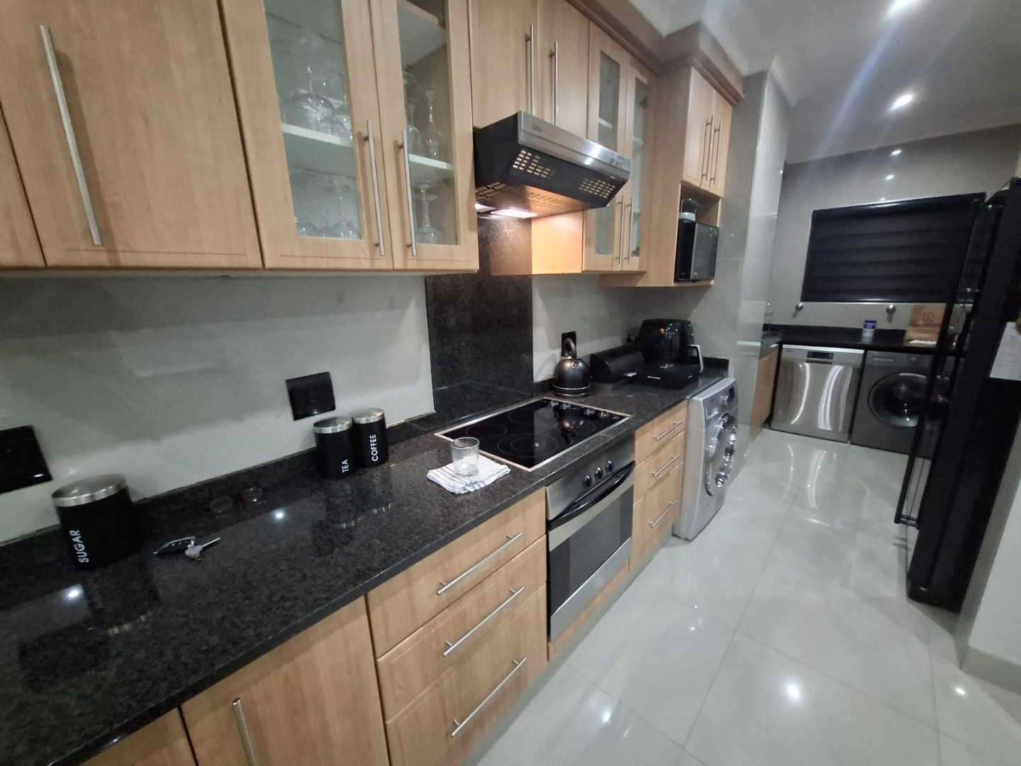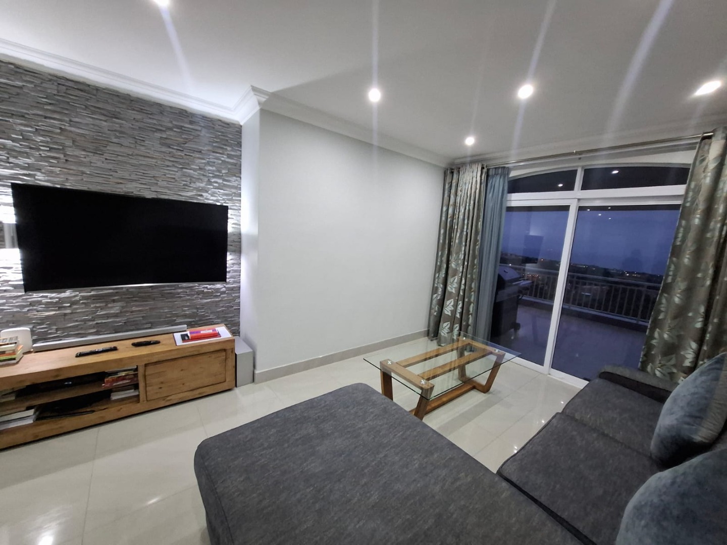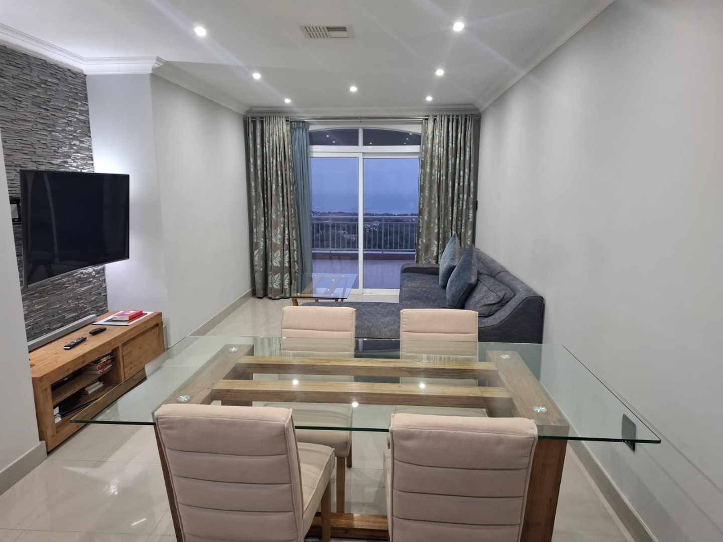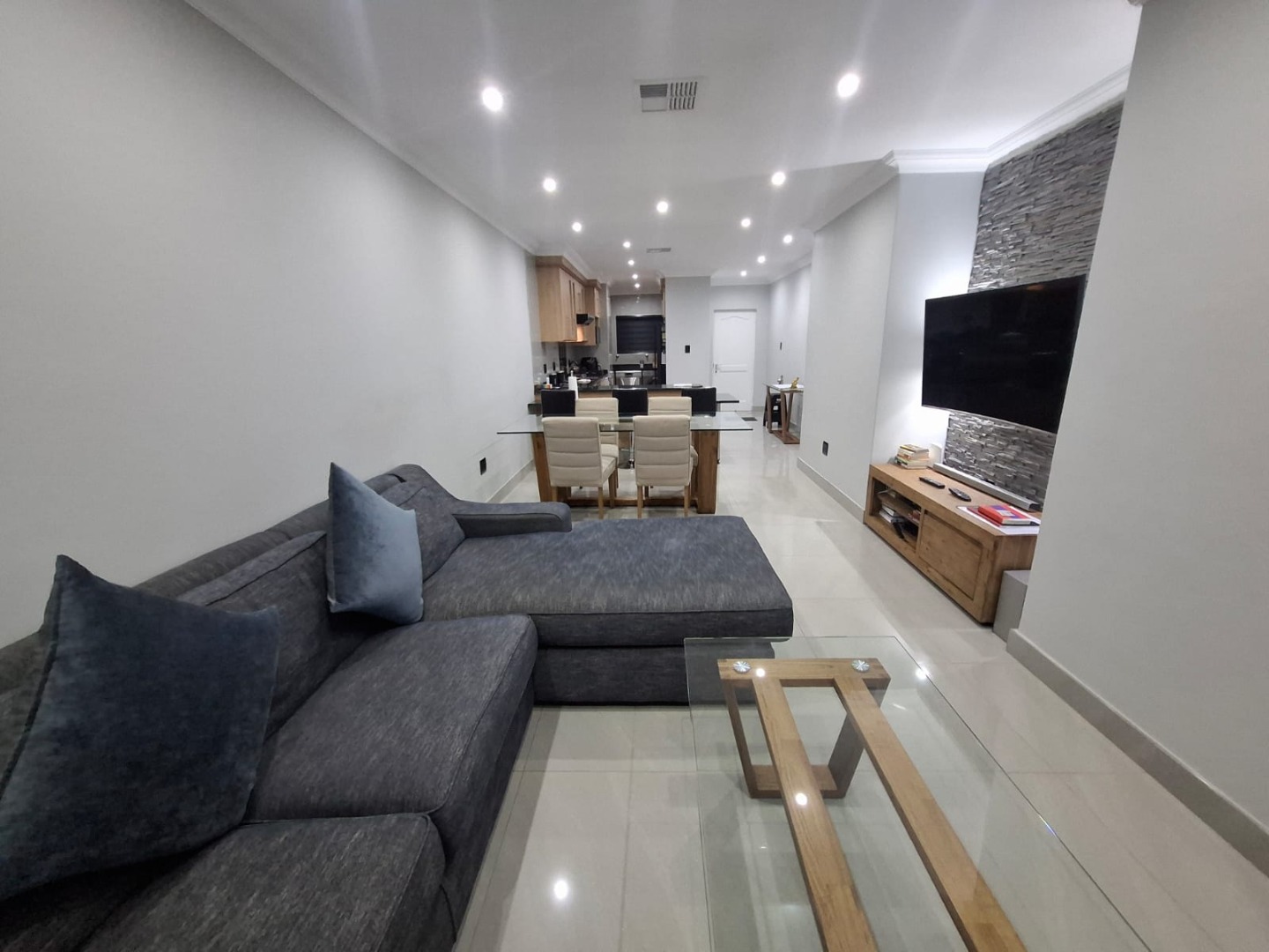 Discover this modern 125 sqm apartment located in a well-maintained complex within the desirable La Lucia Ridge, Umhlanga, South Africa. The complex features striking white architecture, lush tropical landscaping, and paved driveways, creating an inviting first impression. This suburban, gated community offers a secure and convenient lifestyle. Step inside to an elegantly designed open-plan living space, seamlessly integrating the lounge, dining area, and a modern kitchen. Clean tiled flooring and ample recessed lighting enhance the contemporary aesthetic. A prominent stone accent wall behind the television adds sophistication to the living area, which accommodates an L-shaped sectional sofa and a glass-top coffee table. The dining area, with its stylish glass table, flows effortlessly into the kitchen. The modern galley-style kitchen is a highlight, equipped with sleek wooden cabinetry, dark granite countertops, and a full suite of integrated stainless steel appliances, including an oven, hob, extractor, washing machine, and dishwasher. Large sliding glass doors open from the living area onto a spacious, modern balcony with stylish patterned floor tiles. This outdoor space provides a pleasant extension for relaxation, offering scenic and sea views, complete with an outdoor power outlet and recessed lighting. This apartment offers two comfortable bedrooms and two bathrooms, including a guest toilet, ensuring convenience. Two dedicated parking spaces are available. The complex prioritises security with 24-hour security, a security post, access gate, and intercom system, providing peace of mind. Lifts are also available for easy access to all floors. Key Features: * 125 sqm modern apartment * 2 Bedrooms, 2 Bathrooms, 1 Guest Toilet * Open-plan living, dining, and kitchen * Modern kitchen with integrated appliances * Spacious balcony with scenic and sea views * Two dedicated parking bays * 24-hour security, access gate, intercom * Lifts for convenient access * Located in a secure, gated complex