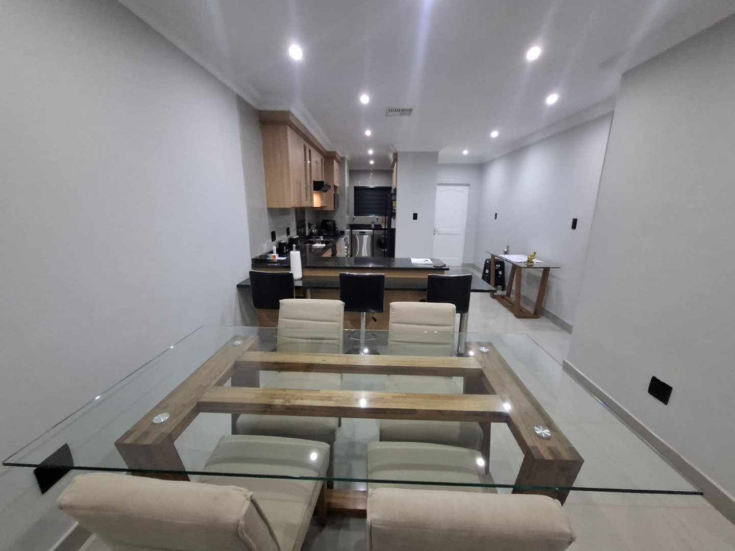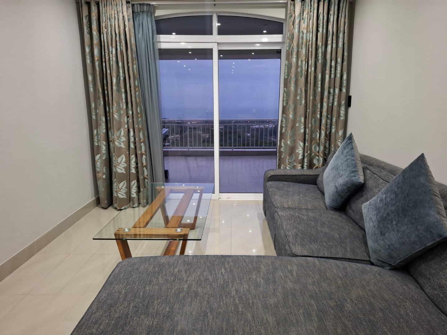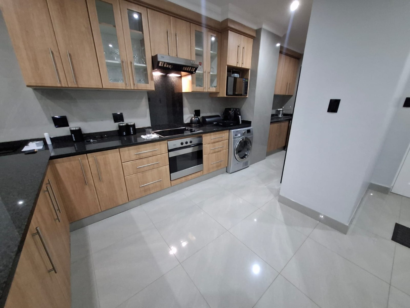 Discover this modern 125 sqm apartment located in a well-maintained complex within the desirable La Lucia Ridge, Umhlanga, South Africa. The complex features striking white architecture, lush tropical landscaping, and paved driveways, creating an inviting first impression. This suburban, gated community offers a secure and convenient lifestyle. Step inside to an elegantly designed open-plan living space, seamlessly integrating the lounge, dining area, and a modern kitchen. Clean tiled flooring and ample recessed lighting enhance the contemporary aesthetic. A prominent stone accent wall behind the television adds sophistication to the living area, which accommodates an L-shaped sectional sofa and a glass-top coffee table. The dining area, with its stylish glass table, flows effortlessly into the kitchen. The modern galley-style kitchen is a highlight, equipped with sleek wooden cabinetry, dark granite countertops, and a full suite of integrated stainless steel appliances, including an oven, hob, extractor, washing machine, and dishwasher. Large sliding glass doors open from the living area onto a spacious, modern balcony with stylish patterned floor tiles. This outdoor space provides a pleasant extension for relaxation, offering scenic and sea views, complete with an outdoor power outlet and recessed lighting. This apartment offers two comfortable bedrooms and two bathrooms, including a guest toilet, ensuring convenience. Two dedicated parking spaces are available. The complex prioritises security with 24-hour security, a security post, access gate, and intercom system, providing peace of mind. Lifts are also available for easy access to all floors. Key Features: * 125 sqm modern apartment * 2 Bedrooms, 2 Bathrooms, 1 Guest Toilet * Open-plan living, dining, and kitchen * Modern kitchen with integrated appliances * Spacious balcony with scenic and sea views * Two dedicated parking bays * 24-hour security, access gate, intercom * Lifts for convenient access * Located in a secure, gated complex