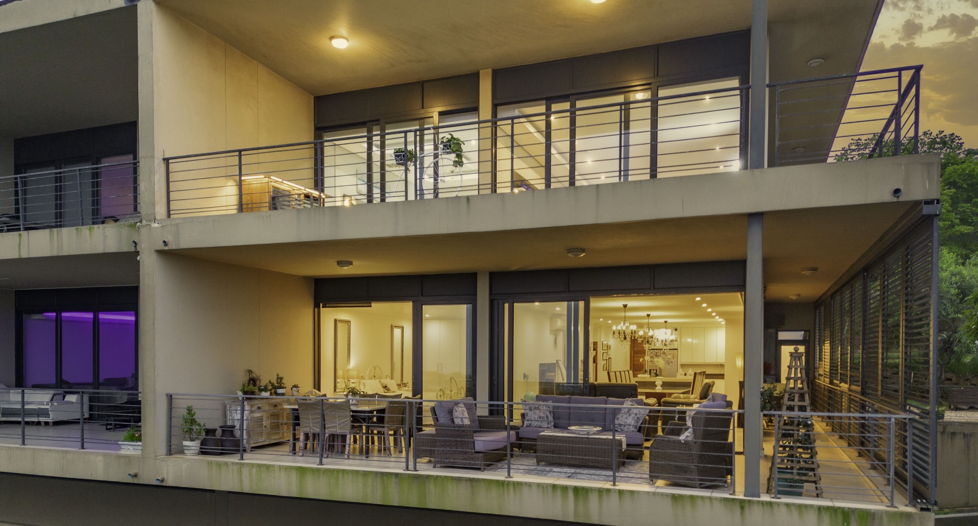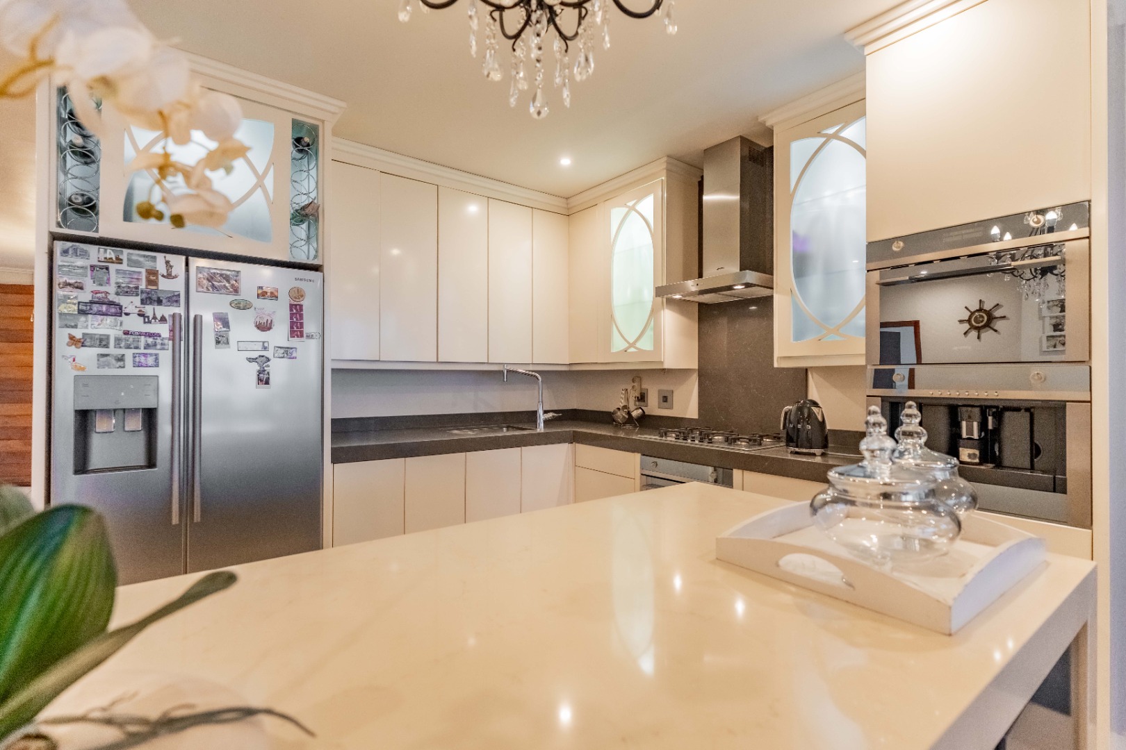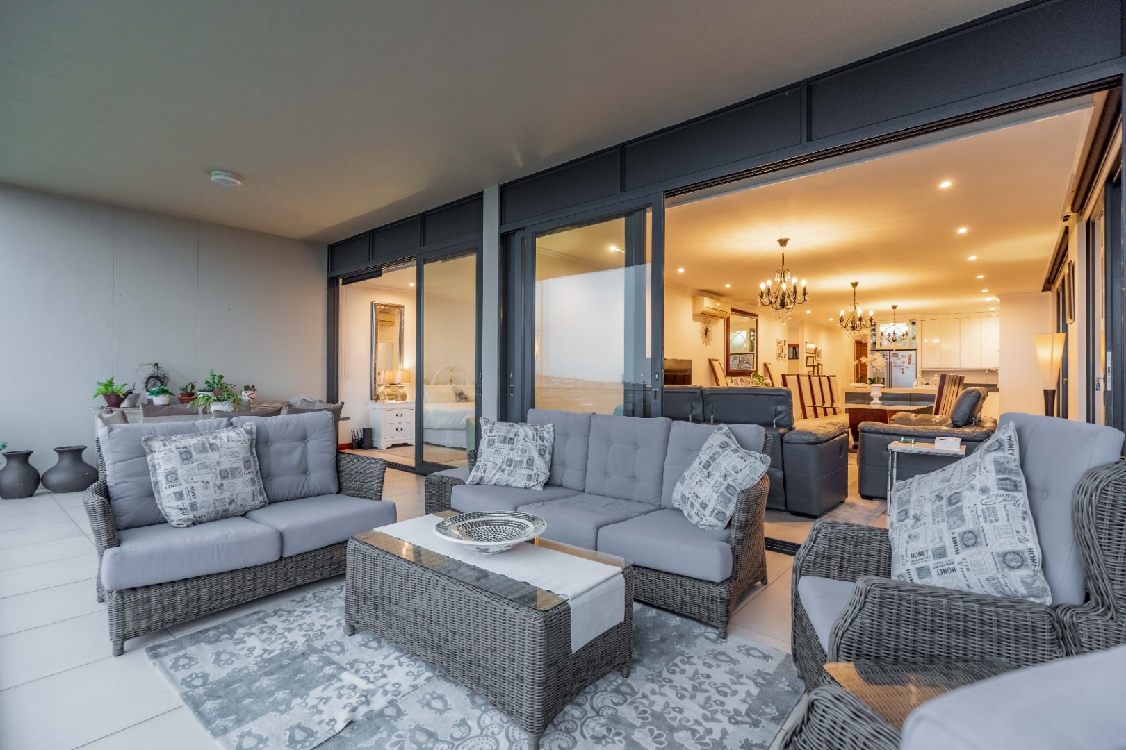Expansive open-plan living areas offer a natural flow between the dining room, lounge, and an immaculate modern kitchen. Crafted for effortless entertaining, the kitchen features premium finishes, a gas stove, oven, and hob, and a center island, creating a stylish yet practical space. Floor-to-ceiling glass sliding doors frame the living areas, opening on both sides to an expansive wraparound patio, designed for year-round enjoyment with storm blinds and elevated panoramic views. The perfect balance of indoor and outdoor living is achieved, where natural light and fresh air enhance the sense of space and tranquility.