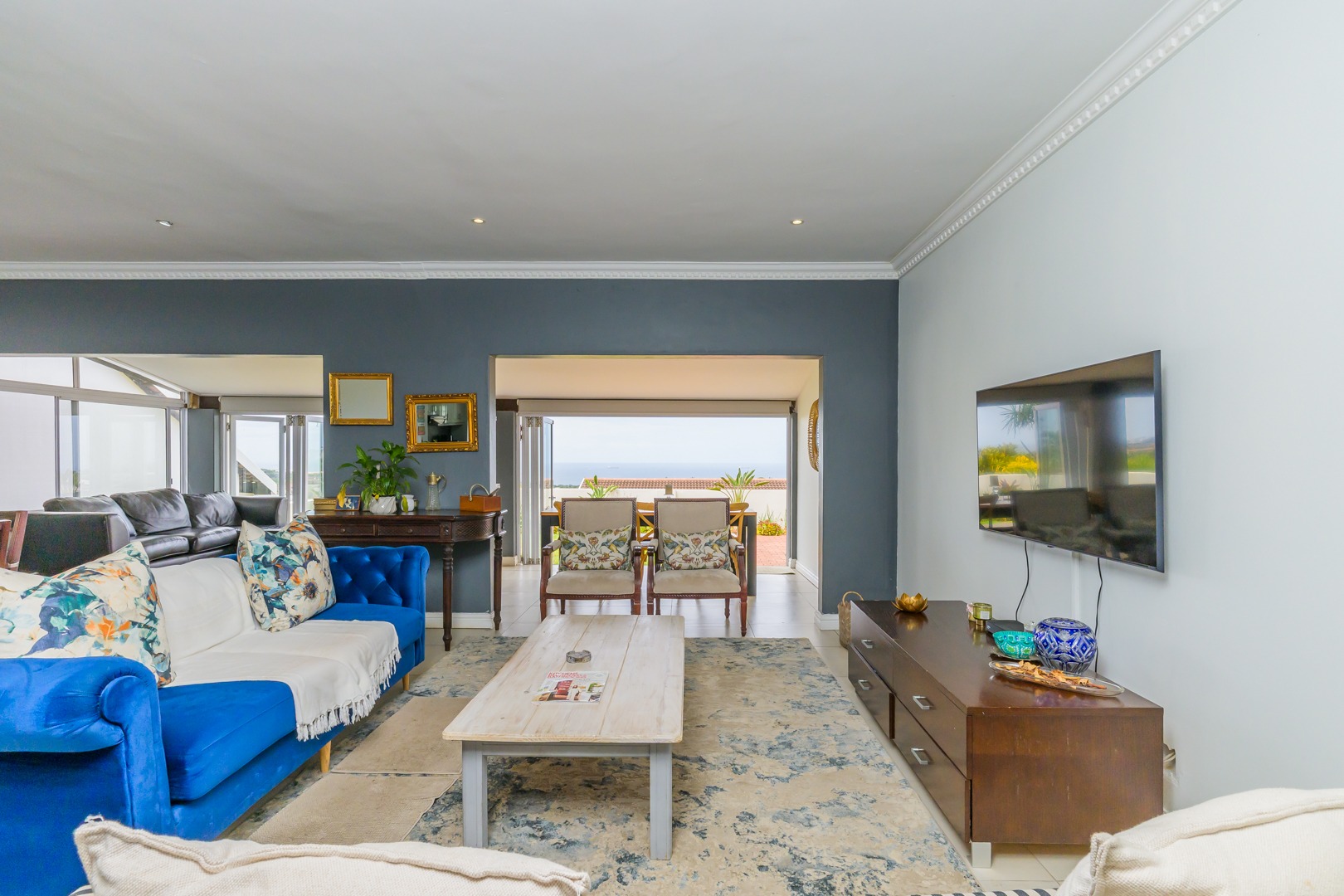 The home features a modern open-plan design, combining living, dining, and lounging areas that flow effortlessly onto a sun-kissed patio — ideal for entertaining or simply soaking in the incredible sunrise sea views.
