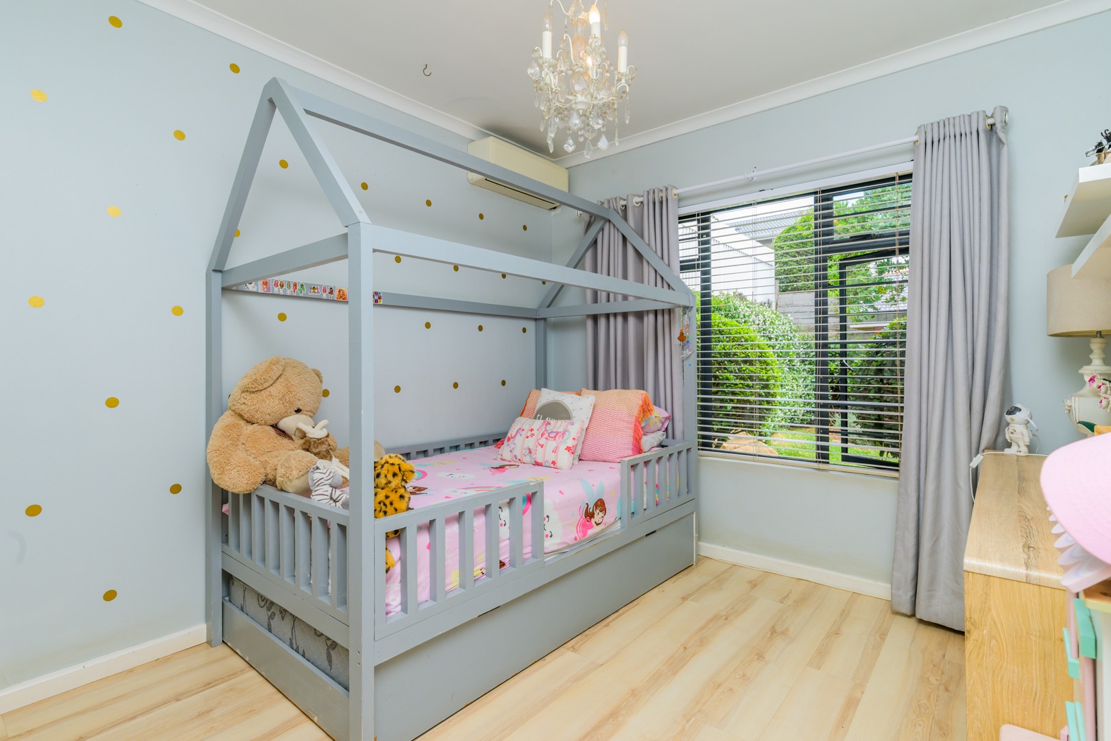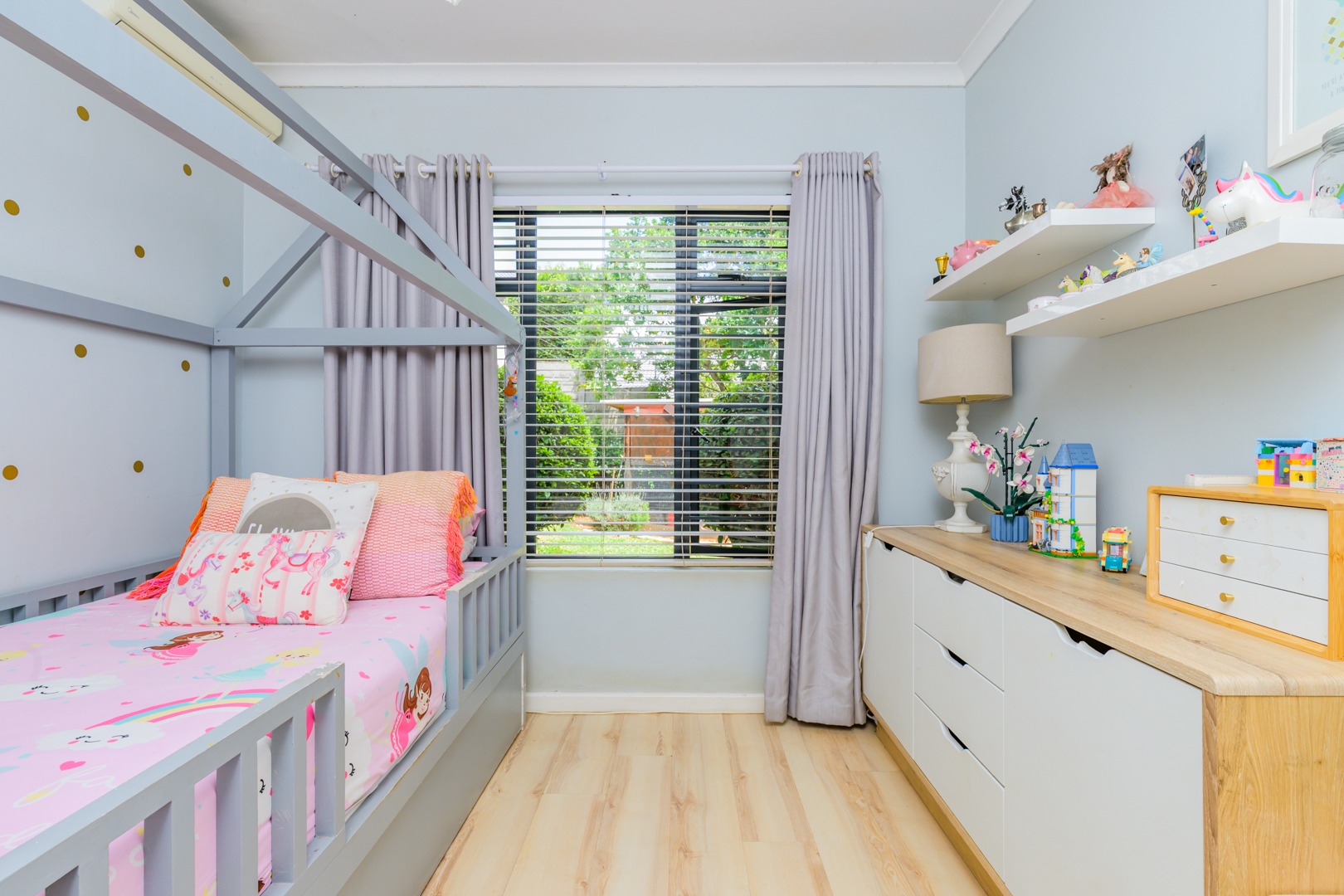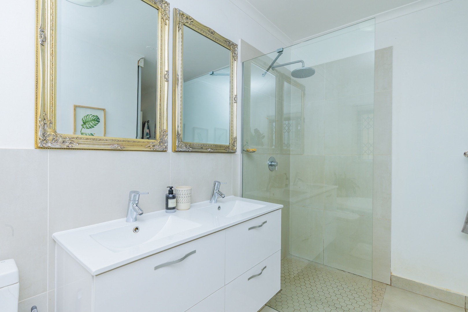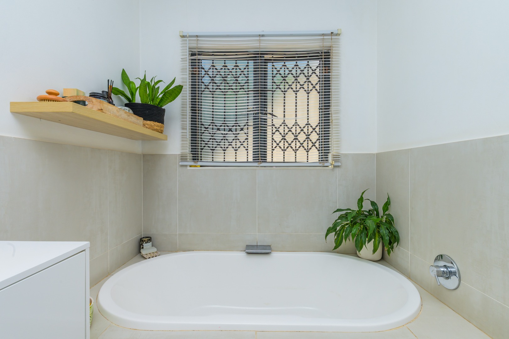 Downstairs are three spacious bedrooms. The main suite boasts a walk-in closet and a beautiful en-suite bathroom, as well as stack-back doors that open directly into the garden and pool area. A modern family bathroom services the additional bedrooms.