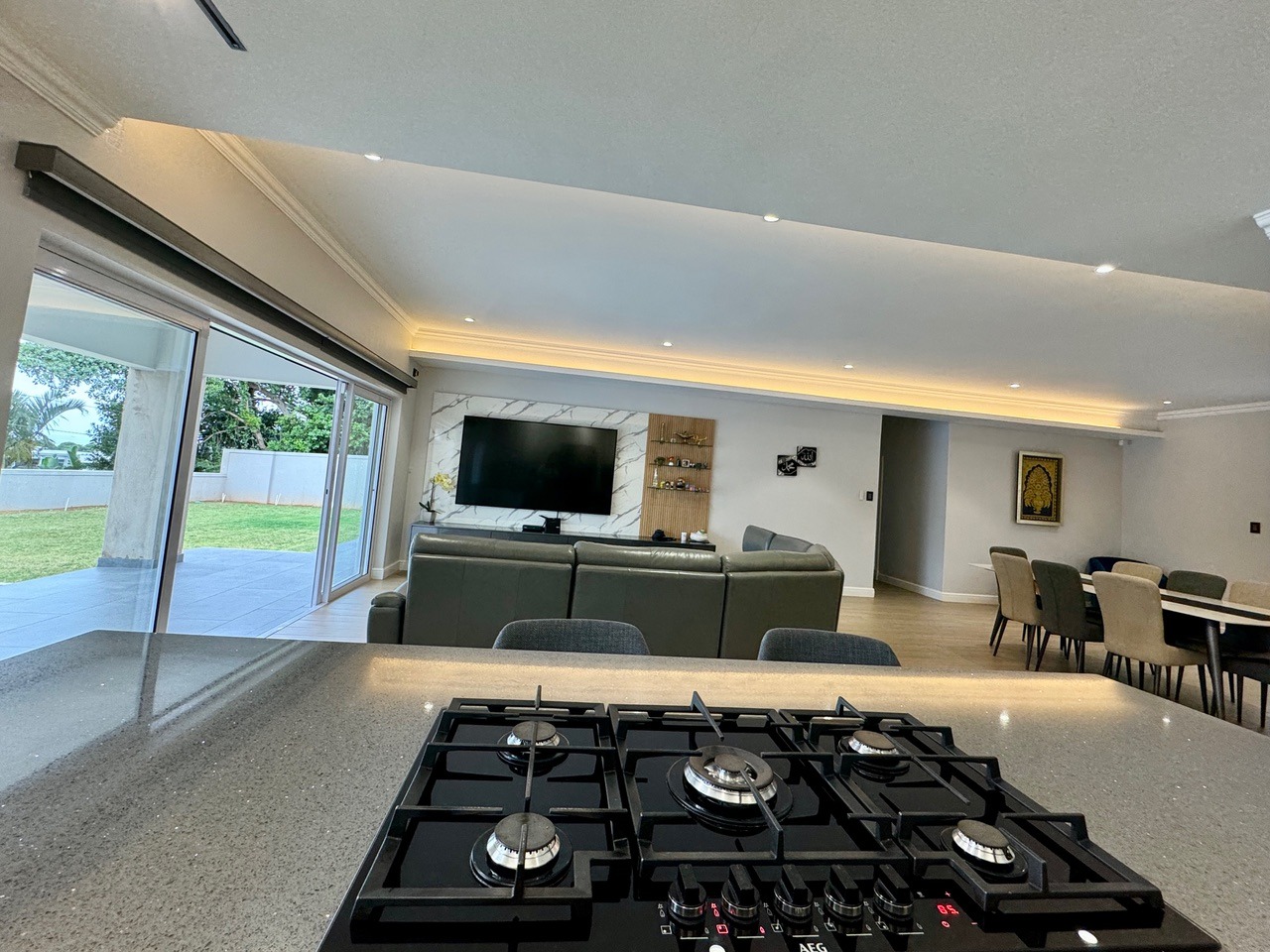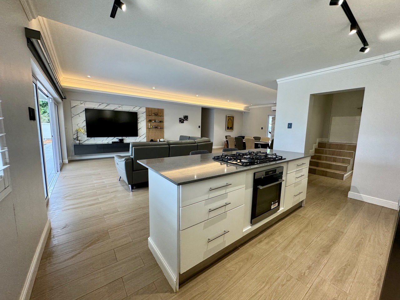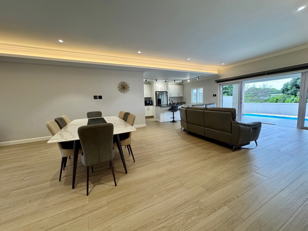 The open-plan lounge, dining room, and kitchen flow seamlessly onto a covered verandah overlooking the pool and level garden, ideal for entertaining and relaxed family living. The modern kitchen features a large scullery with direct access to the garage and back door for added convenience.