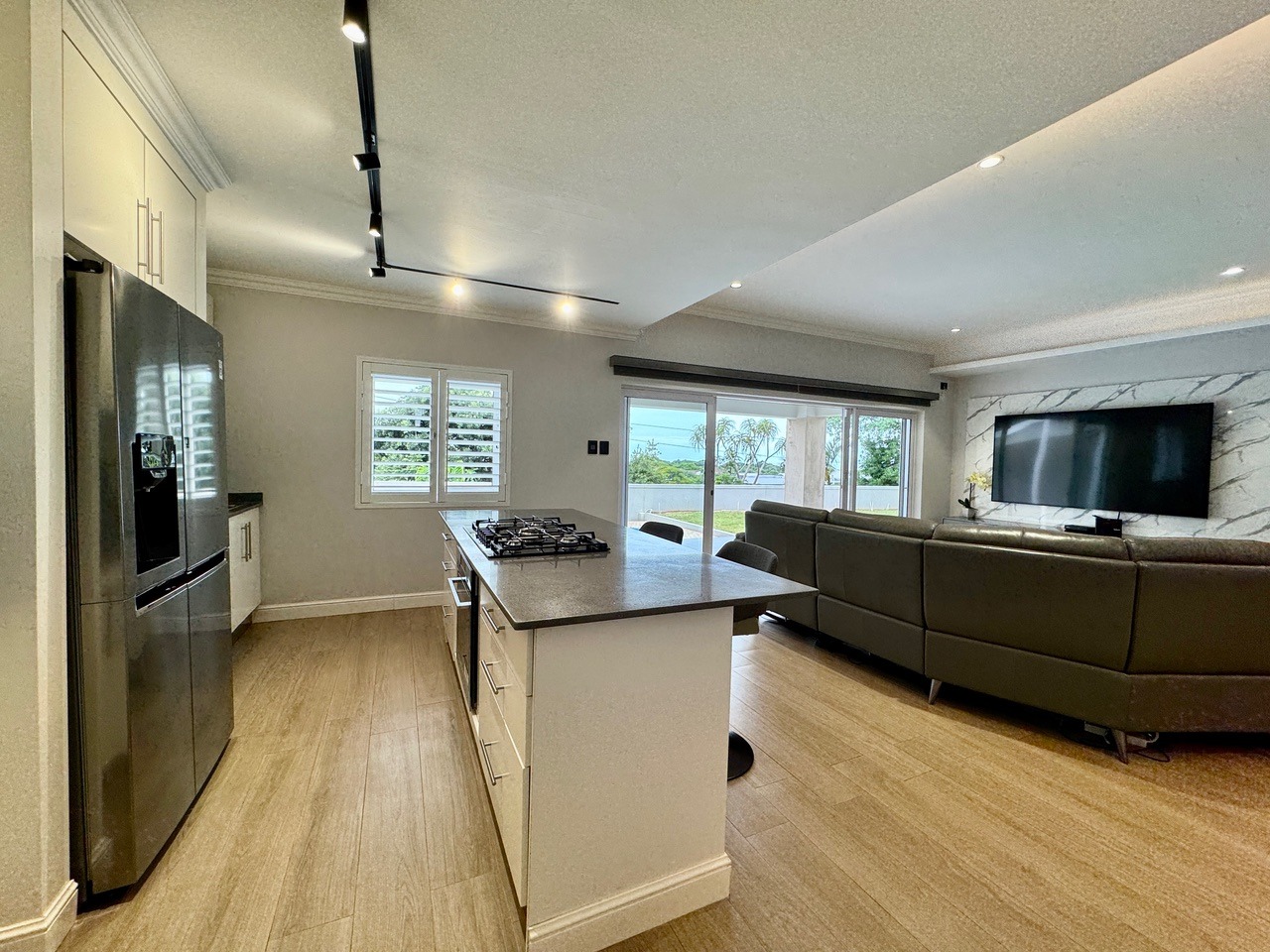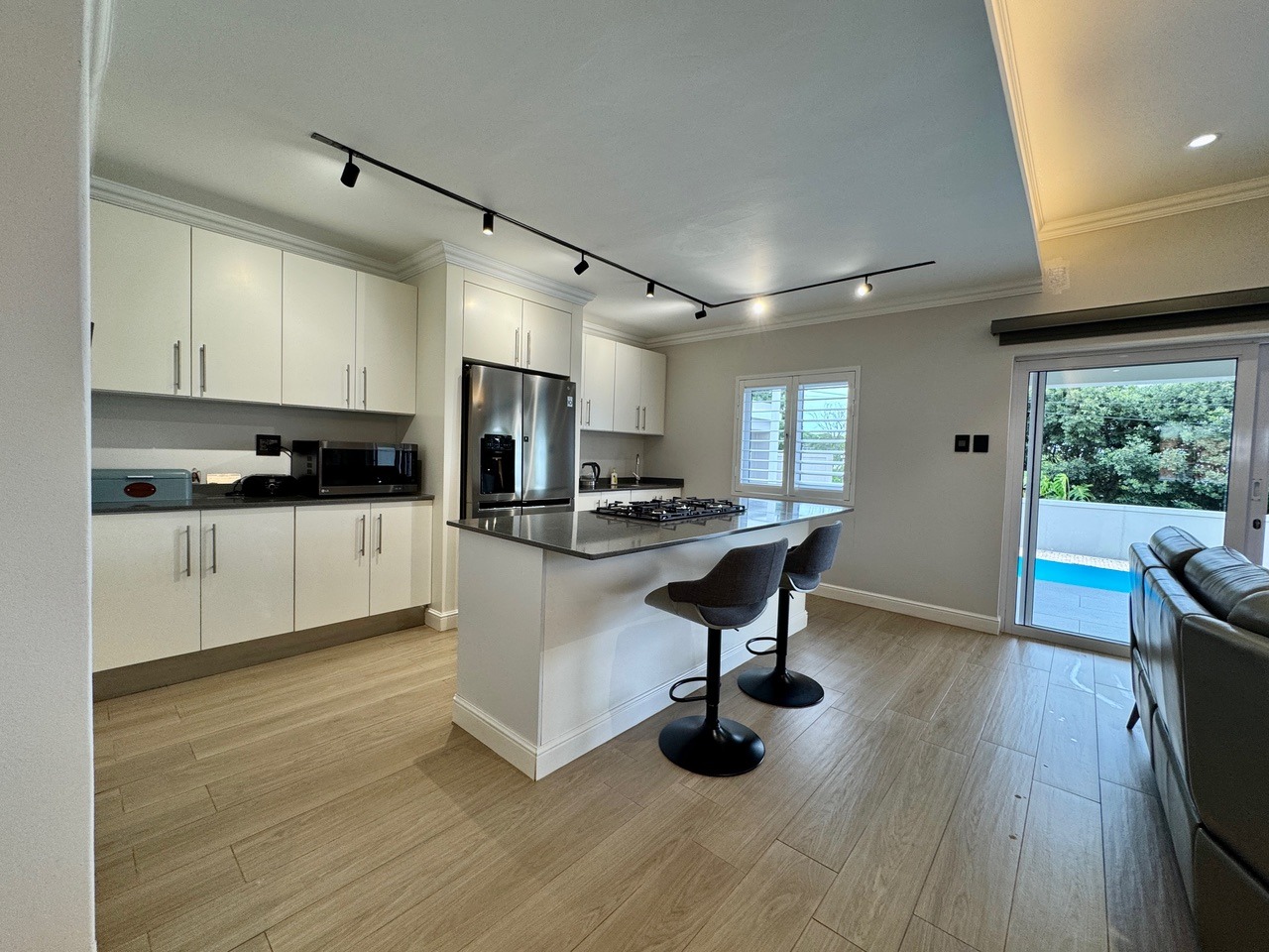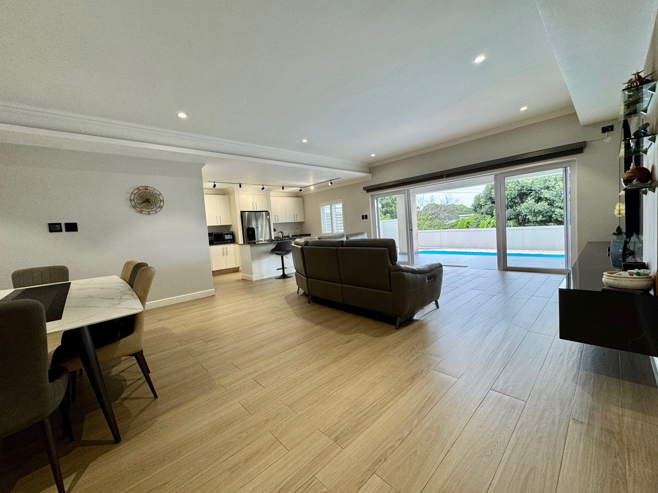 The open-plan lounge, dining room, and kitchen flow seamlessly onto a covered verandah overlooking the pool and level garden, ideal for entertaining and relaxed family living. The modern kitchen features a large scullery with direct access to the garage and back door for added convenience.