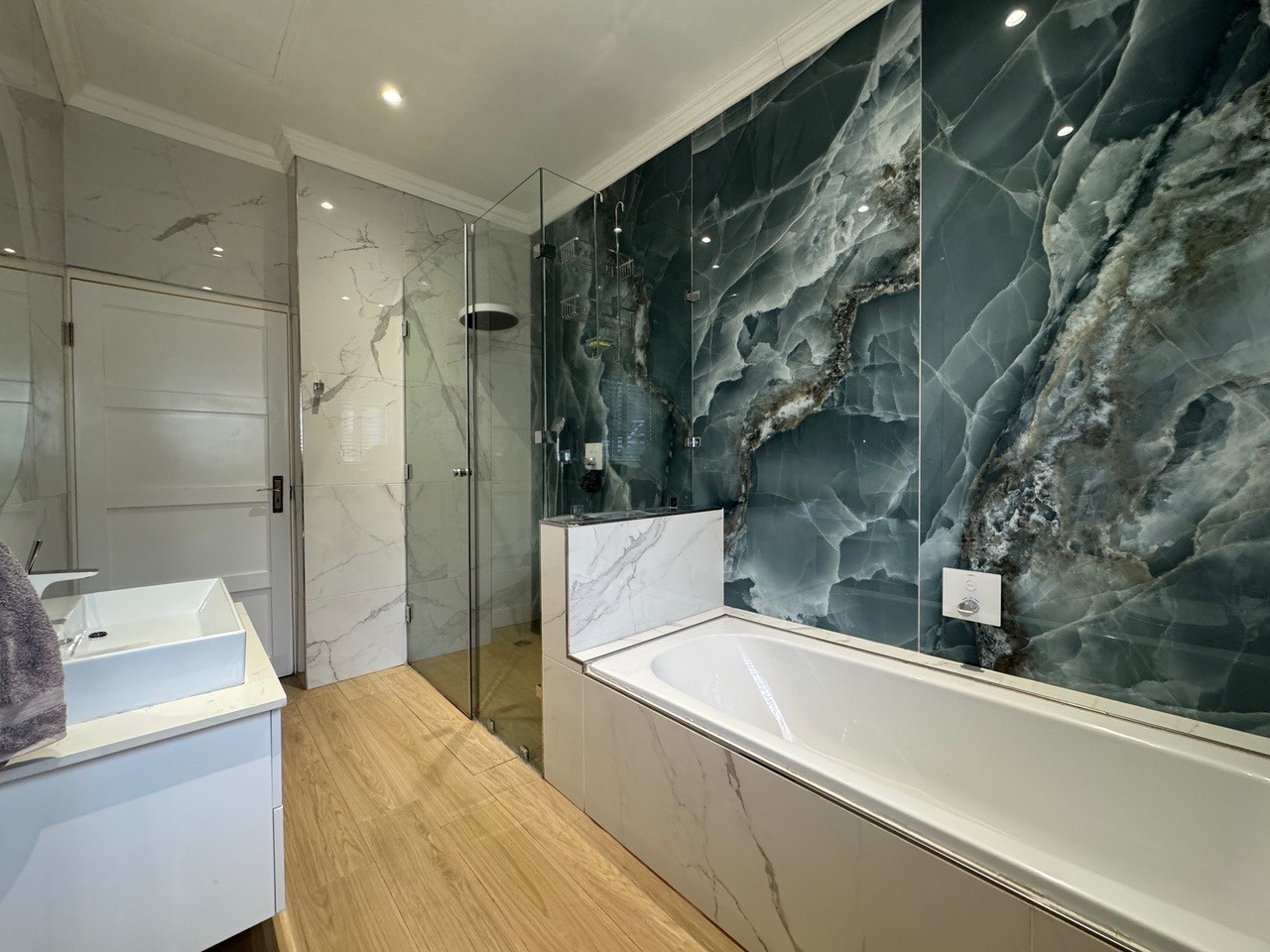 All bedrooms are spacious and well-appointed, with the main and second bedrooms opening directly onto the garden. The main suite boasts a walk-in dressing area and a stylish en-suite bathroom complete with a double shower and sunken bath. No expense has been spared in the finishes, in the remaining two bedrooms or the full family bathroom.