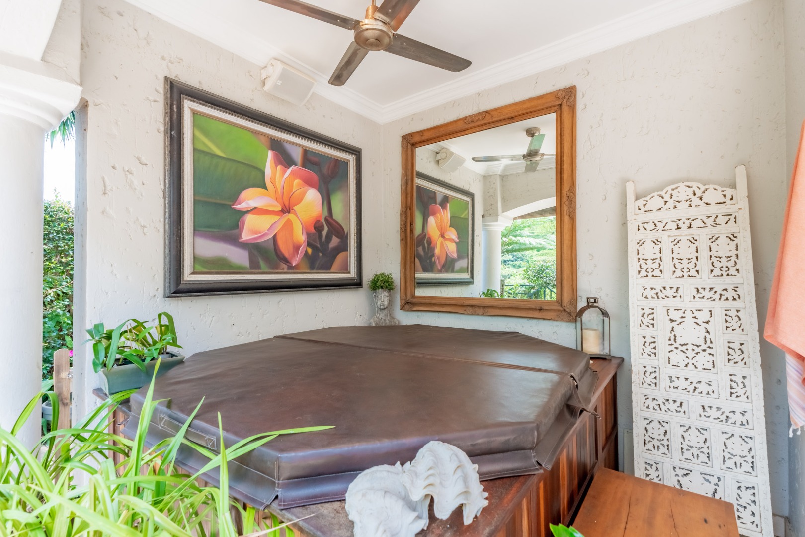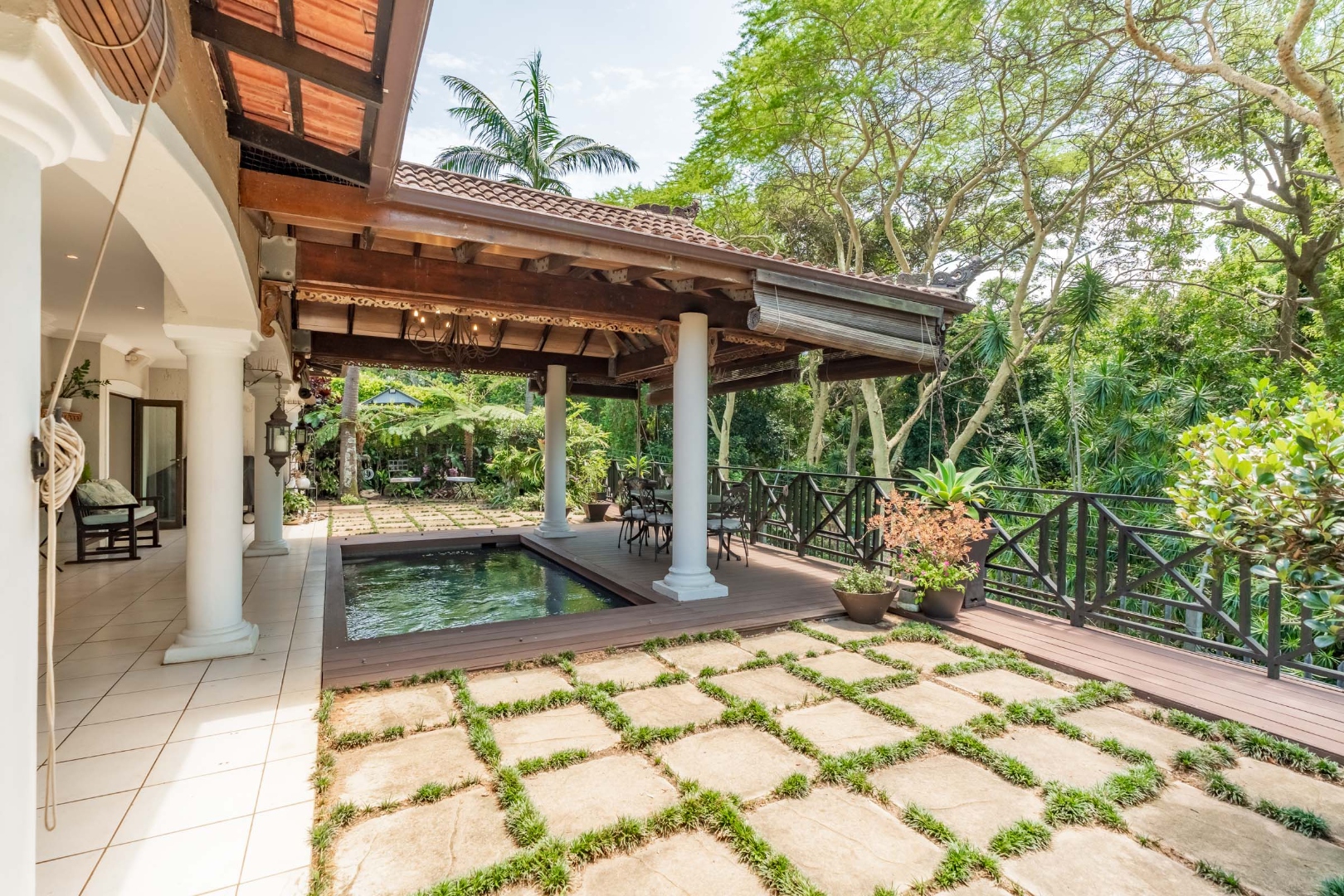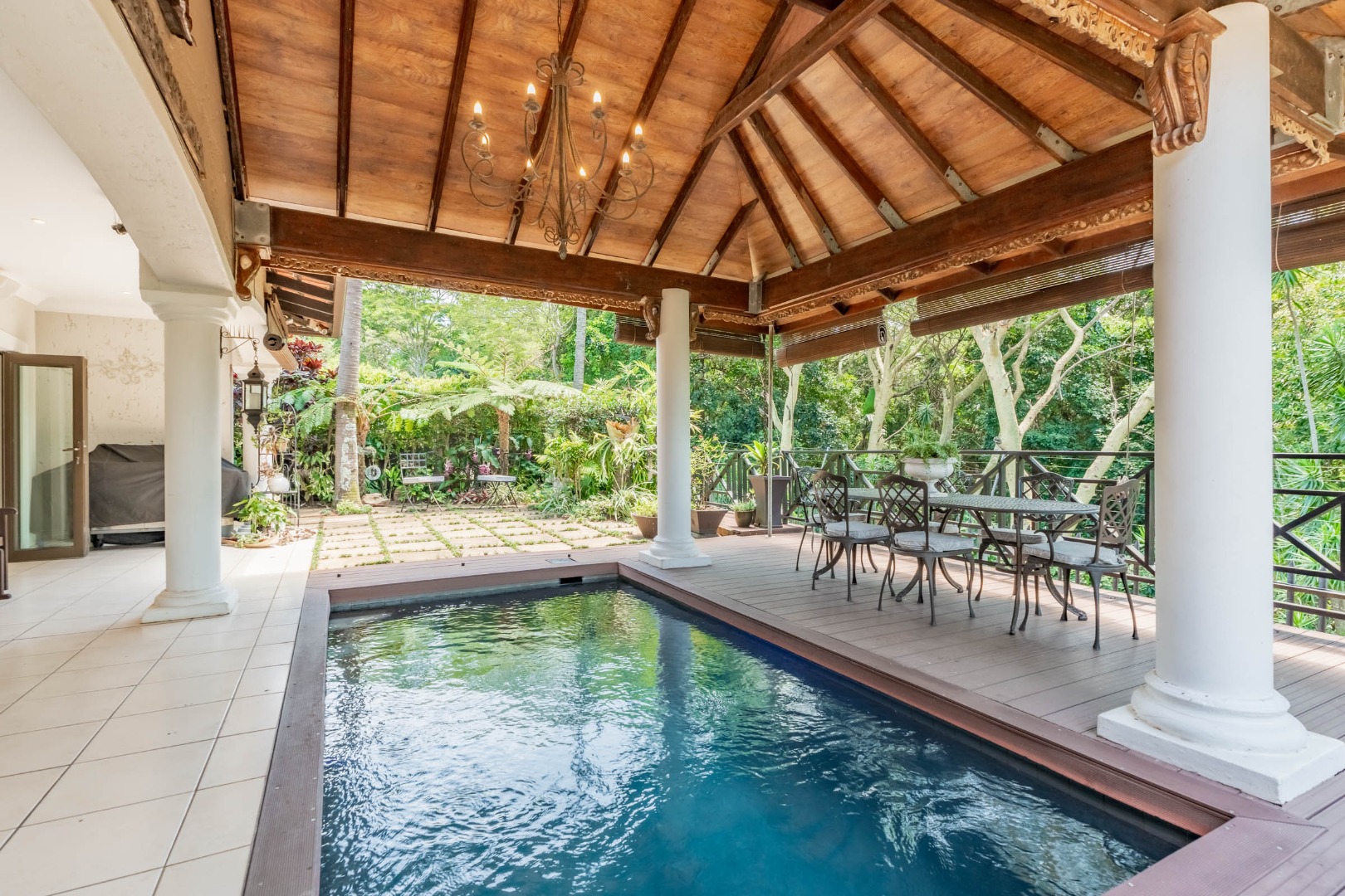 But the real magic happens outdoors! Imagine spending your days on the expansive covered patio, complete with a vaulted wooden ceiling and an integrated plunge pool – your private oasis for relaxation. The lush, tropical garden provides a serene backdrop, making it ideal for outdoor entertaining or simply unwinding. There's also a convenient outside toilet for guests.