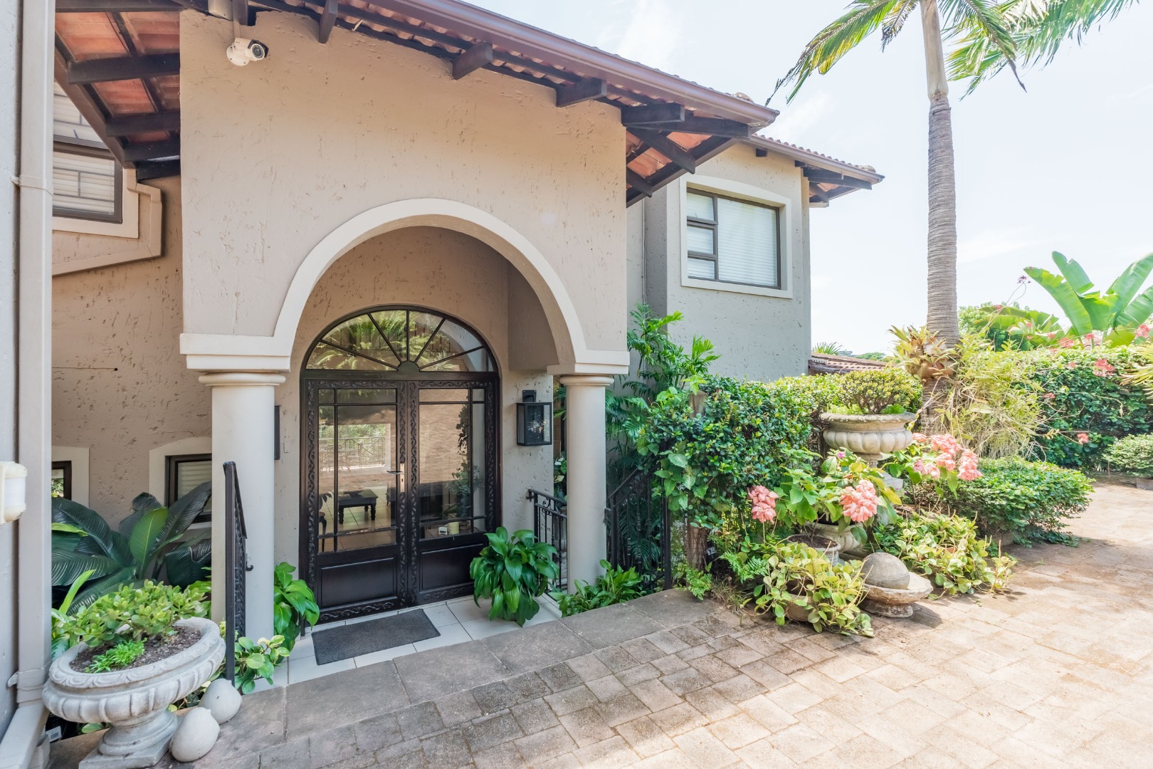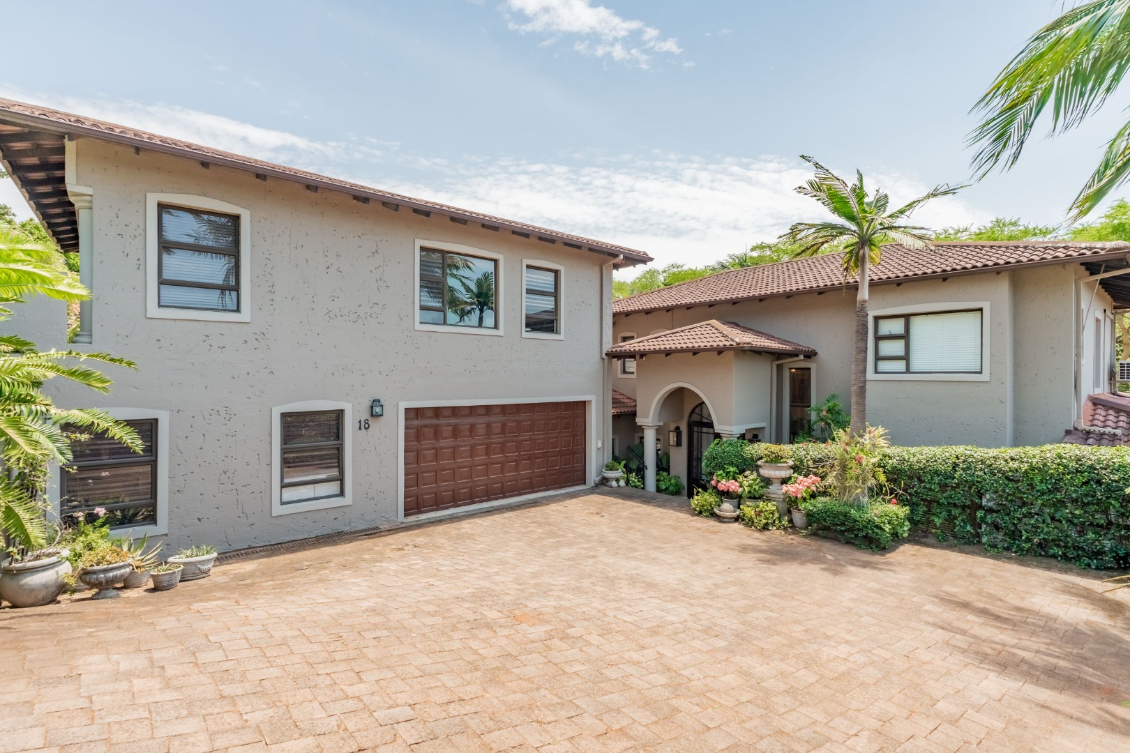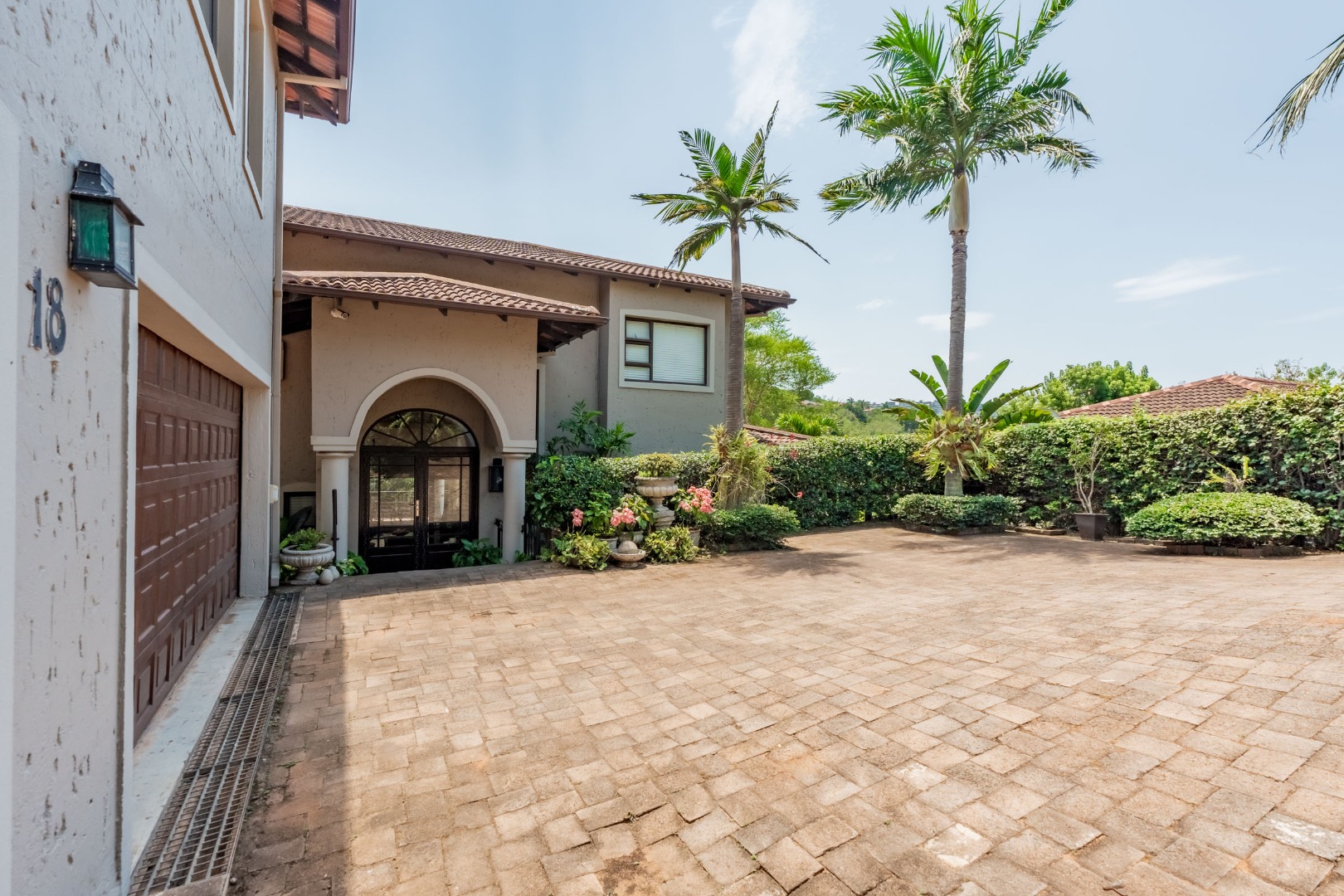 Step into your own slice of paradise in La Lucia! This charming Mediterranean-style home immediately welcomes you with its striking arched entrance, robust columns, and a large, paved driveway leading to an integrated double garage. Surrounded by lush, tropical landscaping and mature palm trees, the curb appeal is simply fantastic, setting the scene for a relaxed lifestyle.
