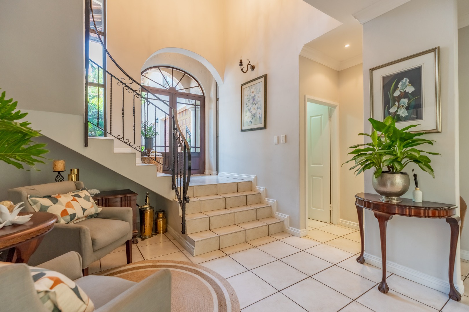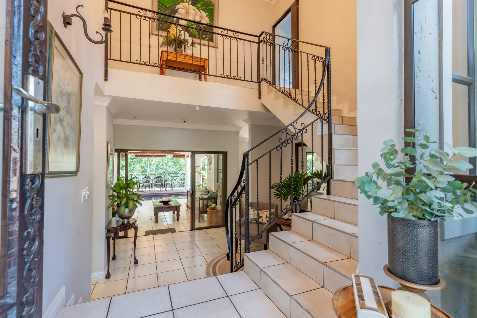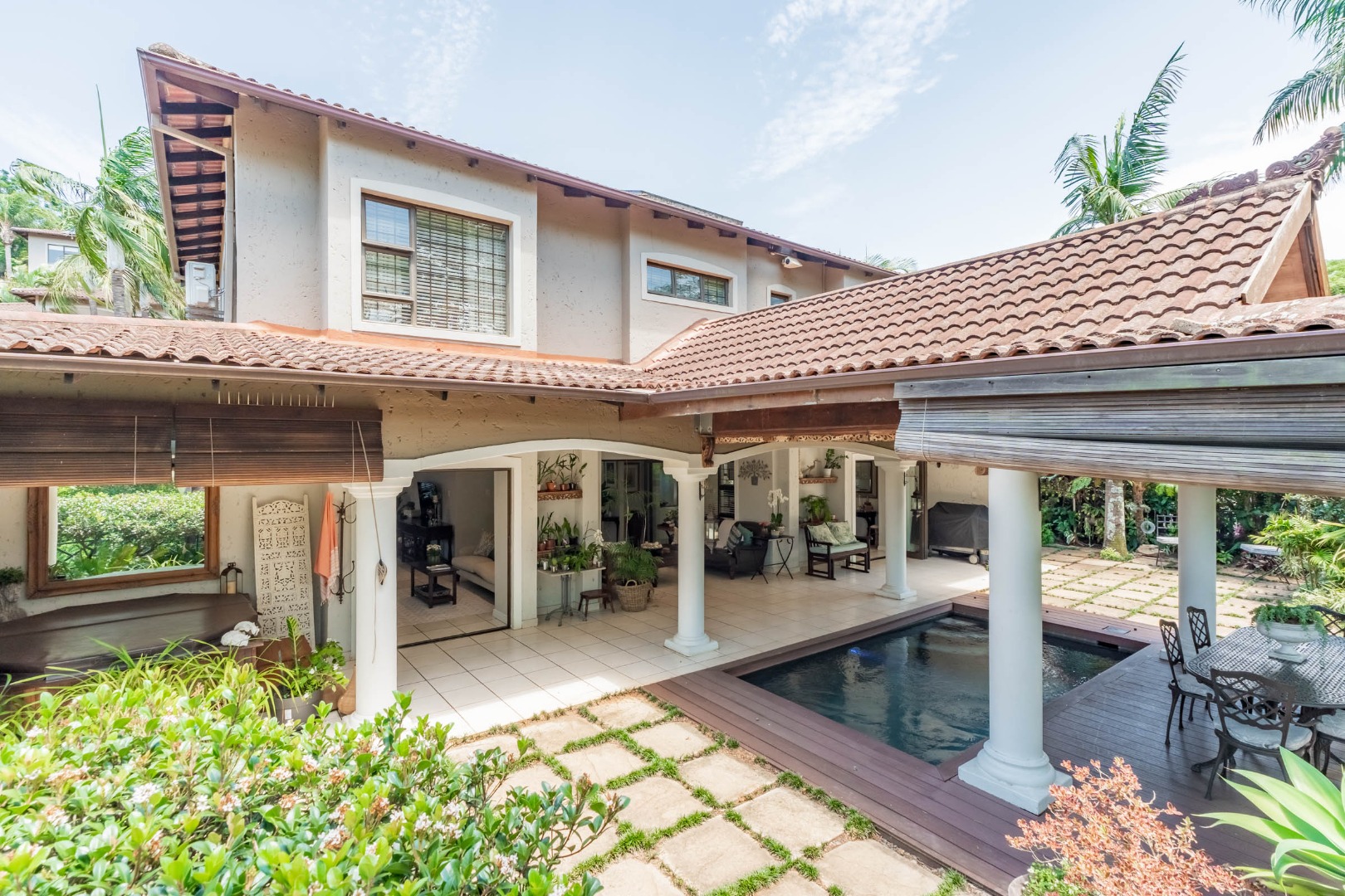 Step into your own slice of paradise in La Lucia! This charming Mediterranean-style home immediately welcomes you with its striking arched entrance, robust columns, and a large, paved driveway leading to an integrated double garage. Surrounded by lush, tropical landscaping and mature palm trees, the curb appeal is simply fantastic, setting the scene for a relaxed lifestyle.
