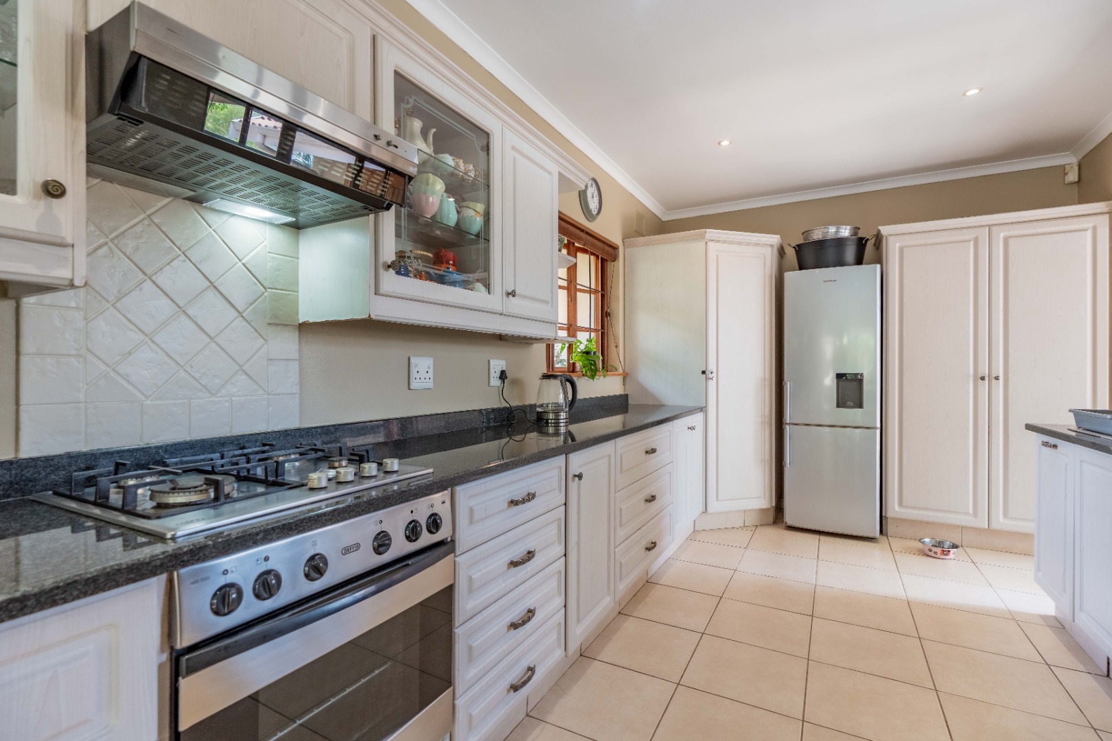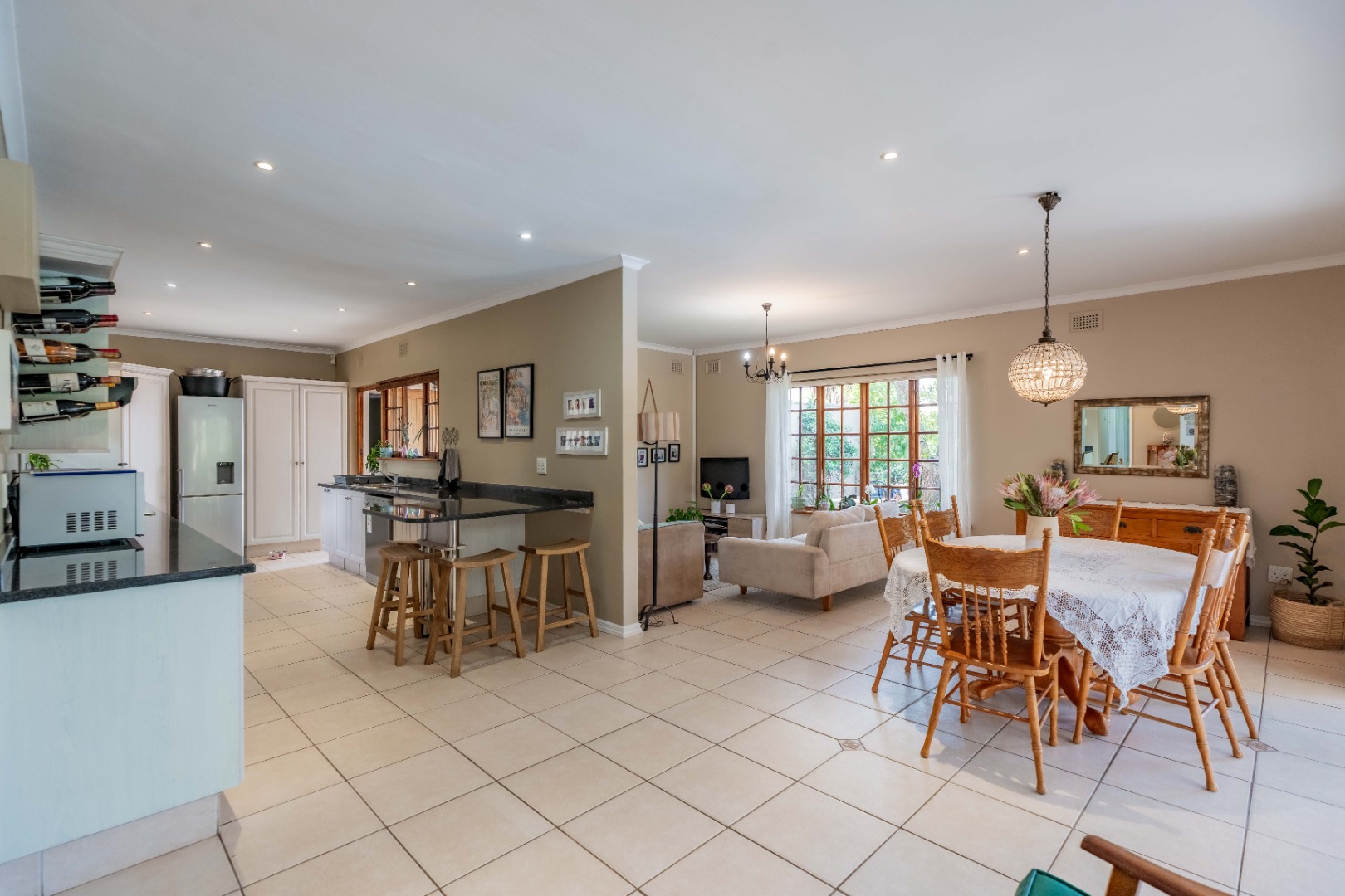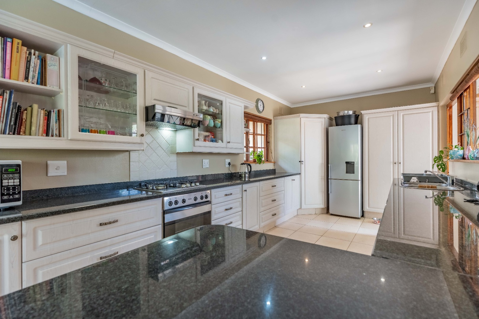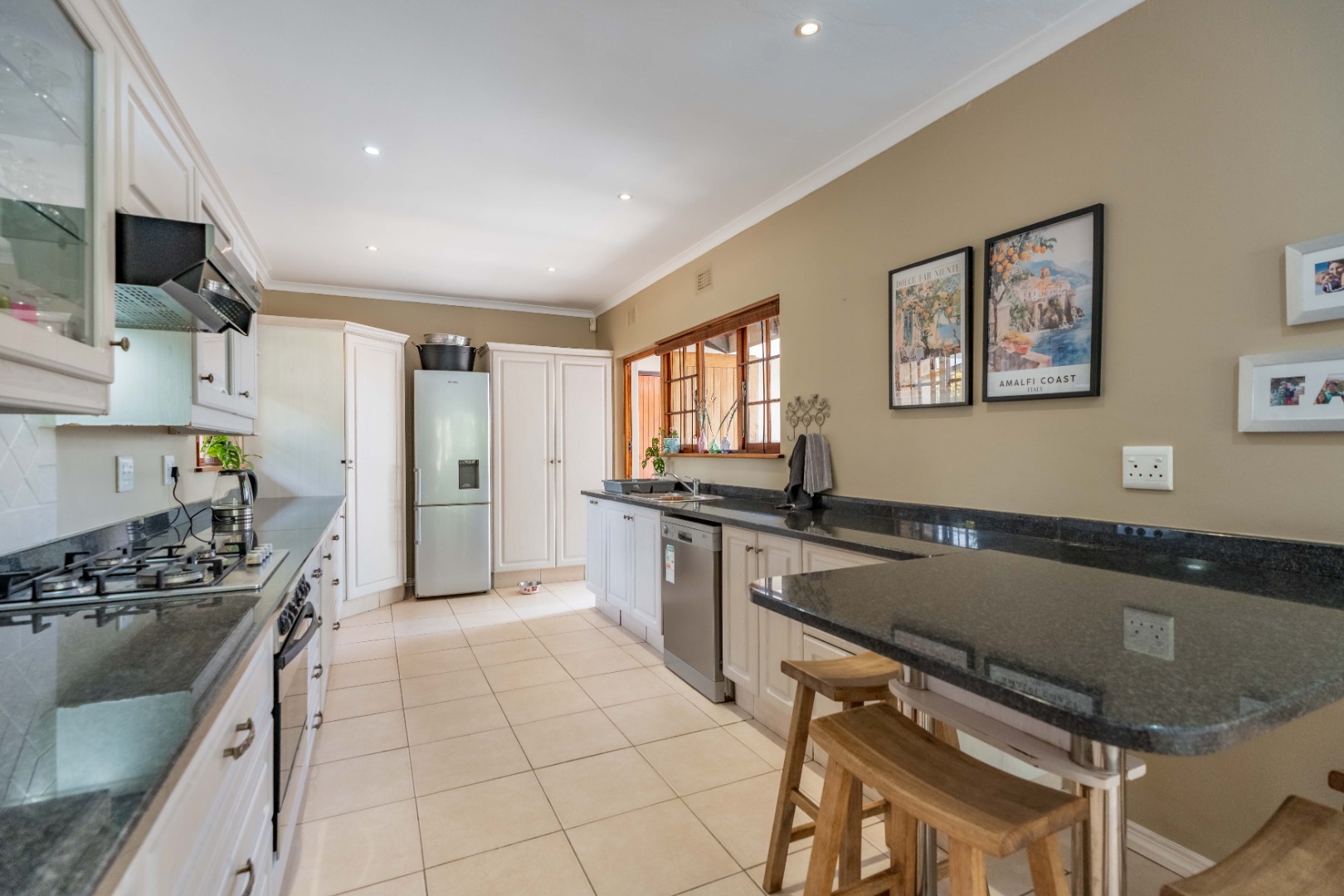 Step outside to a private garden with a sparkling swimming pool, built-in braai, and pizza oven—an entertainer’s delight. The home also offers staff quarters, a double garage, plus additional secure parking for up to six vehicles.