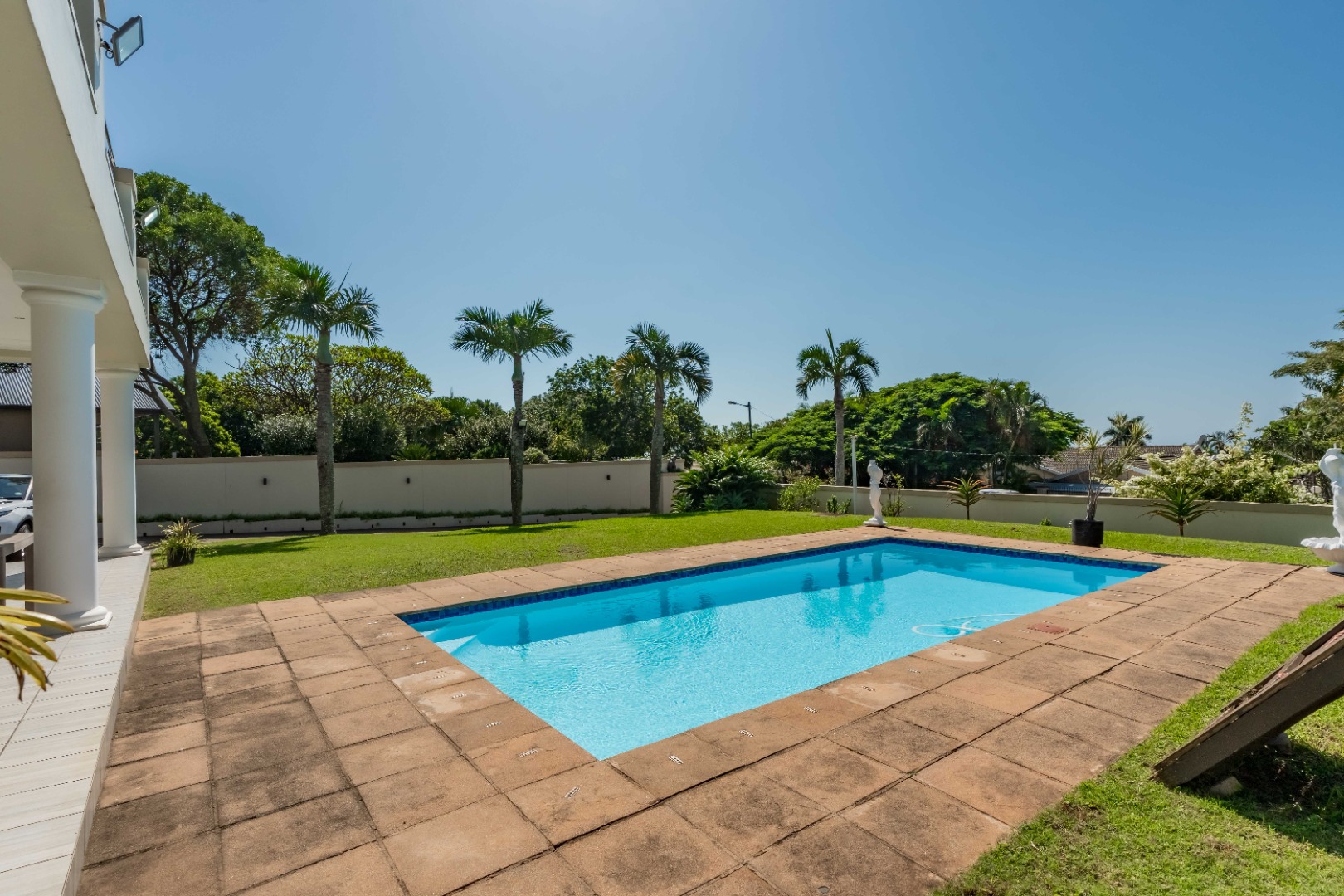outdoor area continues with a sparkling swimming pool, surrounded by meticulously landscaped gardens that create a tranquil retreat for relaxation