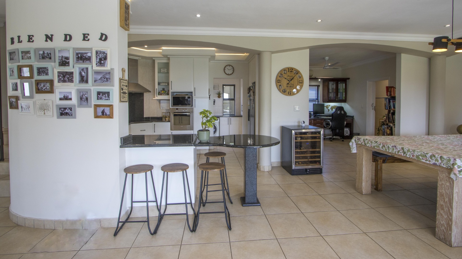 The home welcomes you with an inviting open-plan layout where light-filled interiors create a sense of space and flow. The kitchen connects seamlessly to the dining area, a lounge, and a casual family space – all opening onto a covered patio. Here, indoor-outdoor living comes to life with views of the lush private garden and sparkling pool, creating the perfect setting for entertaining or relaxed family time.