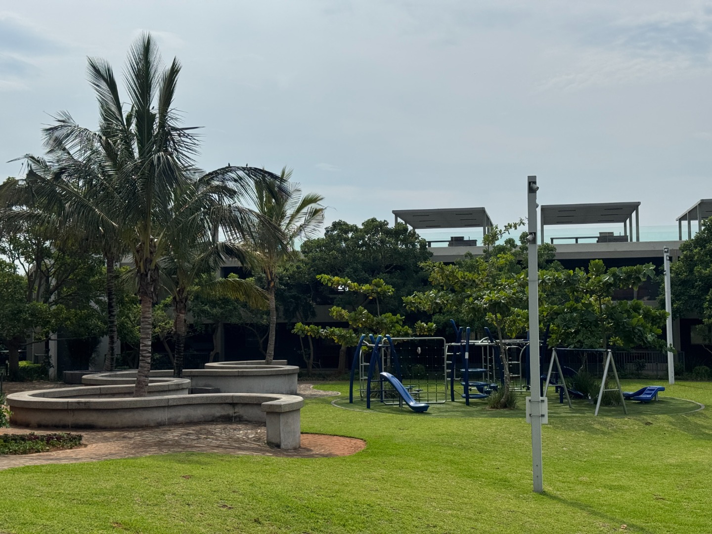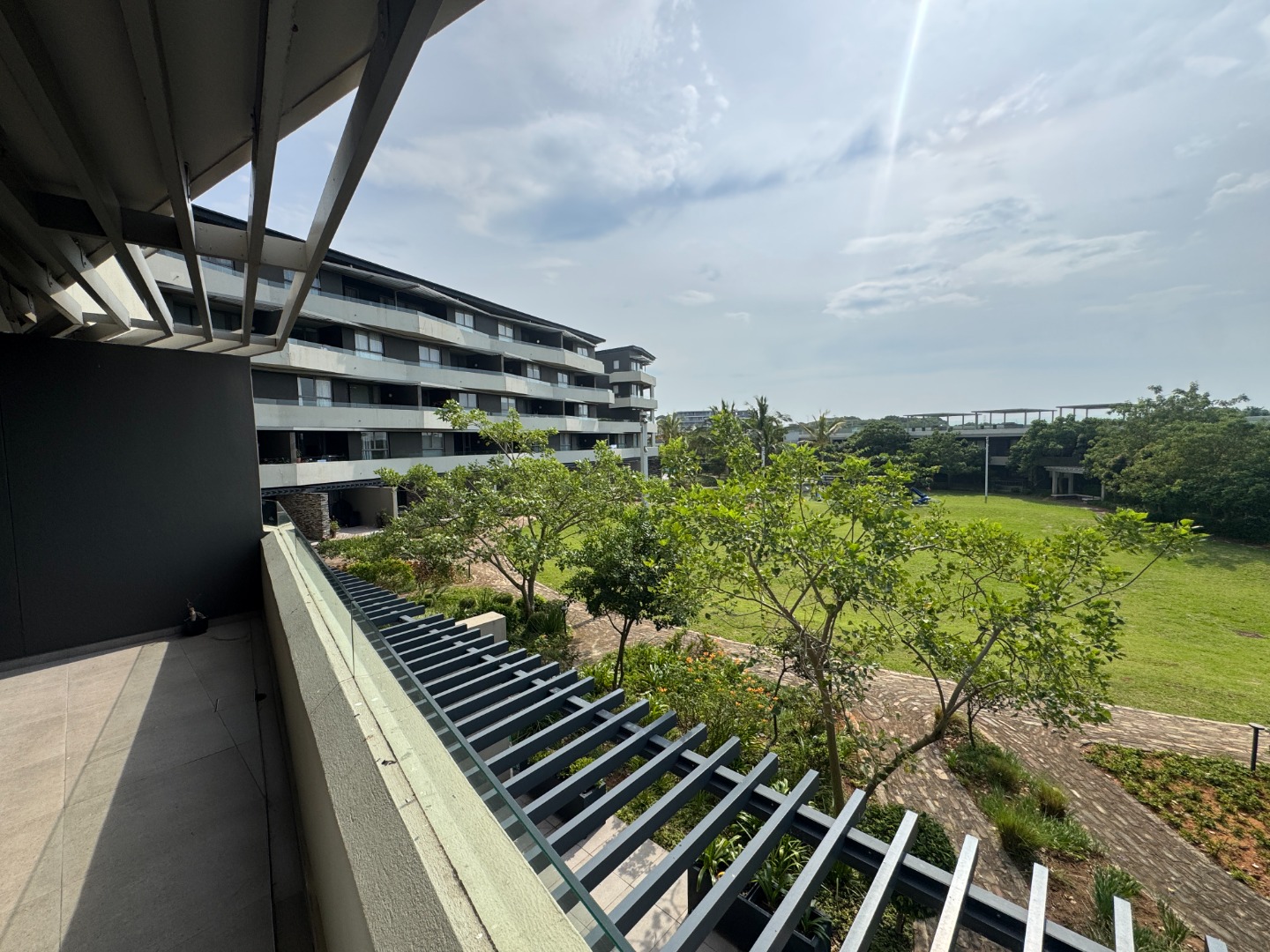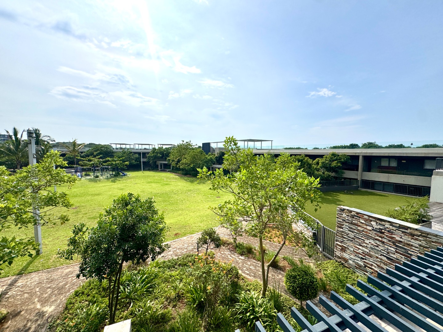 The single level apartment faces north which makes it bright and airy. The open plan kitchen, dining room and lounge flow onto a covered balcony overlooking the lush grounds with the play area in the distance.