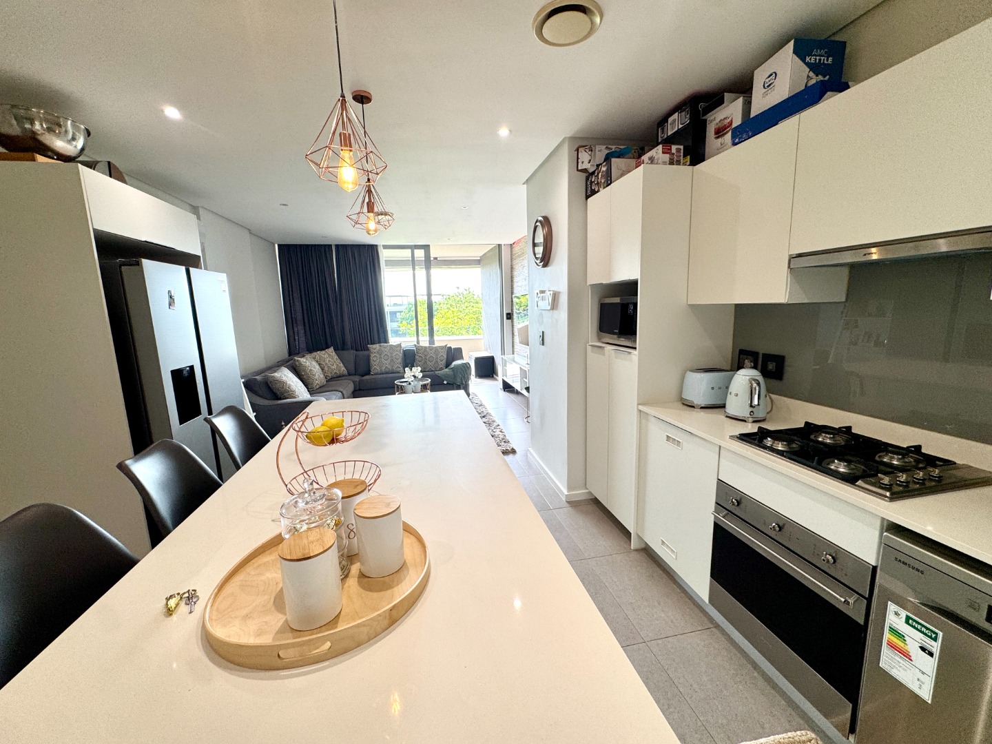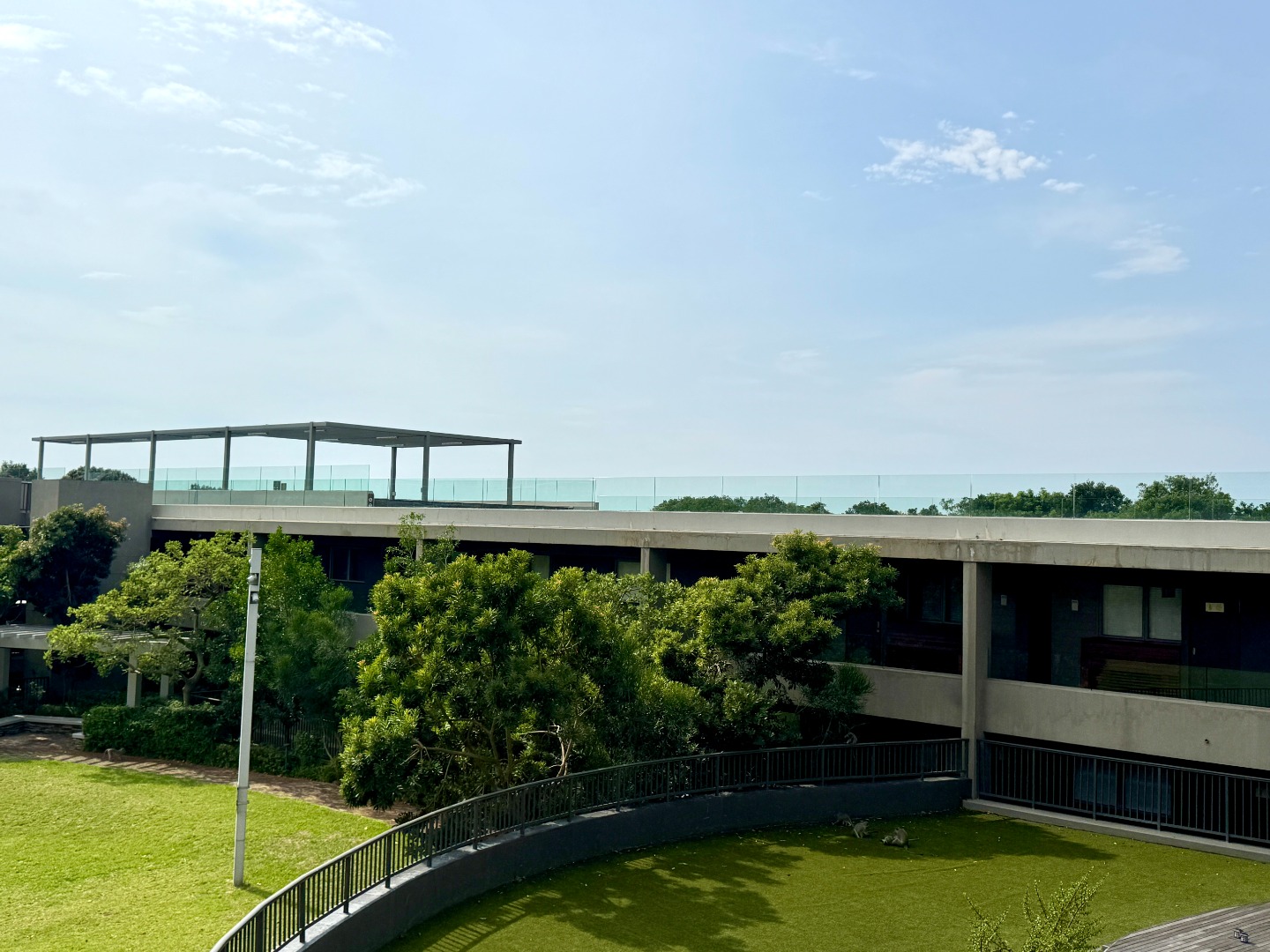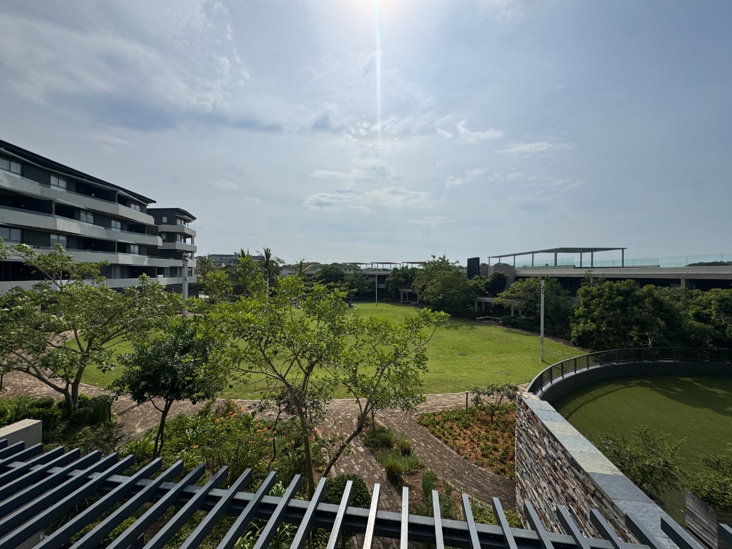 The single level apartment faces north which makes it bright and airy. The open plan kitchen, dining room and lounge flow onto a covered balcony overlooking the lush grounds with the play area in the distance.
