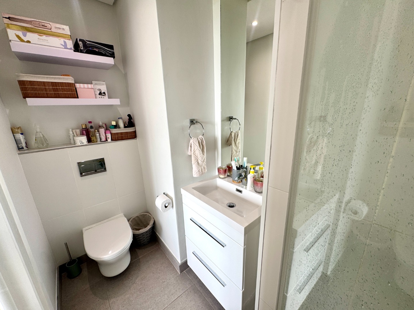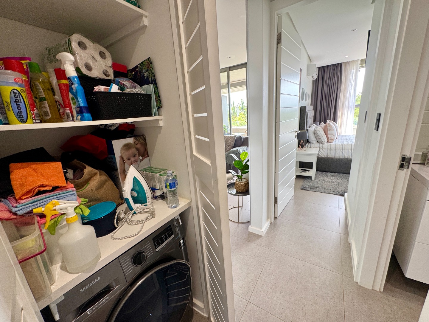 The main bedroom is en-suite, and the second bedroom has a separate bathroom. Both bedrooms are air-conditioned. There is a dedicated laundry area housing the washing machine and tumble dryer. There are two undercover parking places.