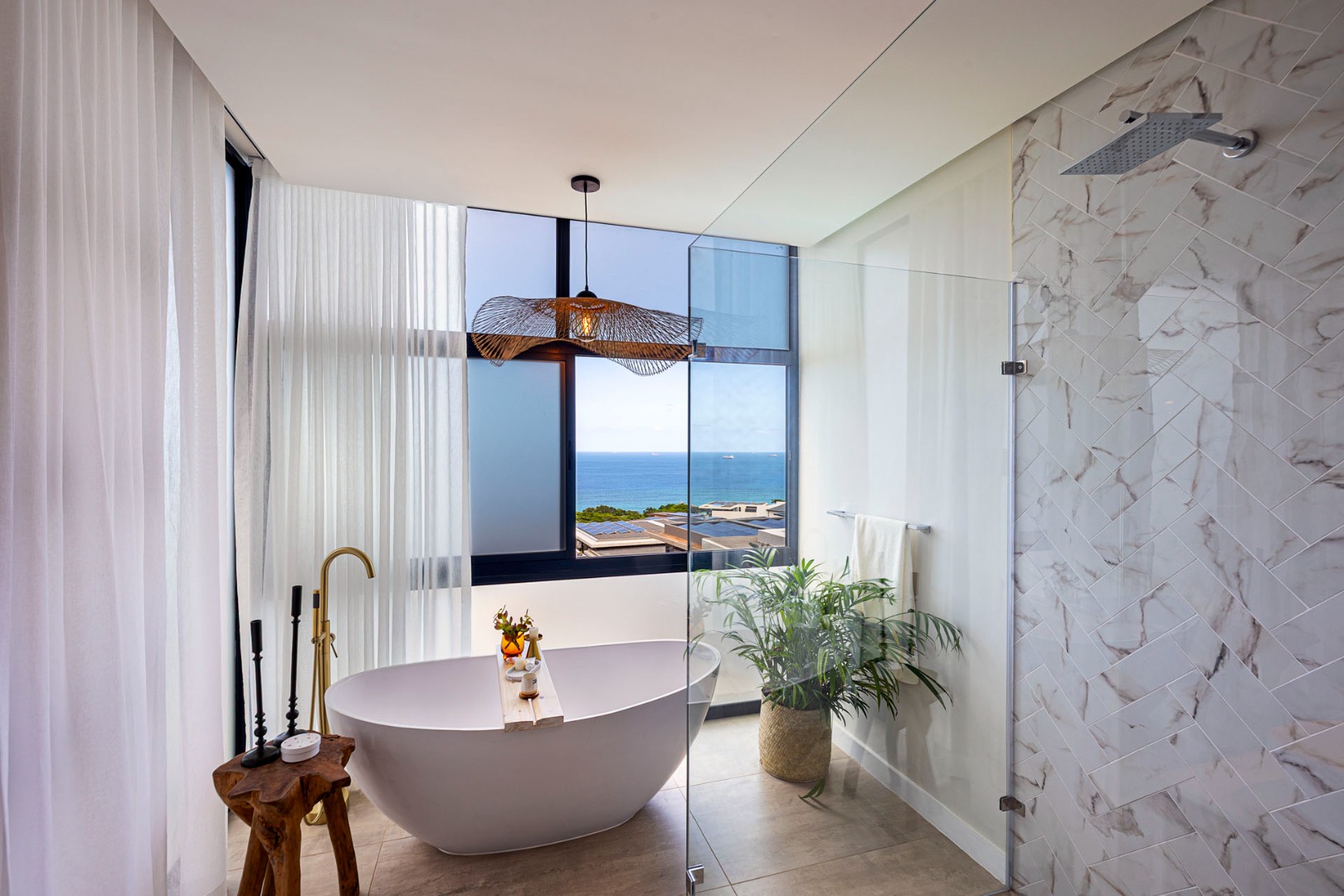 The floating staircase to the main bedroom is set against a wall of frosted window panels, bringing additional light into the already bright and airy home. There are two bedrooms downstairs with pool and sea views and the master bedroom has amazing sole upstairs positioning, with uninterrupted sea and coastline views.