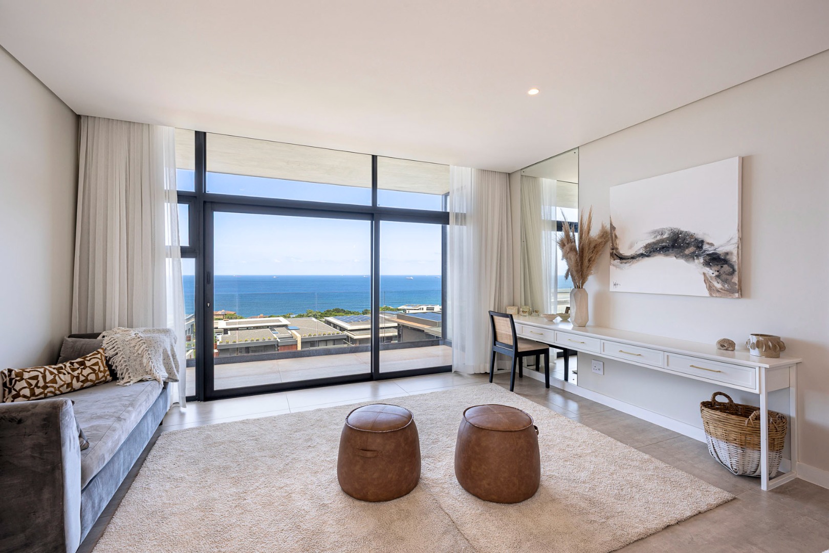 The open plan kitchen, dining room and lounge, flow effortlessly onto the entertainment area, with garden and pool and spectacular sea views. The kitchen has a spacious scullery, leading onto a utility courtyard. Walls of the guest toilet and several other walls have been adorned with beautiful wallpaper and there is a custom-made TV unit as well as work station table and drawers built-in to the home.