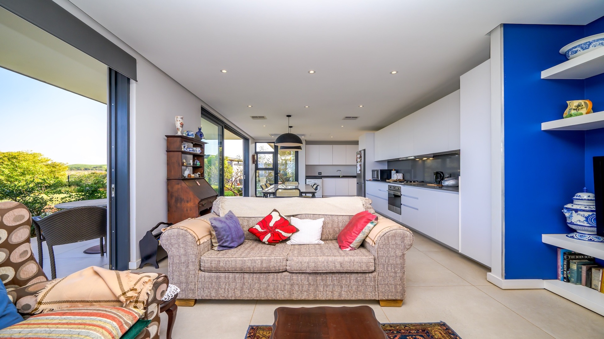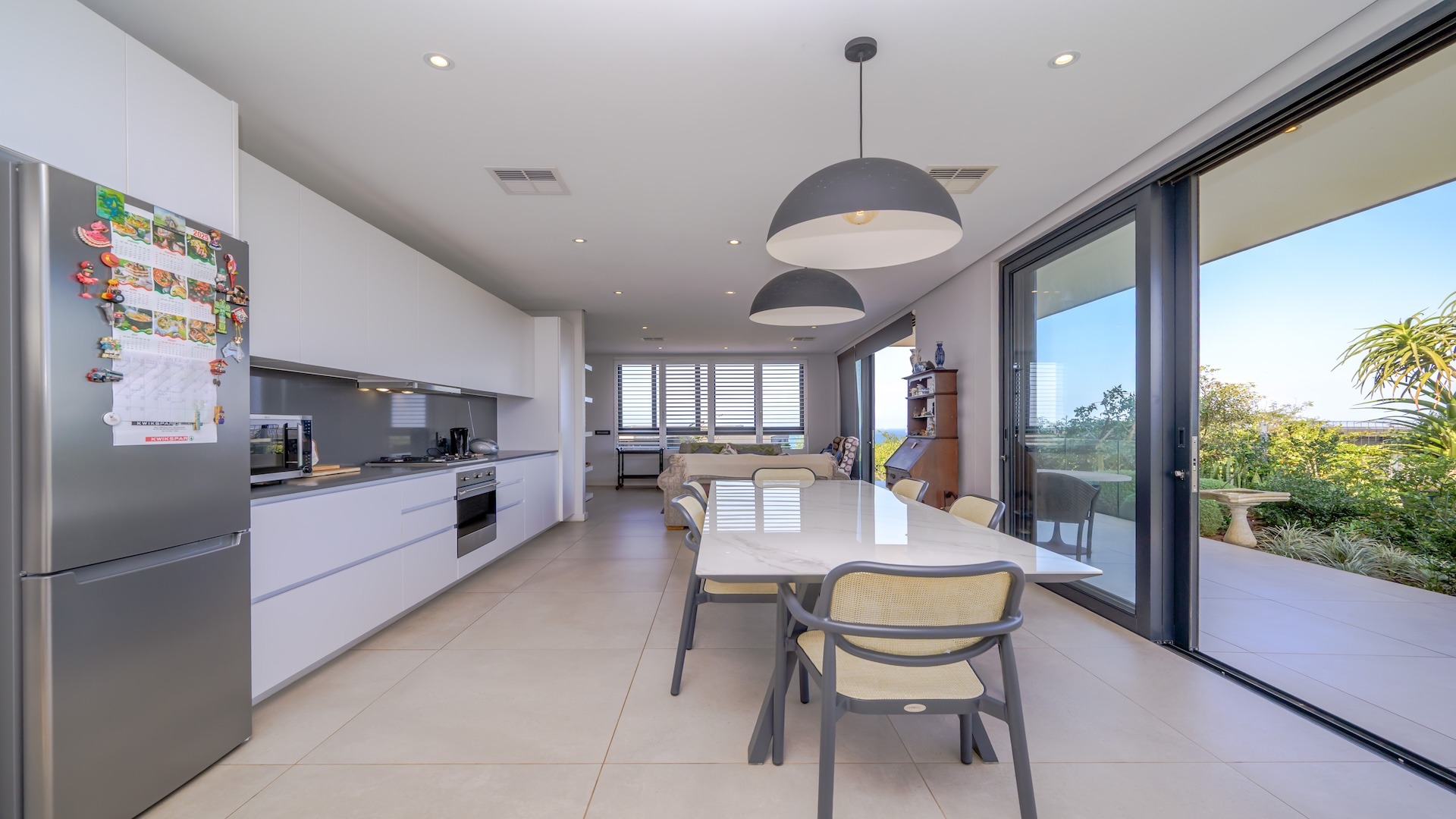 There are three en-suite bedroom homes, two of which are upstairs and the third on the ground floor. The open plan kitchen, dining room and lounge flow onto a patio and there is also a guest toilet. The long driveway up the side of the house, makes this home wheelchair friendly. This home has battery back-up for load-shedding.