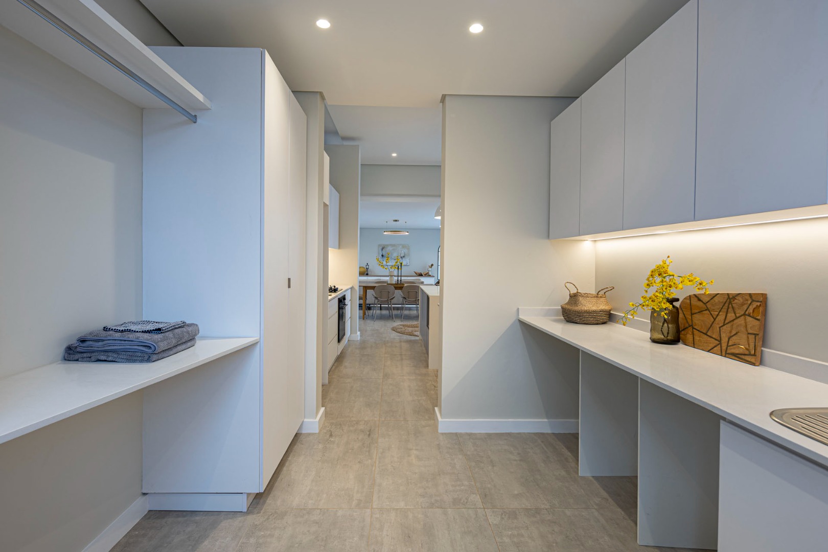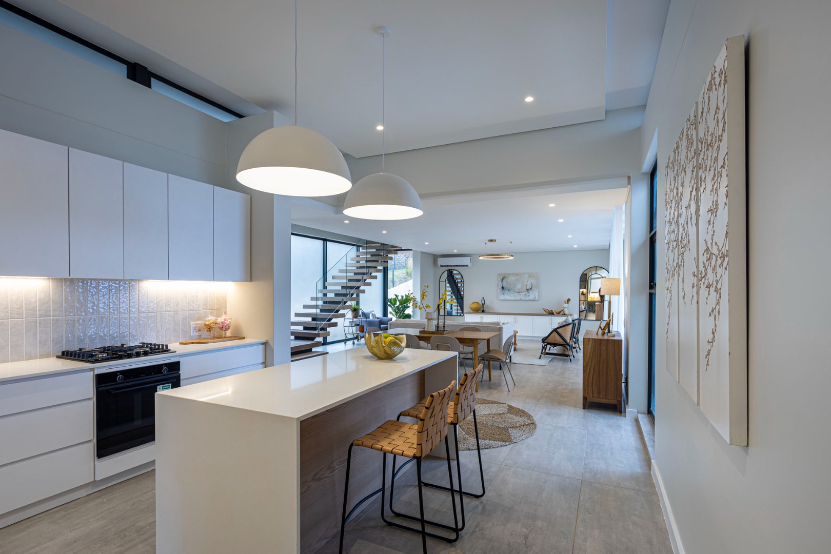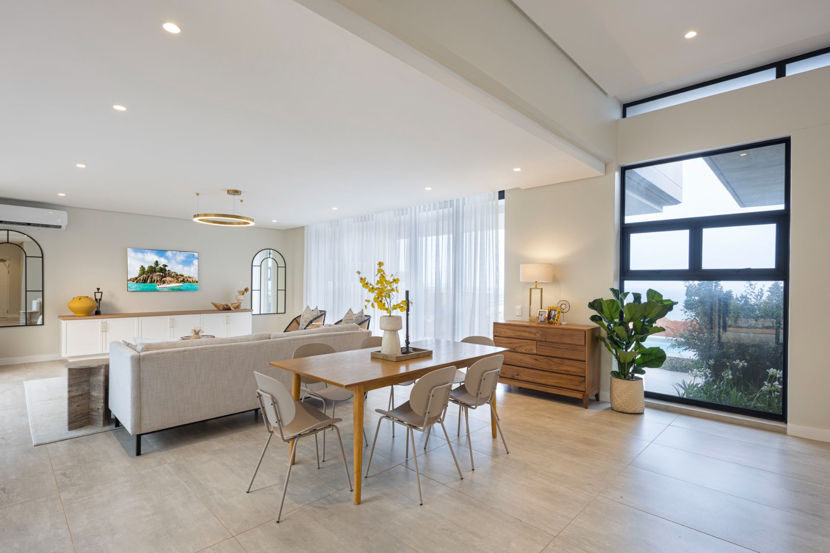 The open plan kitchen, dining room and lounge, flow effortlessly onto the entertainment area, with garden and pool and spectacular sea views. The kitchen has a spacious scullery, leading onto a utility courtyard. Walls of the guest toilet and several other walls have been adorned with beautiful wallpaper and there is a custom-made TV unit as well as work station table and drawers built-in to the home.