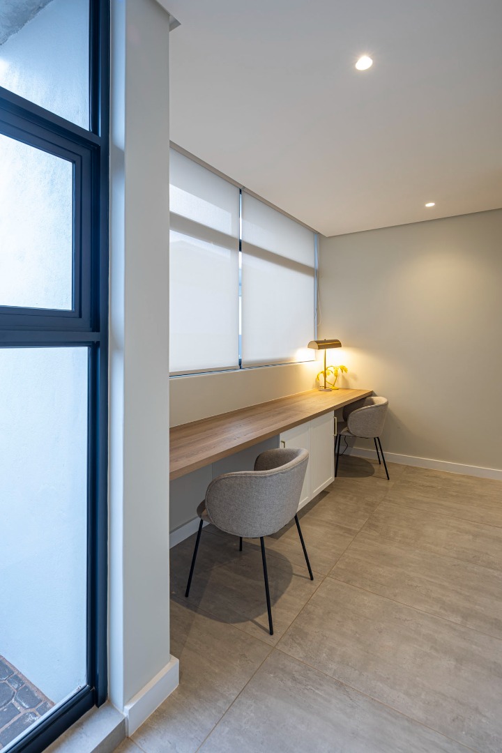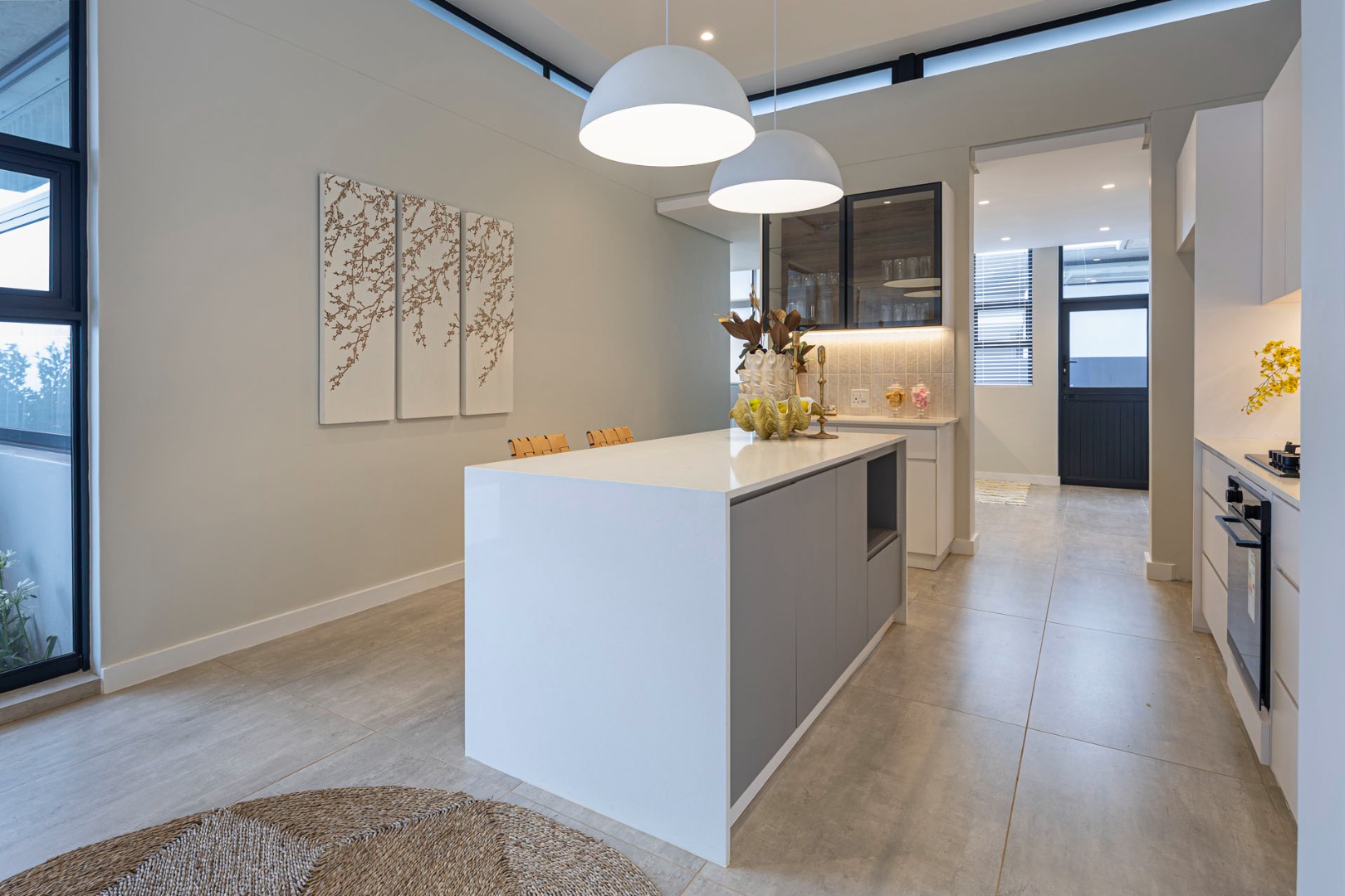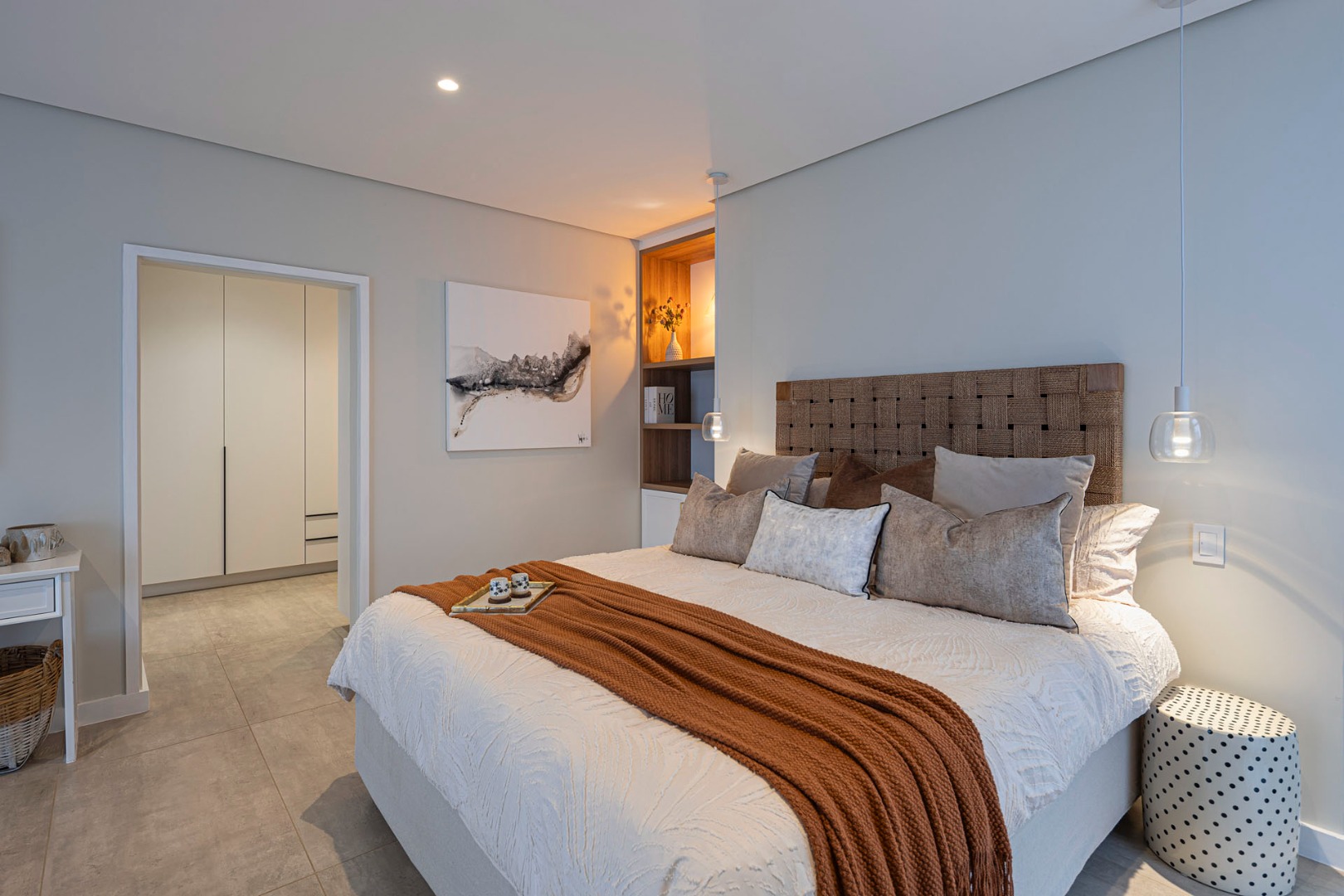 The open plan kitchen, dining room and lounge, flow effortlessly onto the entertainment area, with garden and pool and spectacular sea views. The kitchen has a spacious scullery, leading onto a utility courtyard. Walls of the guest toilet and several other walls have been adorned with beautiful wallpaper and there is a custom-made TV unit as well as work station table and drawers built-in to the home.
