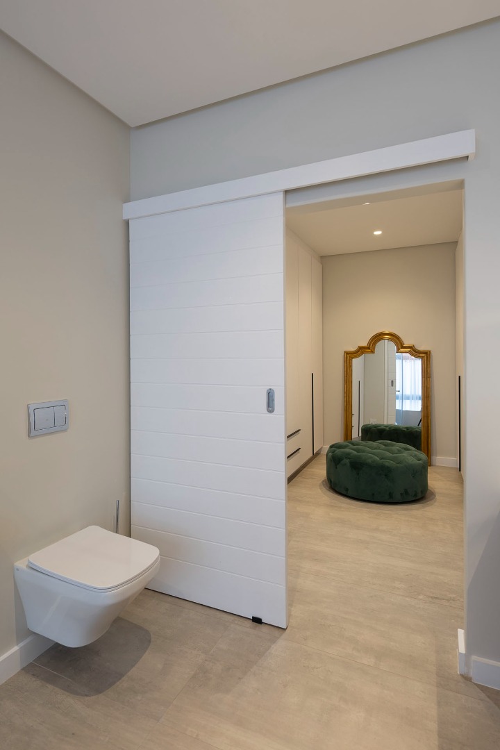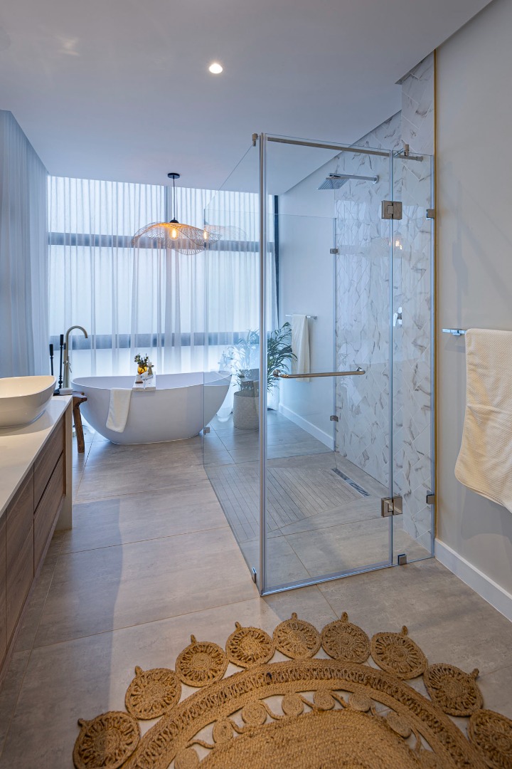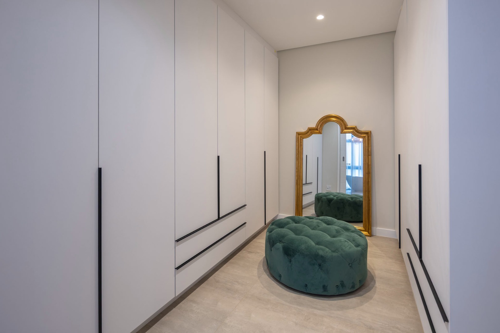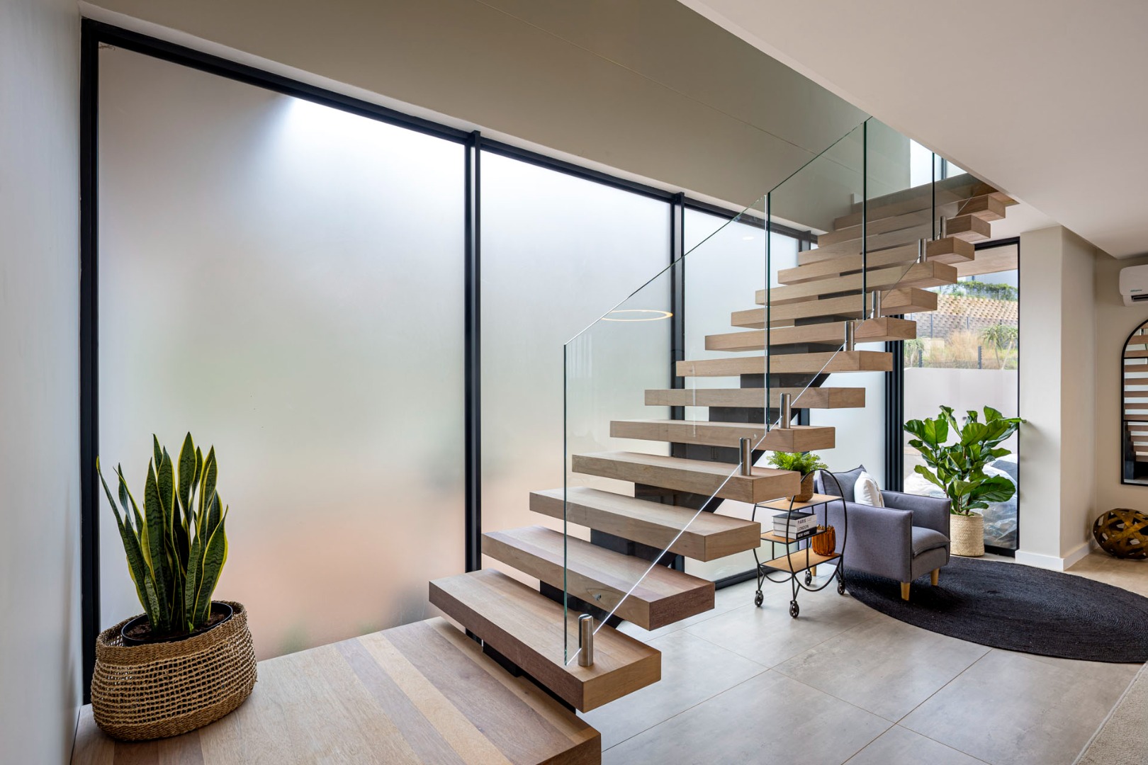 The floating staircase to the main bedroom is set against a wall of frosted window panels, bringing additional light into the already bright and airy home. There are two bedrooms downstairs with pool and sea views and the master bedroom has amazing sole upstairs positioning, with uninterrupted sea and coastline views.