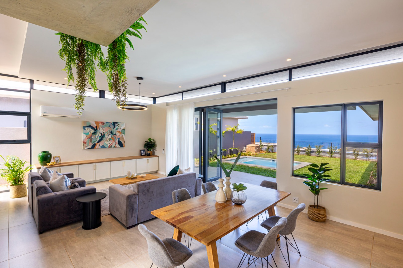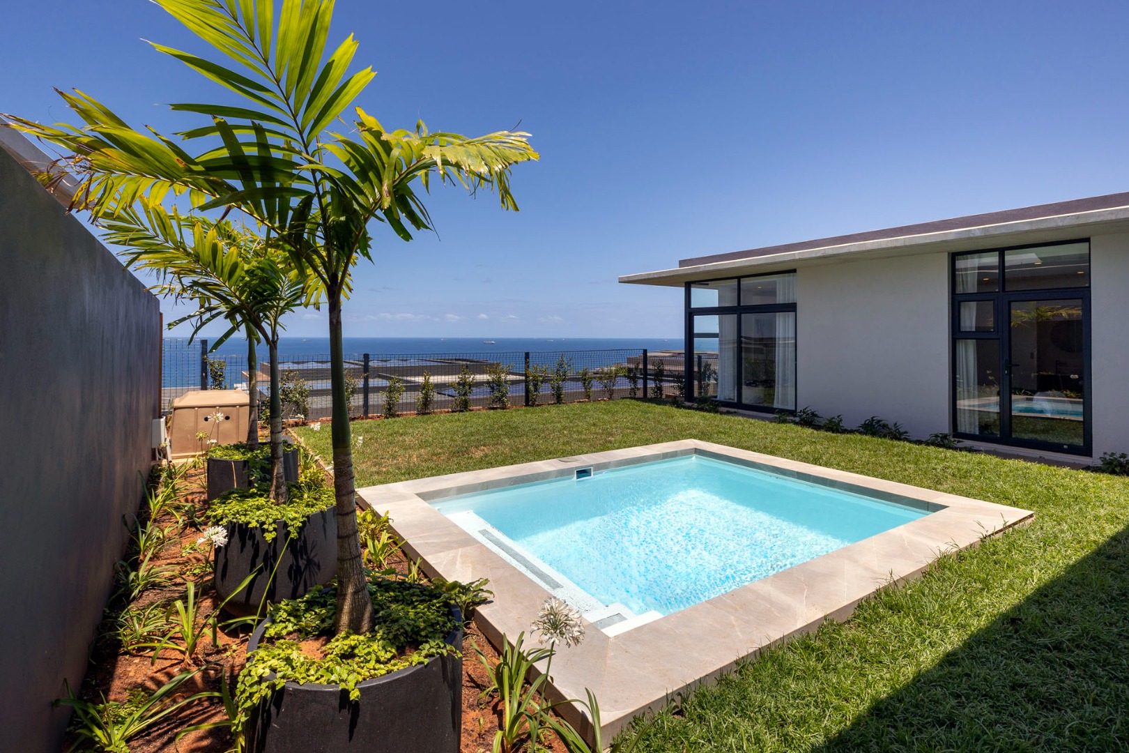 The open plan kitchen, dining room and lounge, flow effortlessly onto the entertainment area, with garden and pool and spectacular sea views. There is a second sunken TV lounge or chilling space, plus a built in study desk. The kitchen has a spacious scullery, leading onto a utility courtyard. Walls of the guest toilet and several other walls have been adorned with beautiful wallpaper and there is a custom-made TV unit as well as work station table and drawers built in to the home.