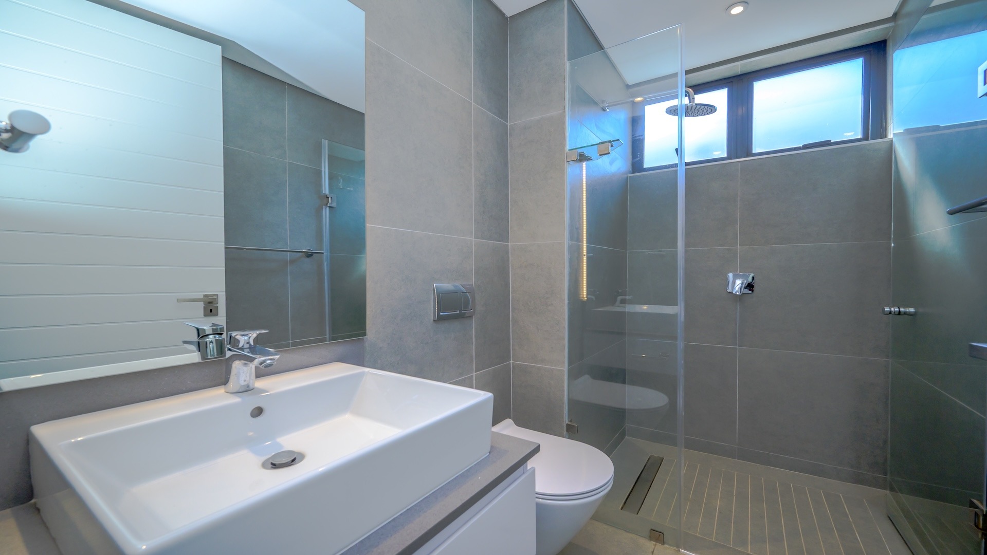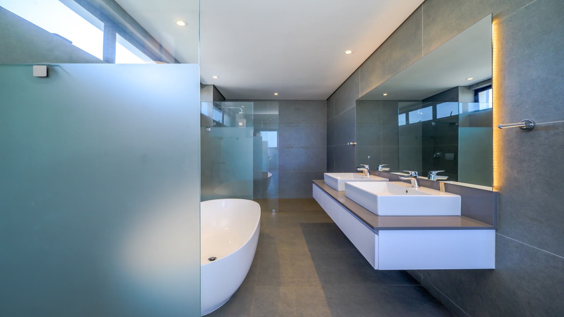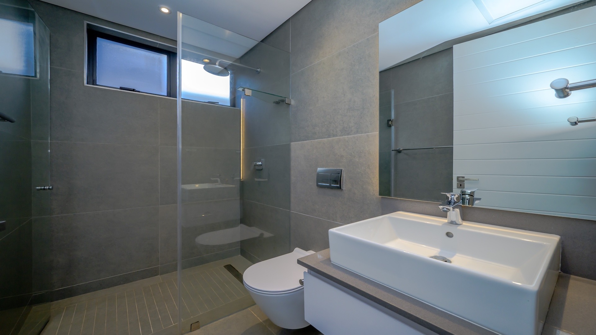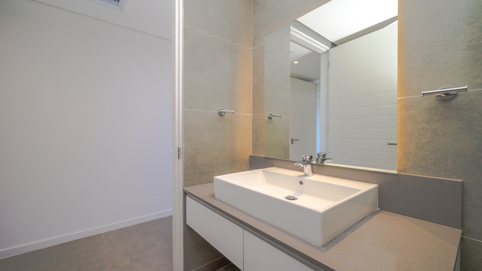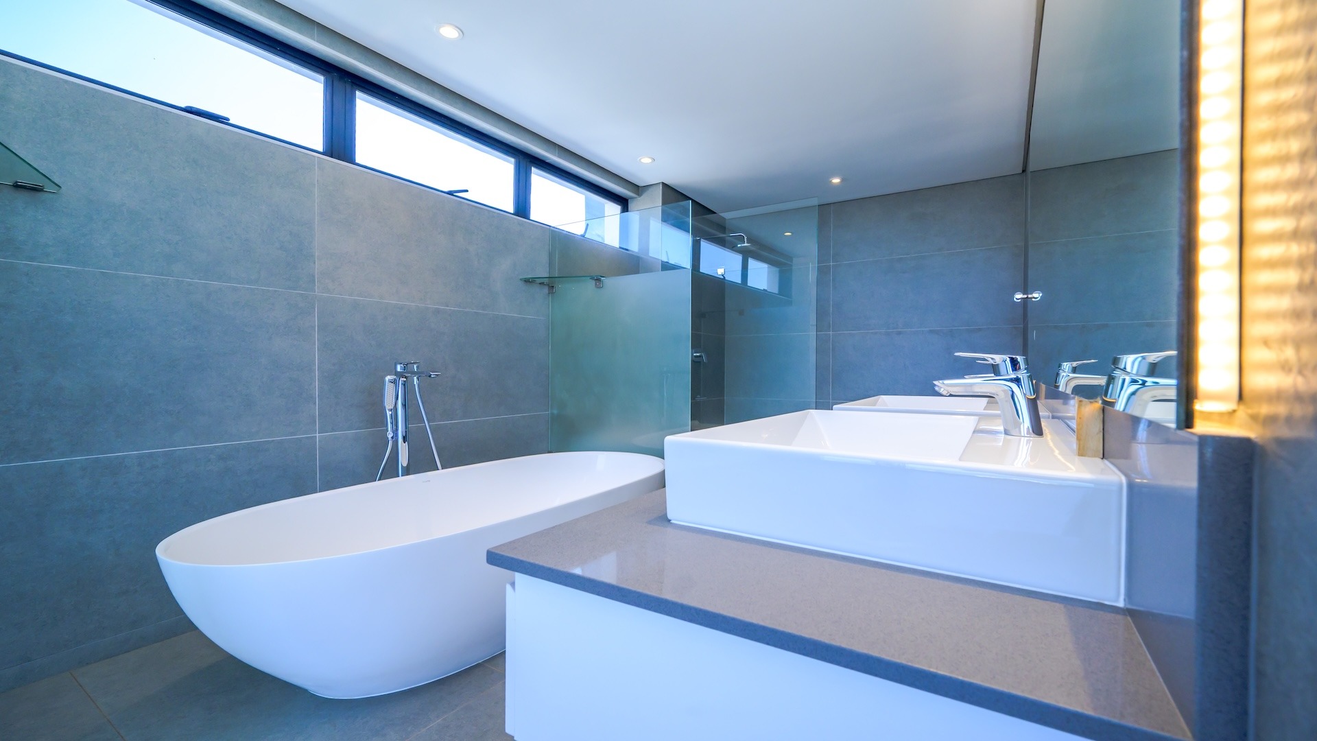 This spacious brand new four-bedroom villa has sweeping 180-degree sea views from every room and is conveniently accessed directly from the three-car garage. There is an additional open parking bay.
