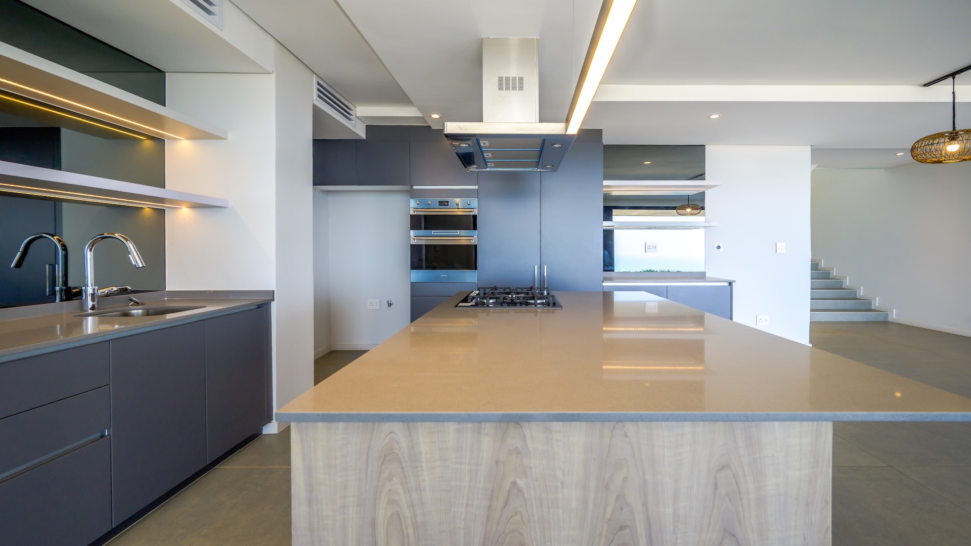 There is ducted air-conditioning throughout the unit, which is climate controlled per room, adjustable from an iPhone. The high-quality finishes include Smeg appliances and Hans Grohe sanware.