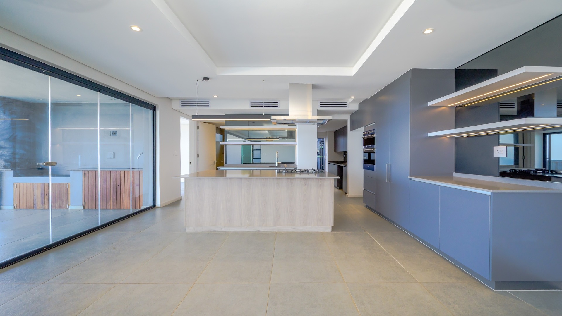 There are three en-suite bedrooms upstairs as you enter, plus a pyjama lounge … all leading onto a covered patio. The large glass windows and stack-back doors let in maximum light as well as breathtaking ocean views. The main en-suite bedroom has an open plan bathroom, plenty of cupboards and an adjacent study area.