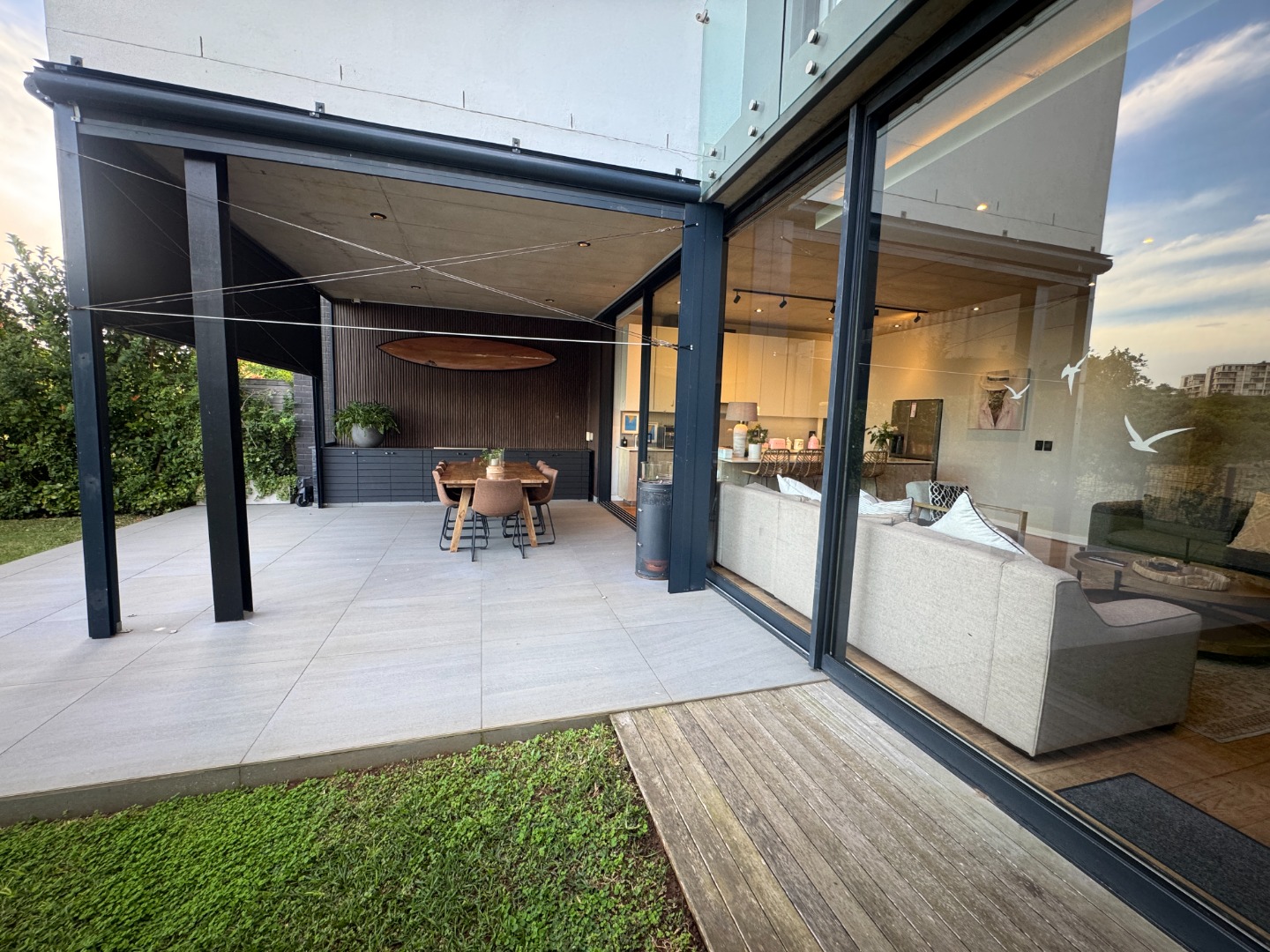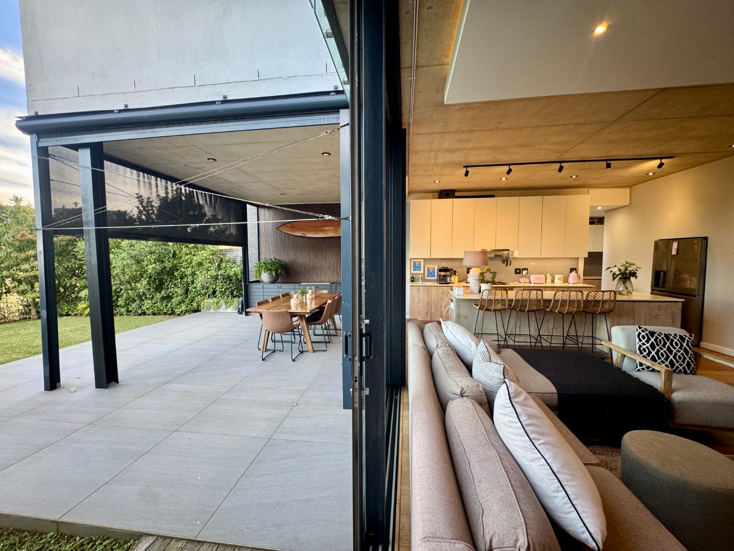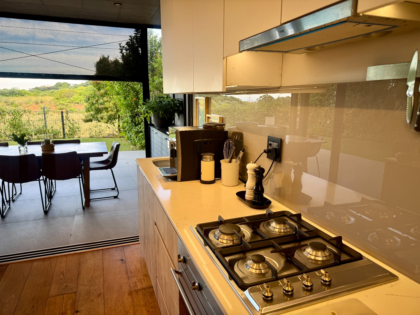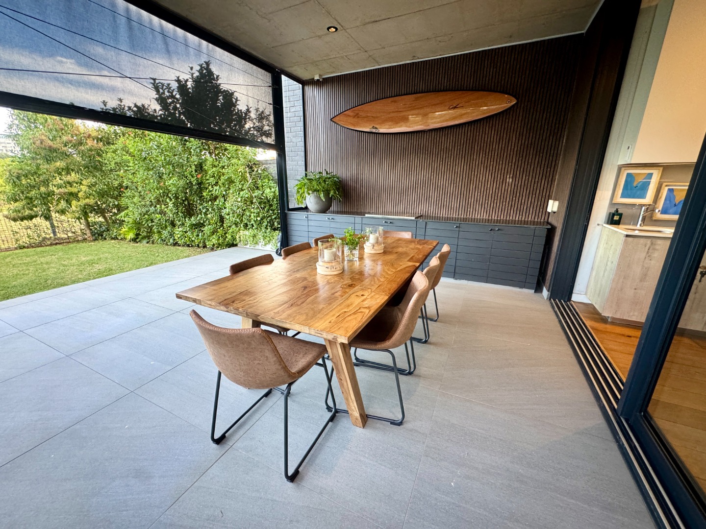 The open plan kitchen, dining room and lounge flow onto a covered patio with built-in braai and established garden.