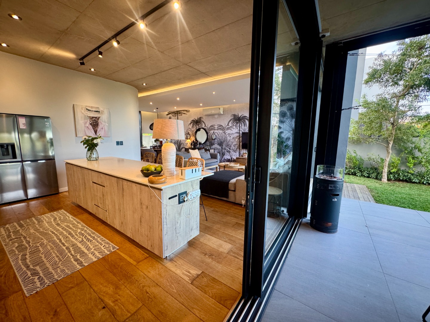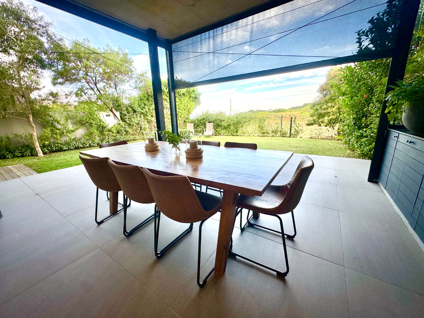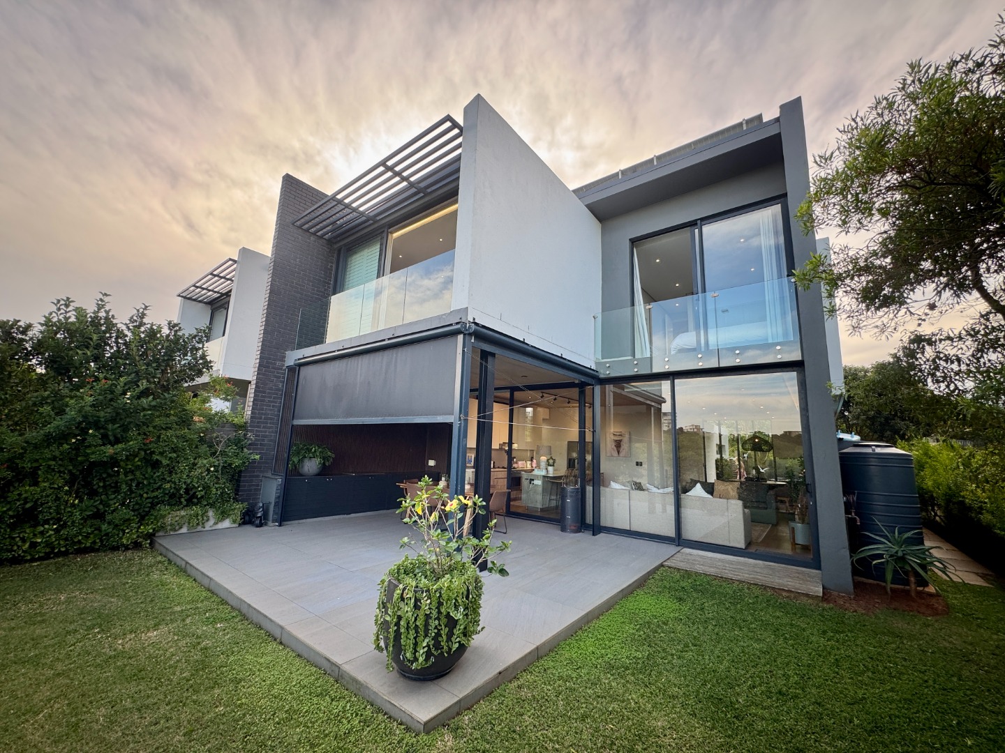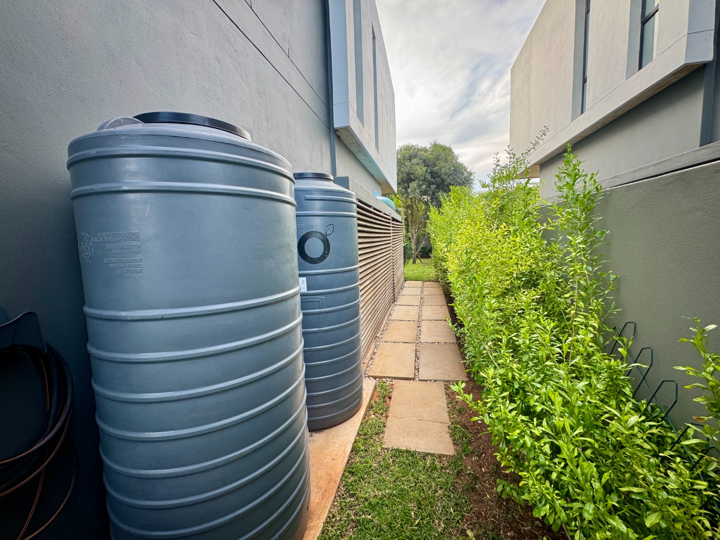 The pet-friendly unit has front and back gardens with enough space for a swimming pool, although there is a 25 metre lap pool and family pool with waterslides, in the Estate. There is direct access to the unit from the double garage where there are 18 solar panels (reducing electricity consumption to approximately R500.00 per month), and an inverter with two 10kwh batteries.