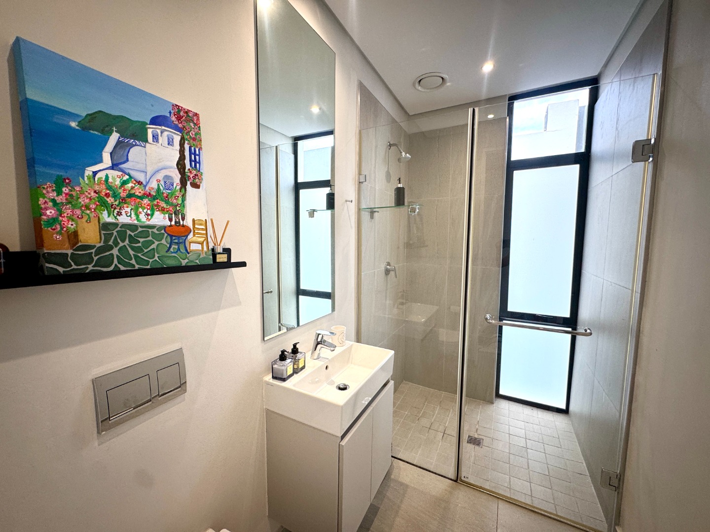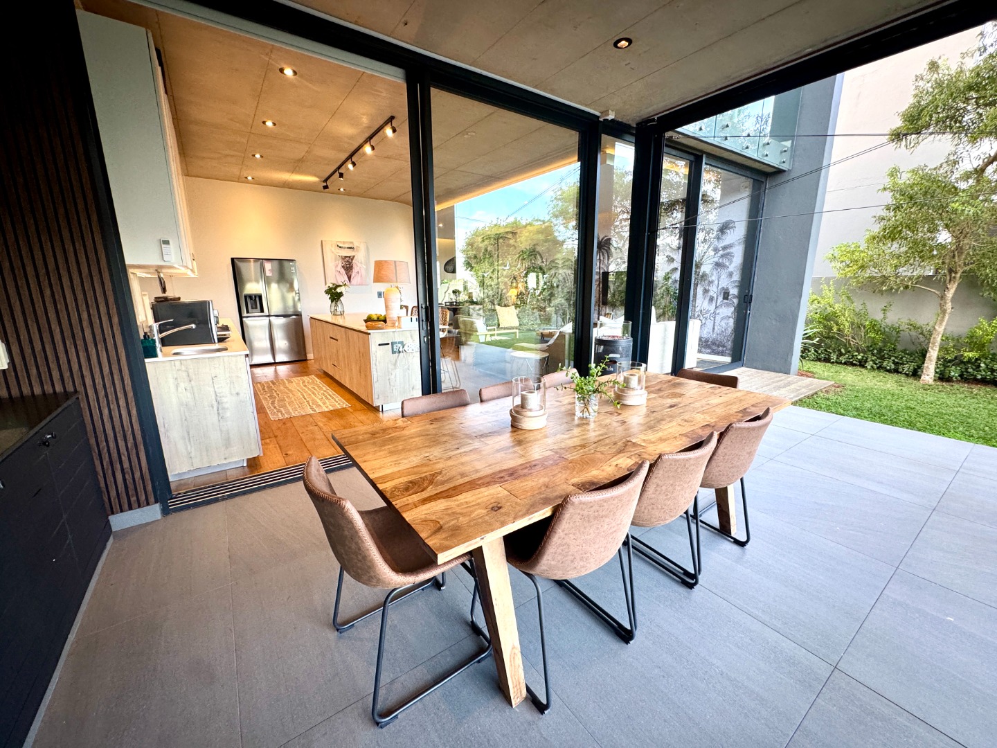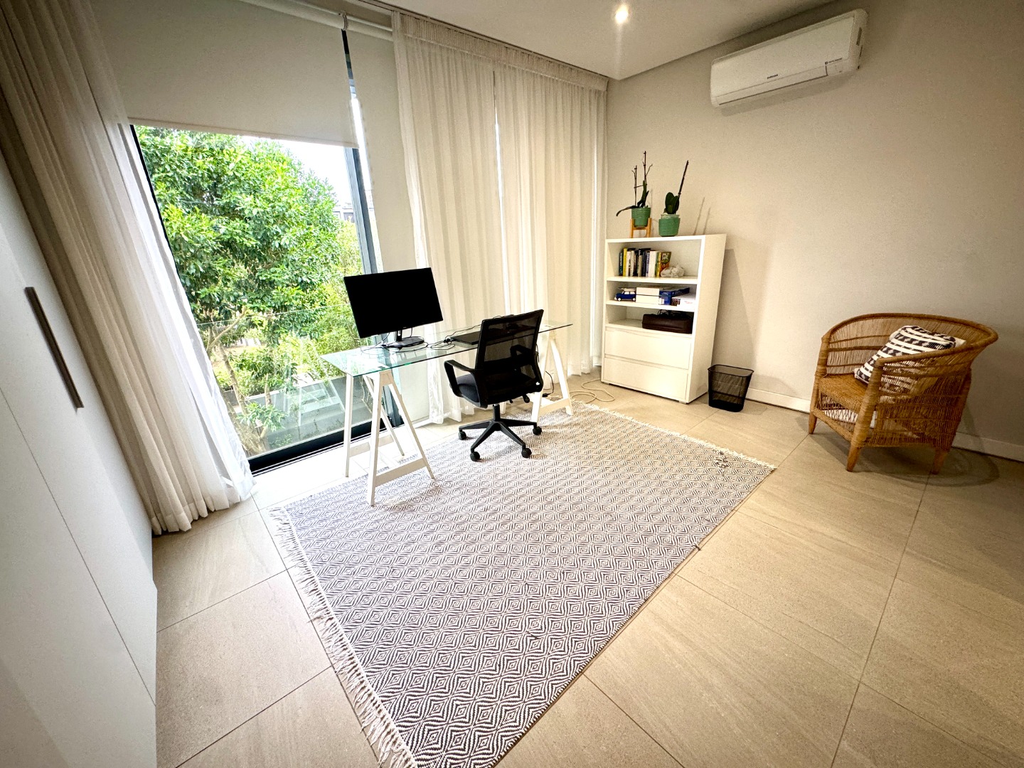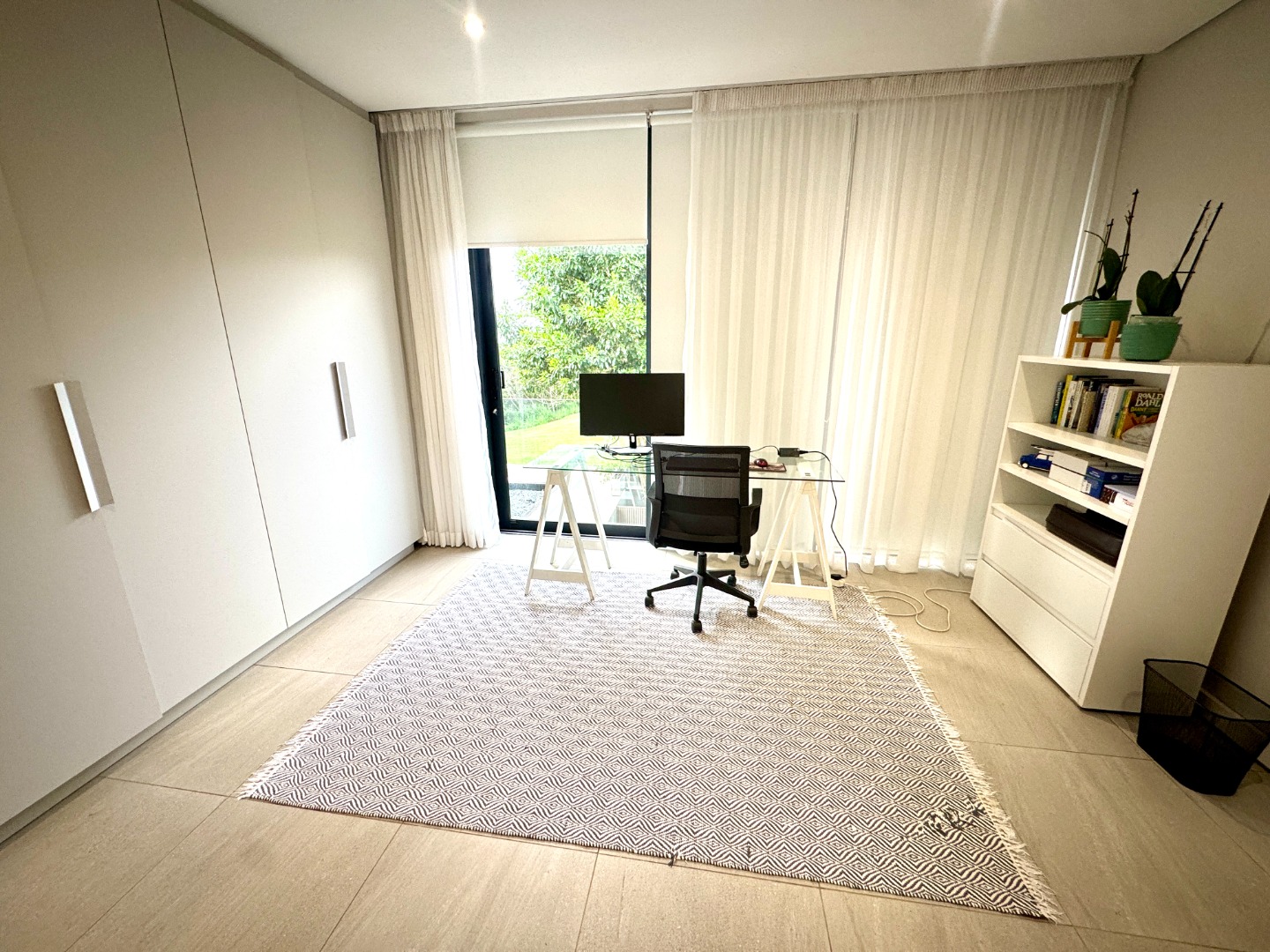 The pet-friendly unit has front and back gardens with enough space for a swimming pool, although there is a 25 metre lap pool and family pool with waterslides, in the Estate. There is direct access to the unit from the double garage where there are 18 solar panels (reducing electricity consumption to approximately R500.00 per month), and an inverter with two 10kwh batteries.