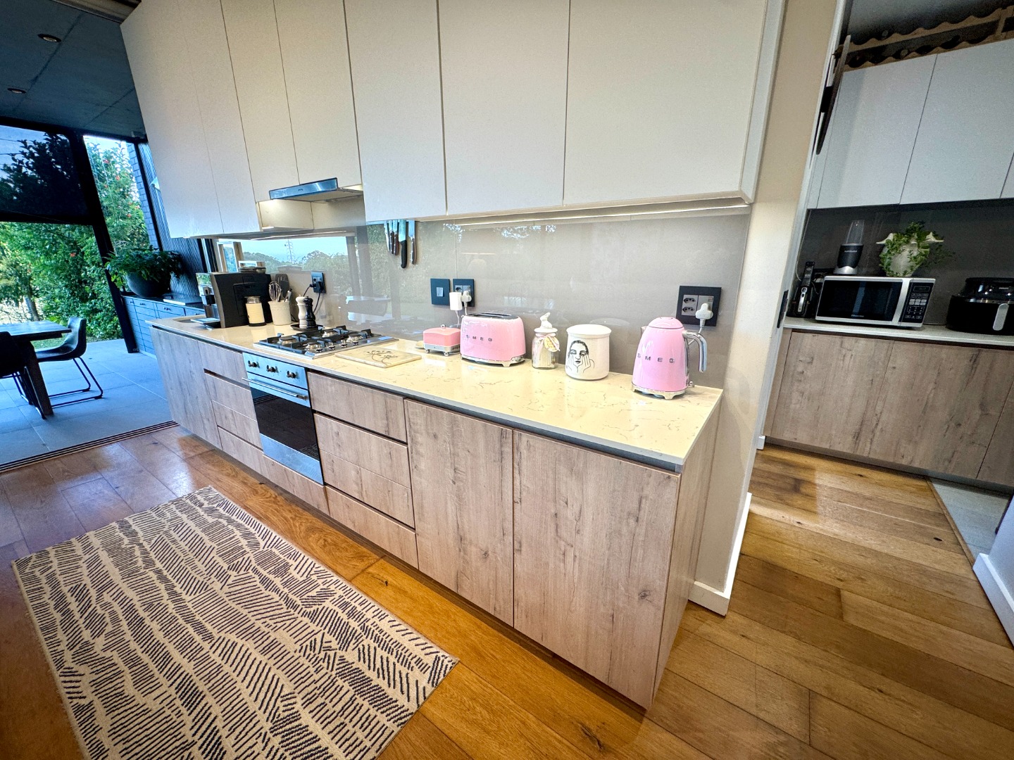 Upstairs are four well-sized bedrooms, each with their own bathroom. The main en-suite has a walk in dressing room. The bedroom has sliding doors and views of the dam and sea. The second bedroom also overlooks the dam and there are two additional north-facing en-suite bedrooms.