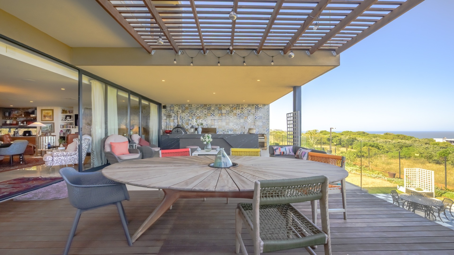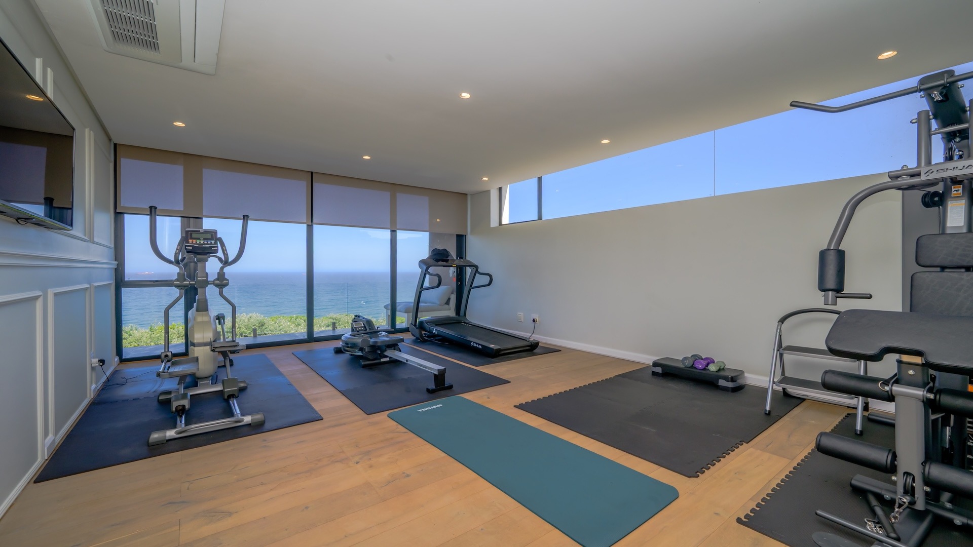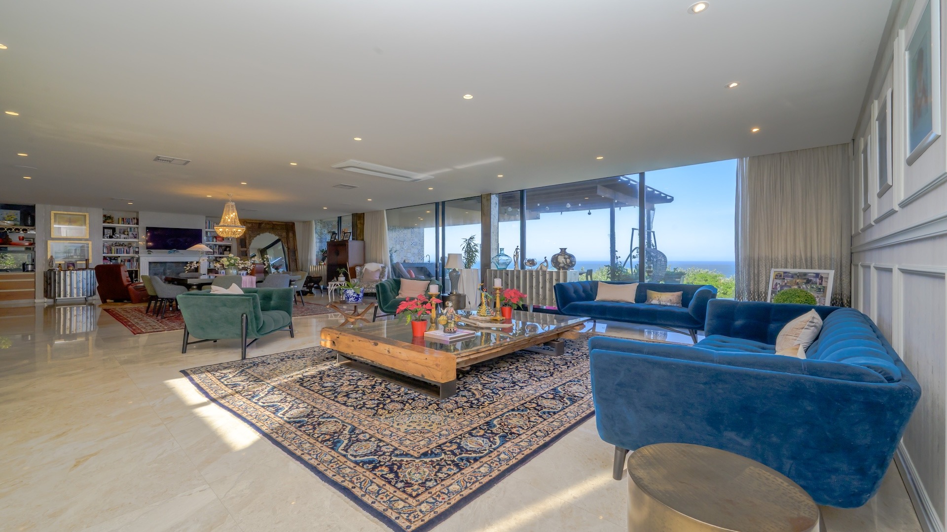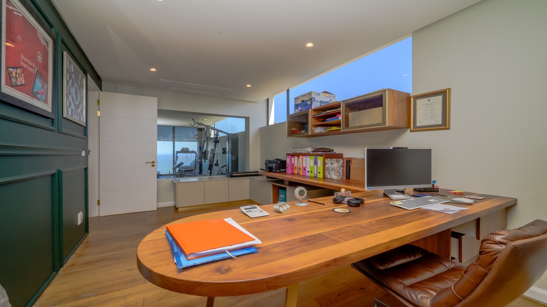 Ideal for a large family and effortless entertaining, the home spans three levels, designed around the glorious vistas, morning and afternoon light. The middle level forms the heart of the home, with the open plan kitchen, lounge and dining room flowing onto a massive patio with swimming pool, jacuzzi and uninterrupted sea views. There is a charcoal and a gas braai as well as a pizza oven. There is a cinema room, a guest toilet and an en-suite bedroom, leading onto the patio. There is direct access to the home from the triple garages to the pantry and scullery. The wide driveway offers additional open parking.