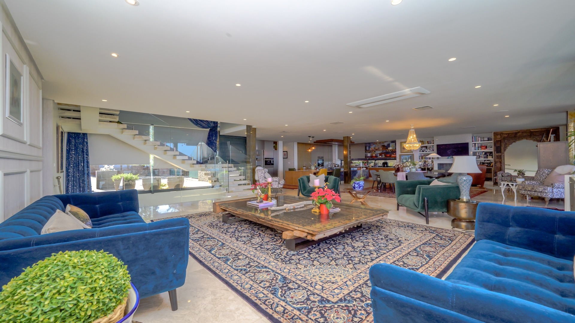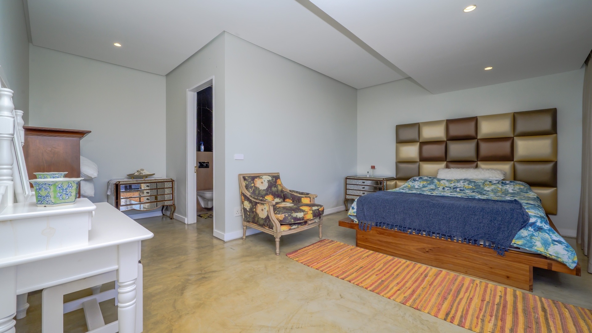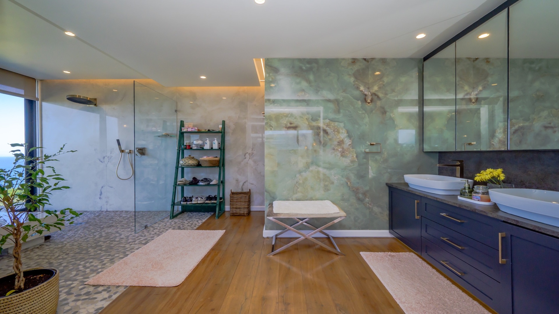 Ideal for a large family and effortless entertaining, the home spans three levels, designed around the glorious vistas, morning and afternoon light. The middle level forms the heart of the home, with the open plan kitchen, lounge and dining room flowing onto a massive patio with swimming pool, jacuzzi and uninterrupted sea views. There is a charcoal and a gas braai as well as a pizza oven. There is a cinema room, a guest toilet and an en-suite bedroom, leading onto the patio. There is direct access to the home from the triple garages to the pantry and scullery. The wide driveway offers additional open parking.