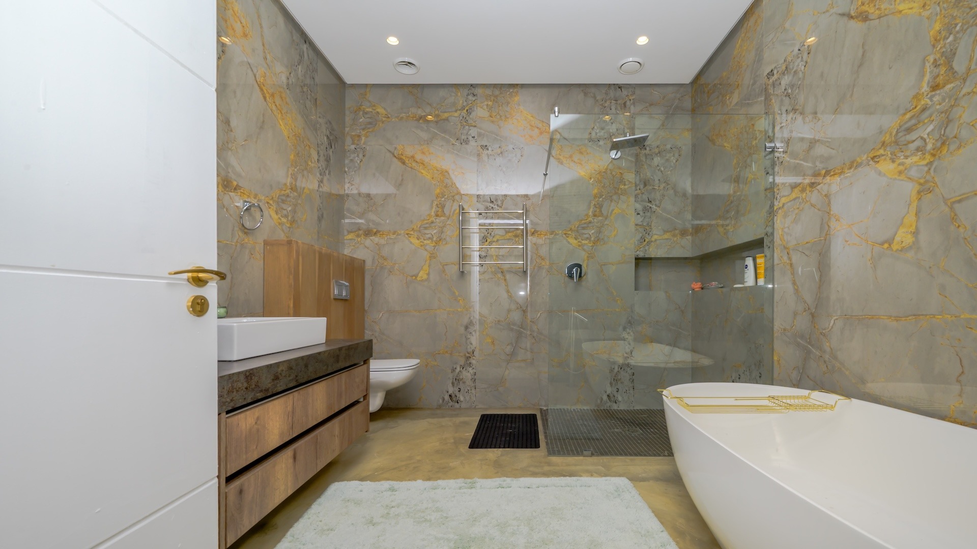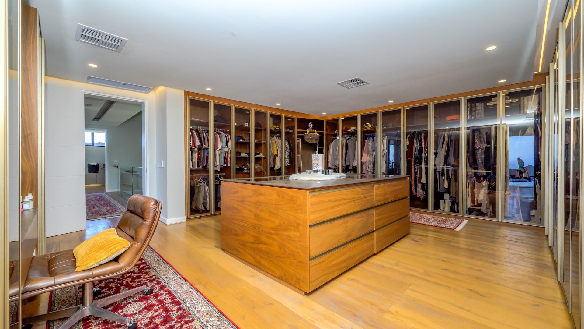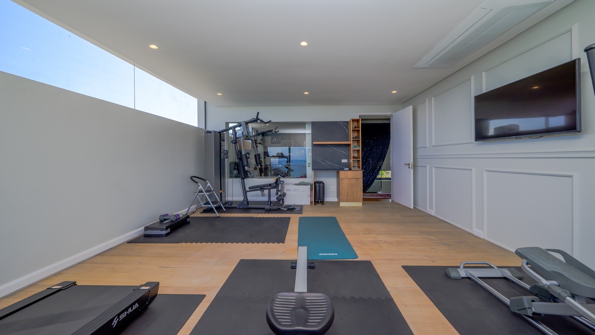 The top level is home to a spacious, luxurious main-ensuite bedroom with grand dressing room and stylish bathroom with bath, rain shower and separate toilet. There are also a sea-facing gym and study on this level.